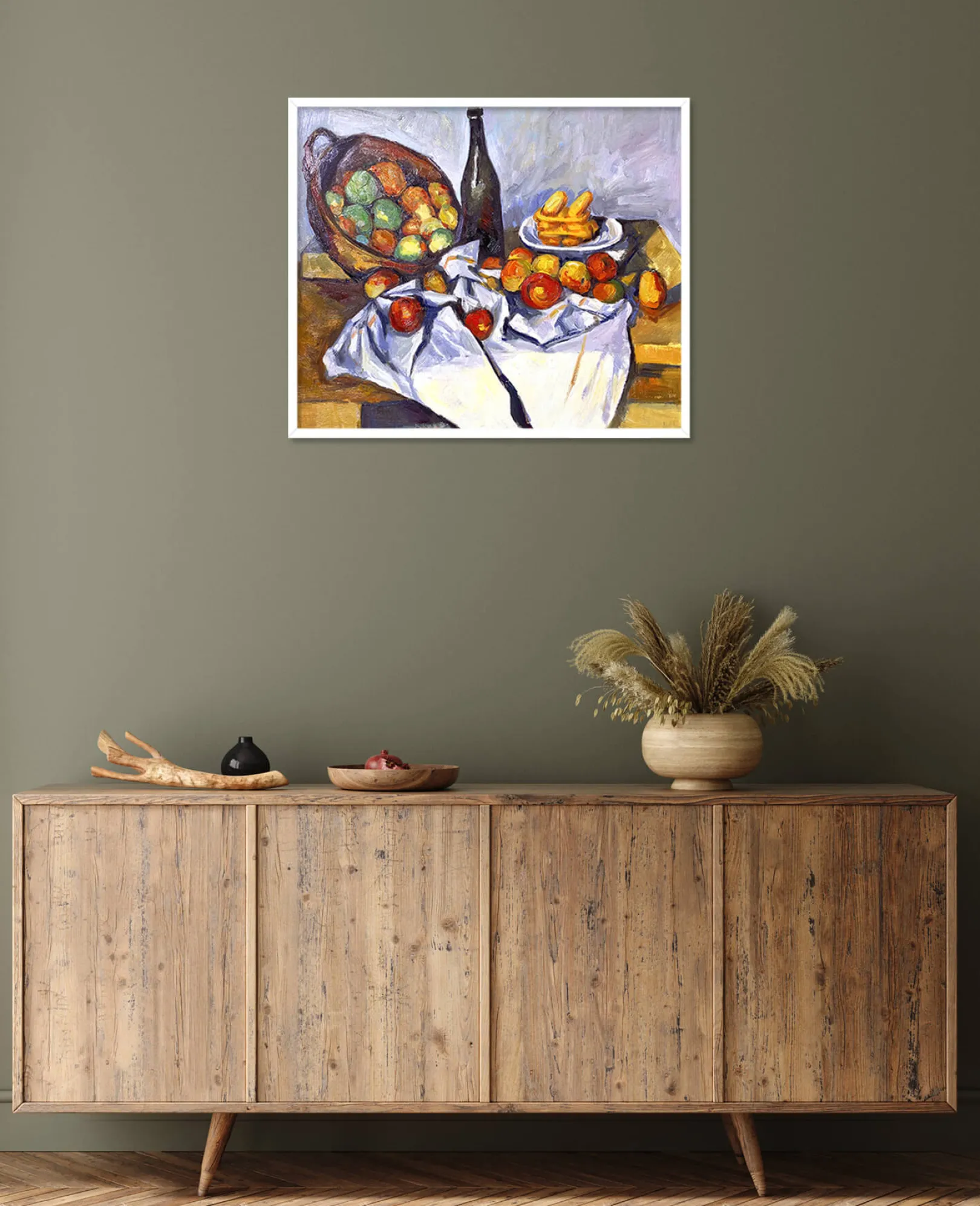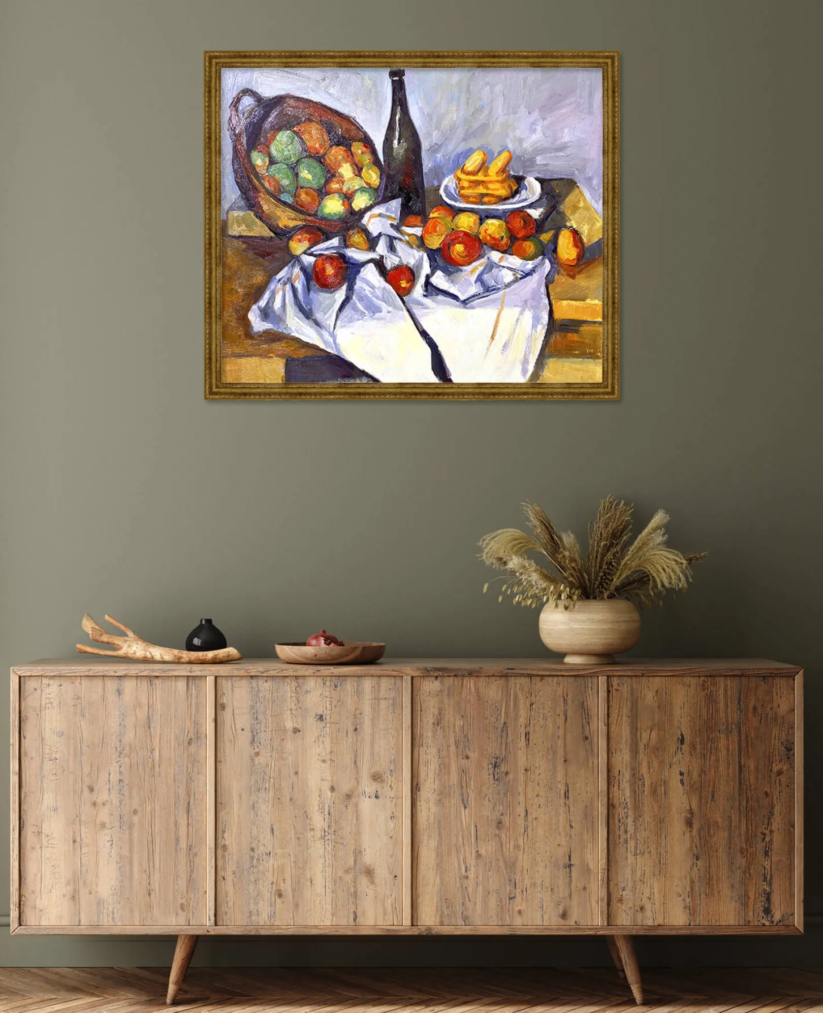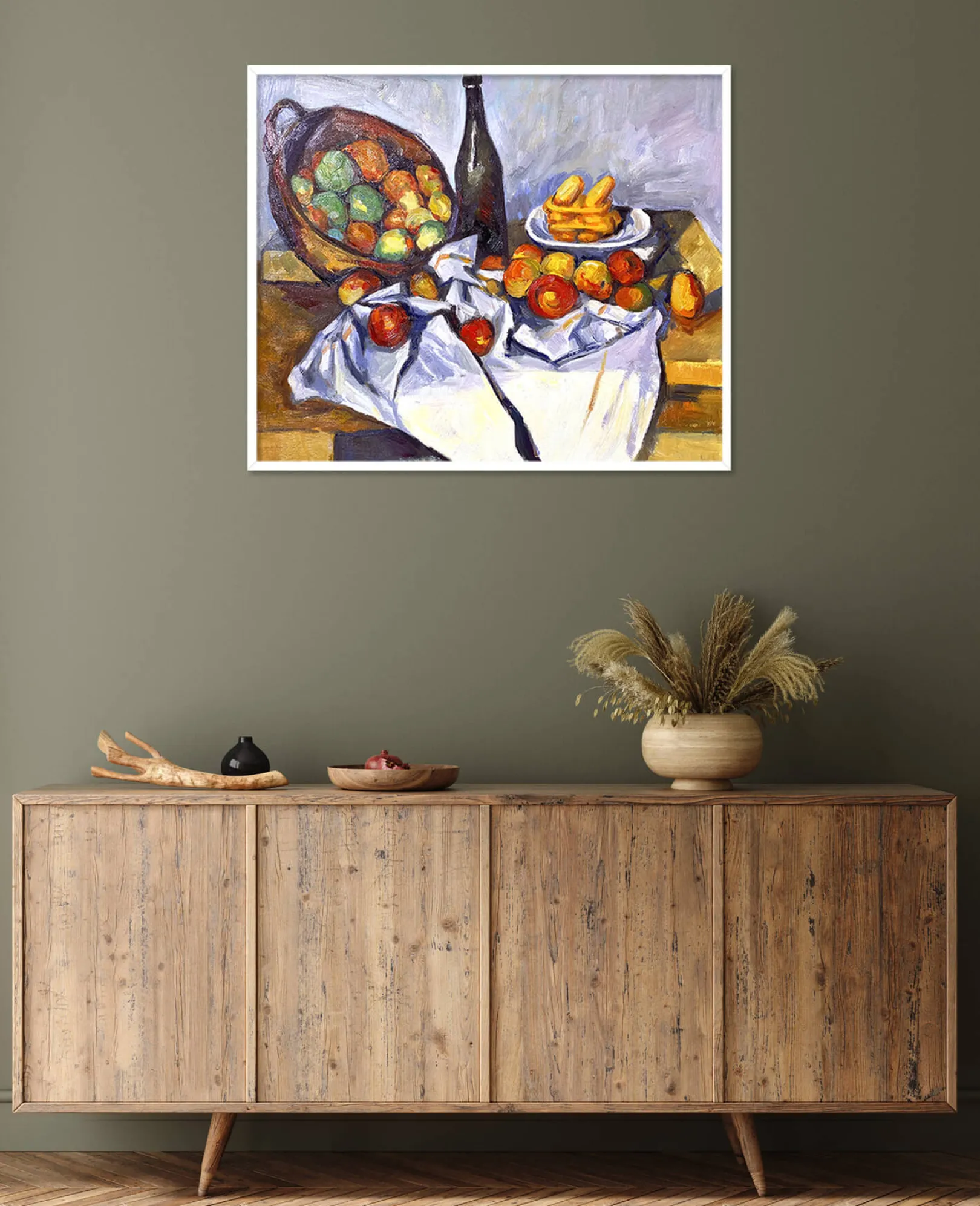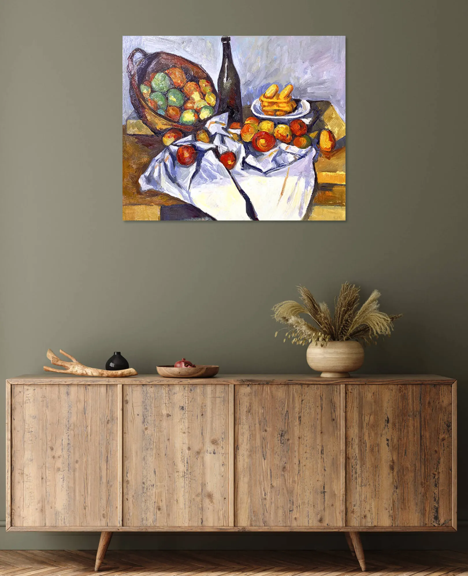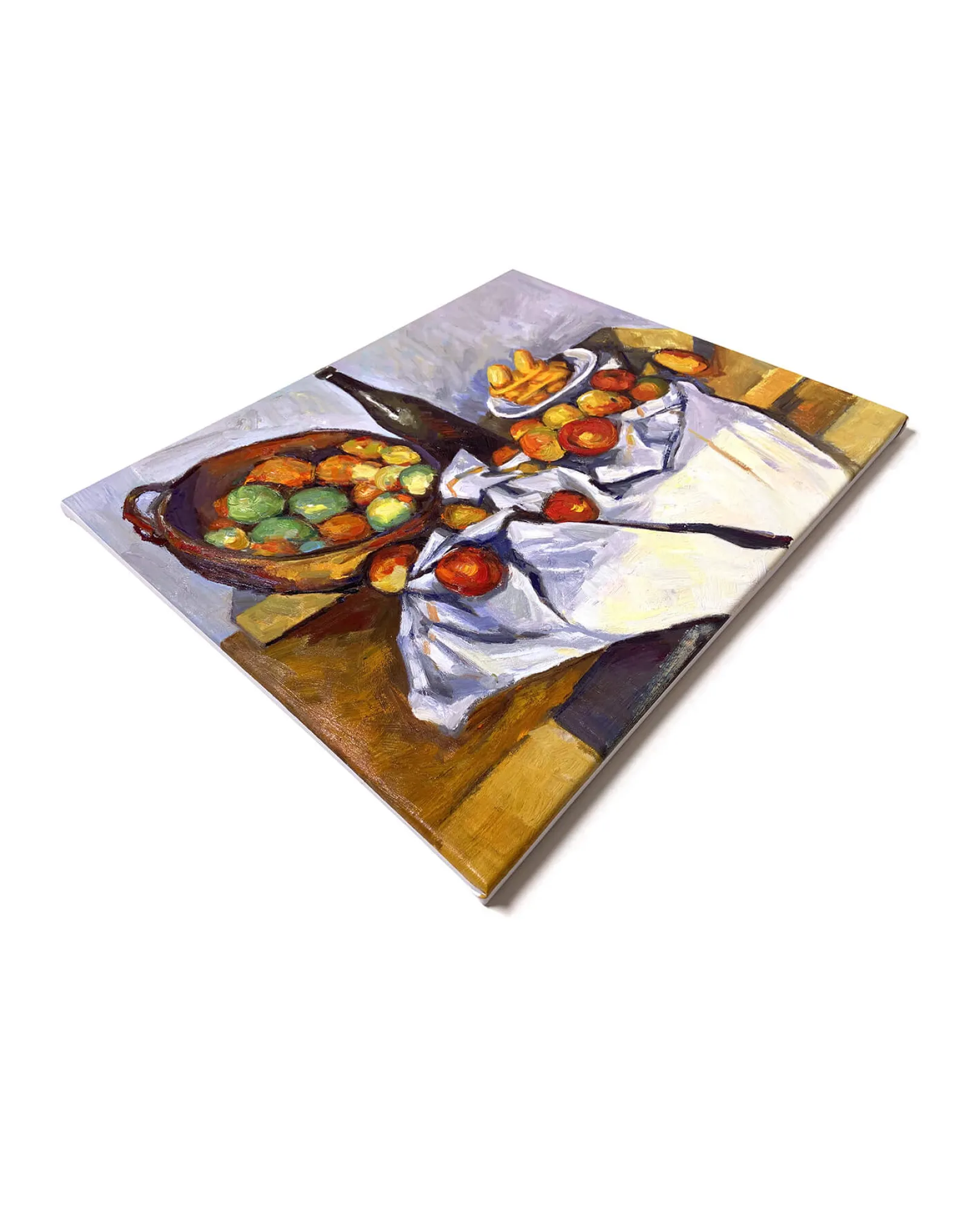 Dieses Gemälde gehört zu einer langen Reihe von Stillleben, die Paul Cézanne im Laufe seines künstlerischen Lebens geschaffen hat. Es stellt den Alltag in einem Haushalt der damaligen Zeit dar. Beim Betrachten des Bildes ist es jedoch schwer zu erkennen, ob es sich bei der gezeichneten Frucht wirklich um einen Apfel handelt, der mit Pfirsichen verwechselt werden könnte.& Ein weiteres Bild aus dieser Serie des Künstlers ist Vorhang, Krug und Kompostierer.