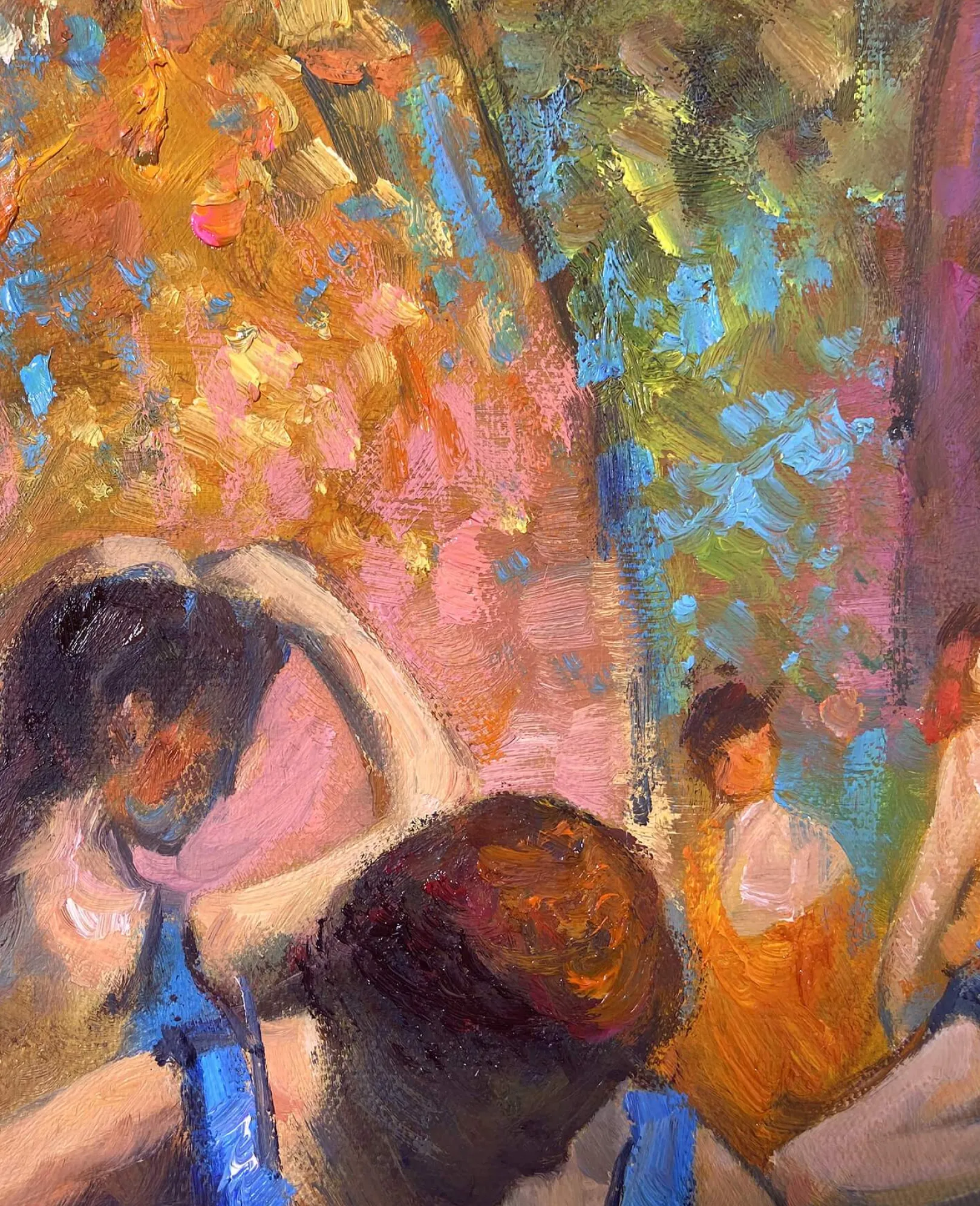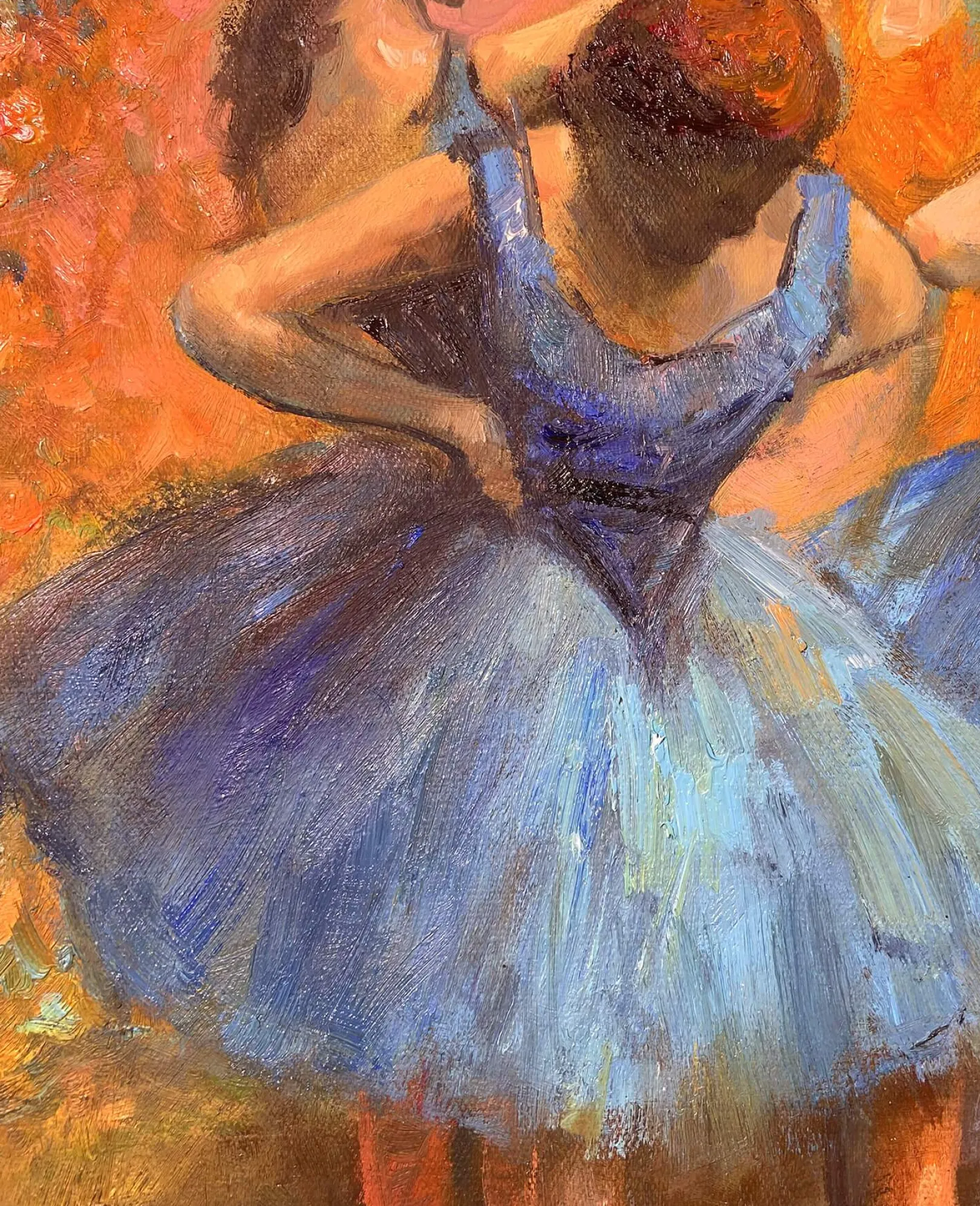 Dieses Werk von Edgar Degas enthüllt einen Moment, der den Zuschauern eigentlich verborgen bleiben sollte, bevor sich der Vorhang hebt. In einem farbenfrohen und hellen Dekor hält sich der Künstler bei den alltäglichen Gesten der Tänzerinnen auf, die sich auf die Bühne vorbereiten: das Anpassen der Bluse, der letzte Schliff an der Frisur, Aufwärmübungen…. Ein realer Moment wird so auf einem Gemälde voller Leben und Bewegung verewigt.& In seiner Serie der Tänzerinnen finden wir auch Tänzerinnen in Rosa, Ballerinas, die ihre Kleider anpassen, und Tänzerinnen in Rosa und Grün.