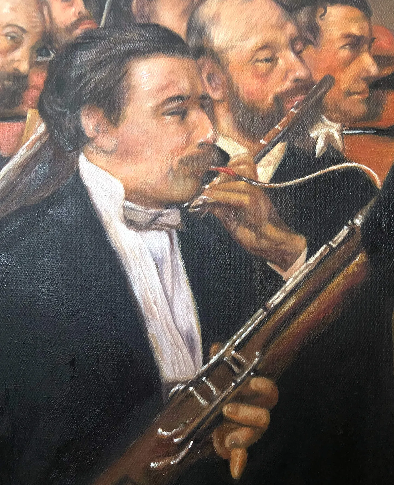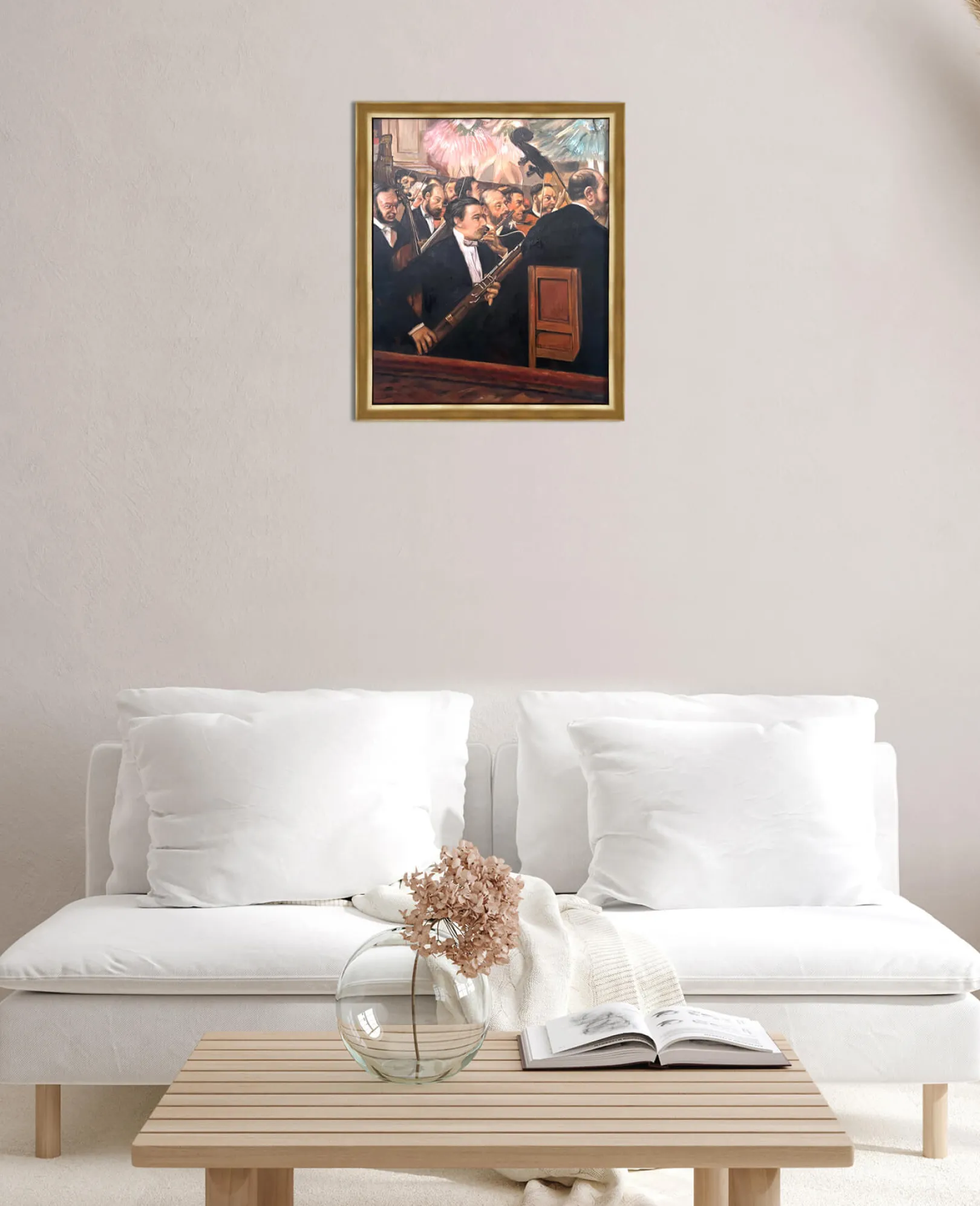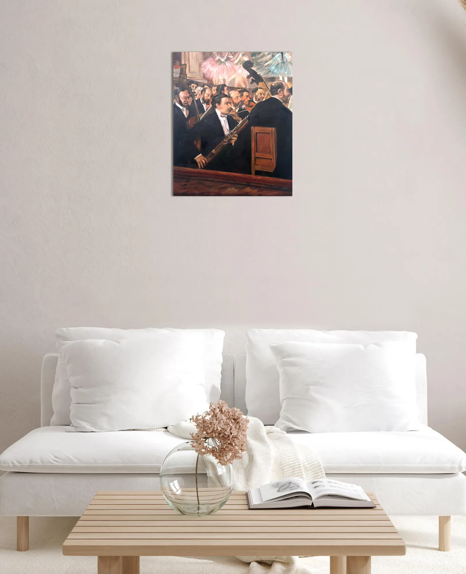 Als Edgar Degas dieses Bild malte, kannte er die Pariser Oper gut. Man würde sich jedoch täuschen, wenn man glaubte, in diesem Gemälde eine realistische Darstellung des Orchesters der Pariser Oper im Jahr 1870 zu sehen. Abgesehen davon, dass mehrere der abgebildeten Personen keine Instrumentalisten waren, setzte Degas, um seinen Freund, den Fagottisten Désiré Dihau, hervorzuheben, diesen in die erste Reihe, während das Fagott normalerweise hinter den Celli und Kontrabässen platziert wurde. Eine ebenso bewusste Änderung wie der sehr originelle Bildausschnitt des Gemäldes, der das Orchester von schräg oben zeigt und von den Tänzerinnen nur die Beine und die Tutus zeigt.