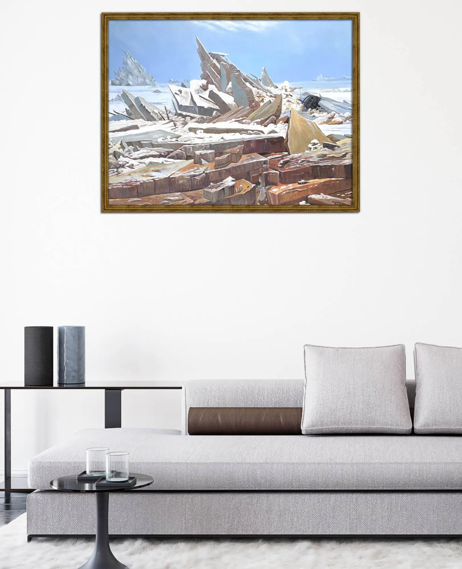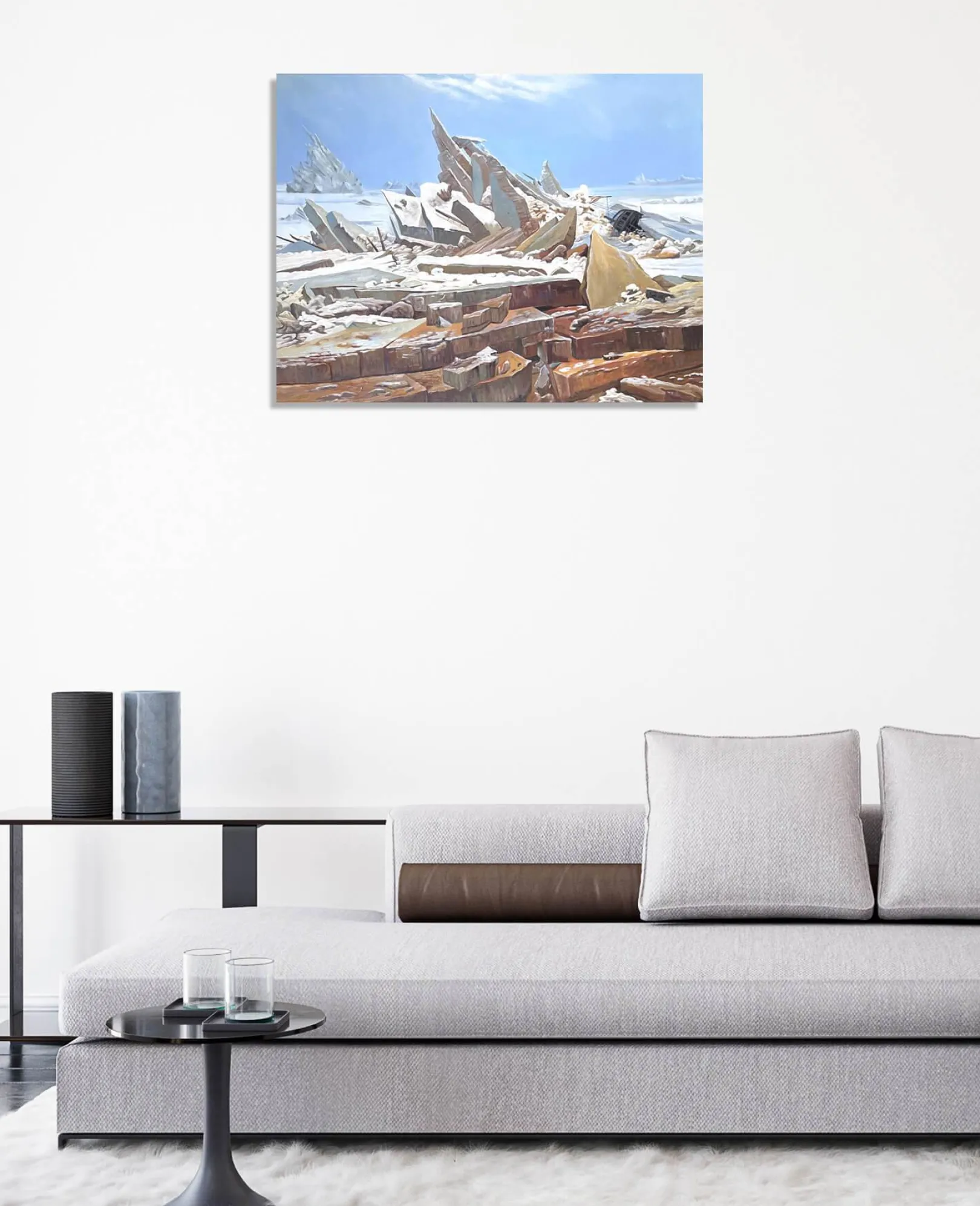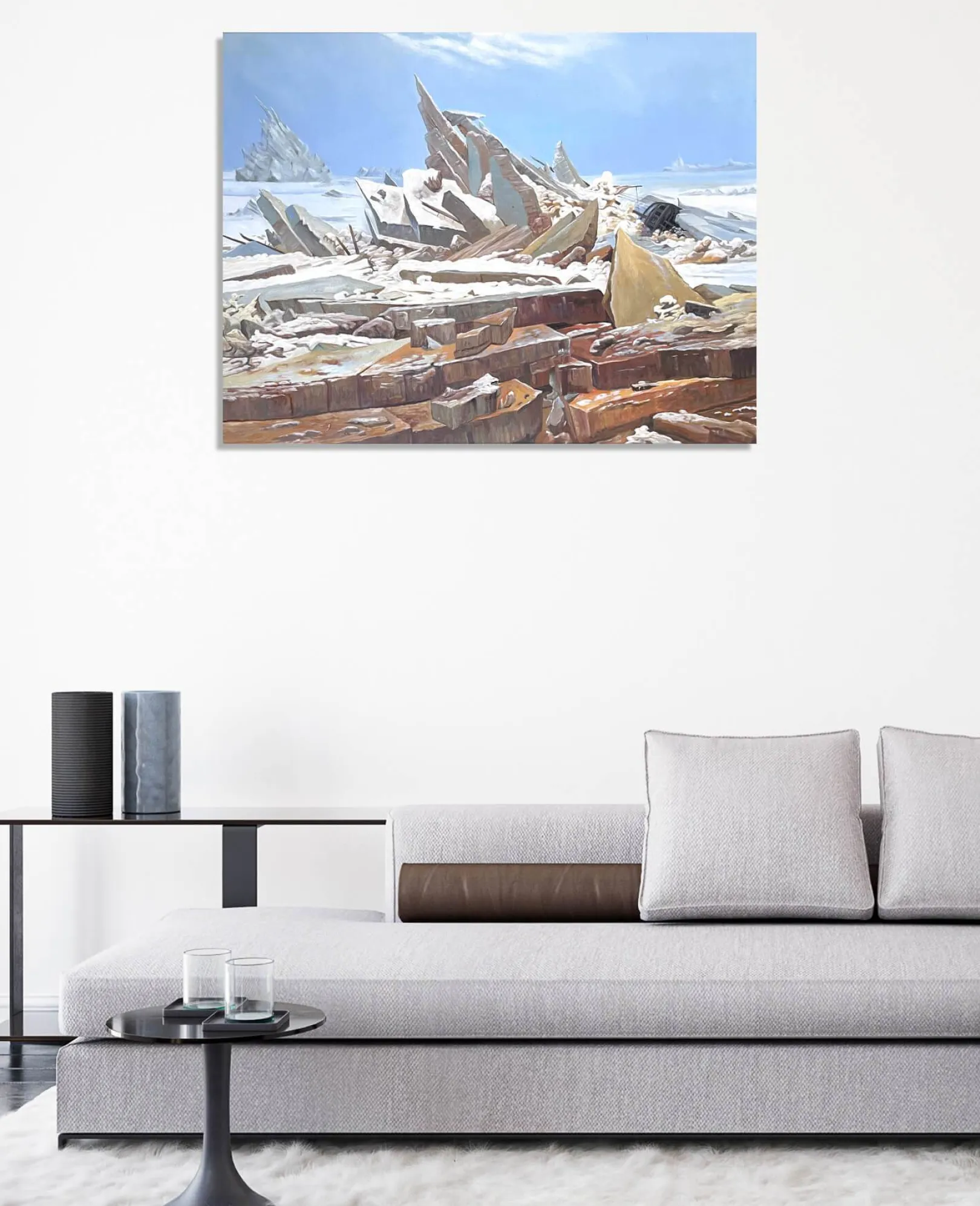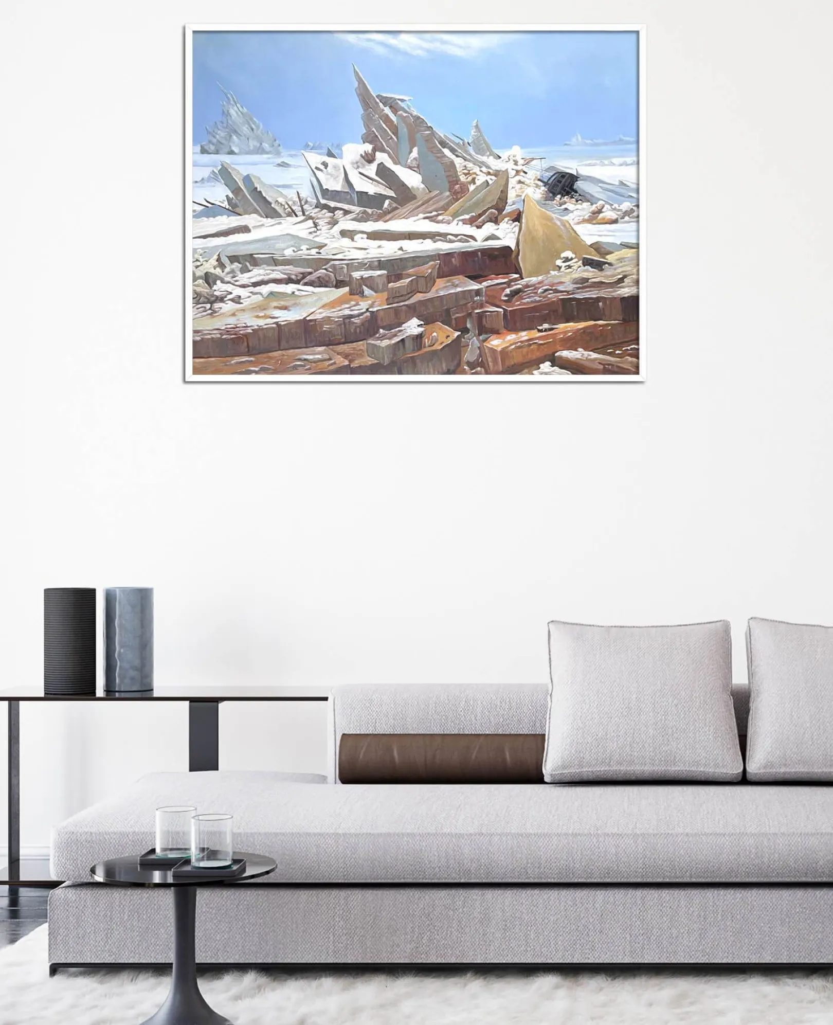 Caspar David Friedrich liebt es, die Natur in all ihrer Pracht zu malen, doch dieses Gemälde unterstreicht ihre gefährliche und unerbittliche Seite. Das tosende Eismeer, das in imposante, spitze und vorspringende Blöcke zerteilt ist, zeigt eine wilde und unnachgiebige Macht. Das Auge verweilt auf der Schönheit der Farben und den Details, die durch Lichtakzente fein hervorgehoben werden, und vergisst dabei fast das unglückselige Schiff, dessen Untergang diesen prächtigen Aufruhr verursachte.& Friedrich ist ein leidenschaftlicher Verfechter epischer Landschaftsdarstellungen, die wir auch in Der Wanderer, ein Wolkenmeer betrachtend und Der Watzmann sehen.
