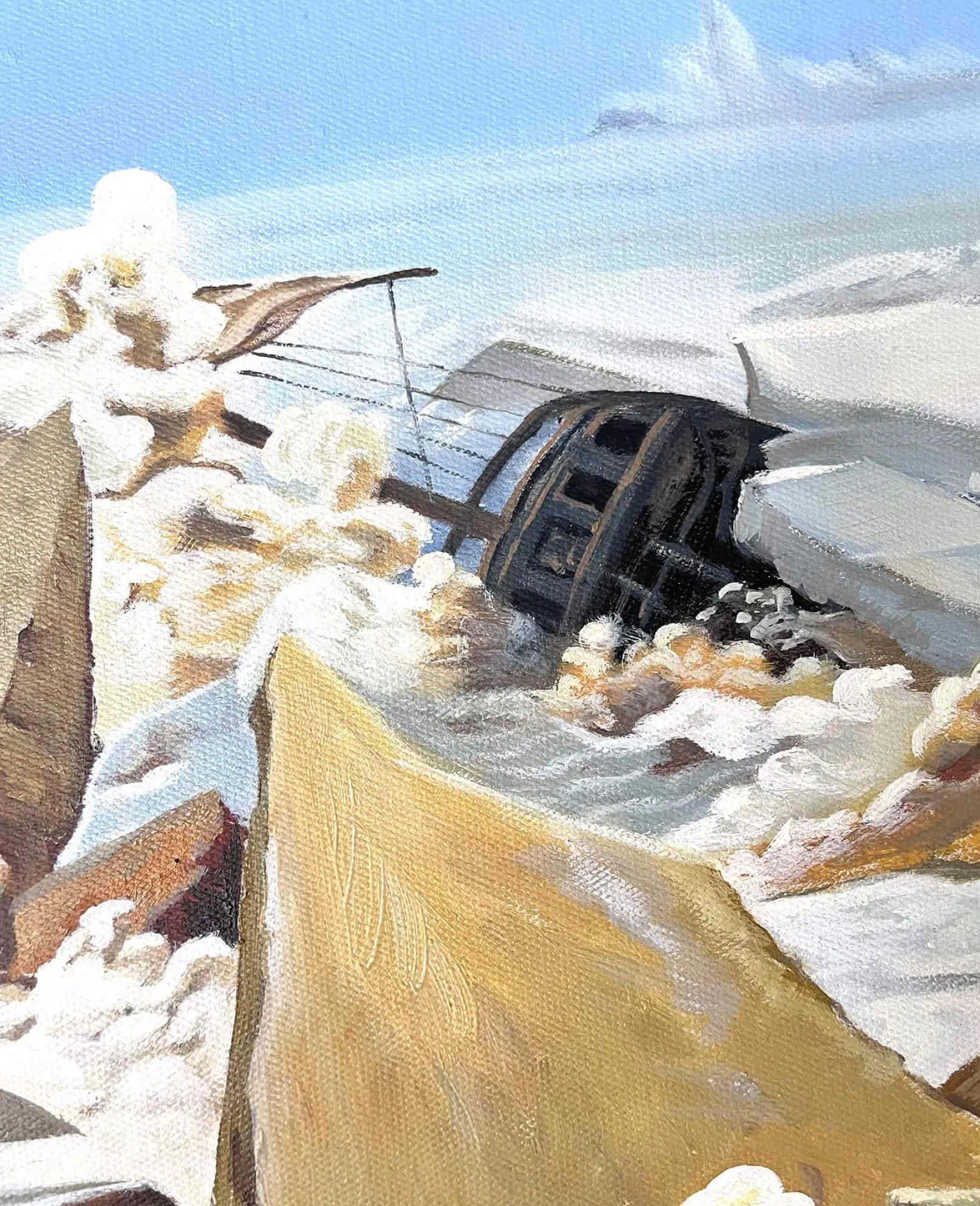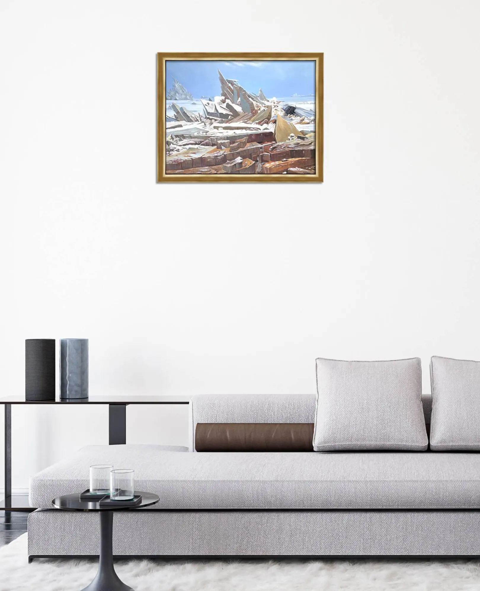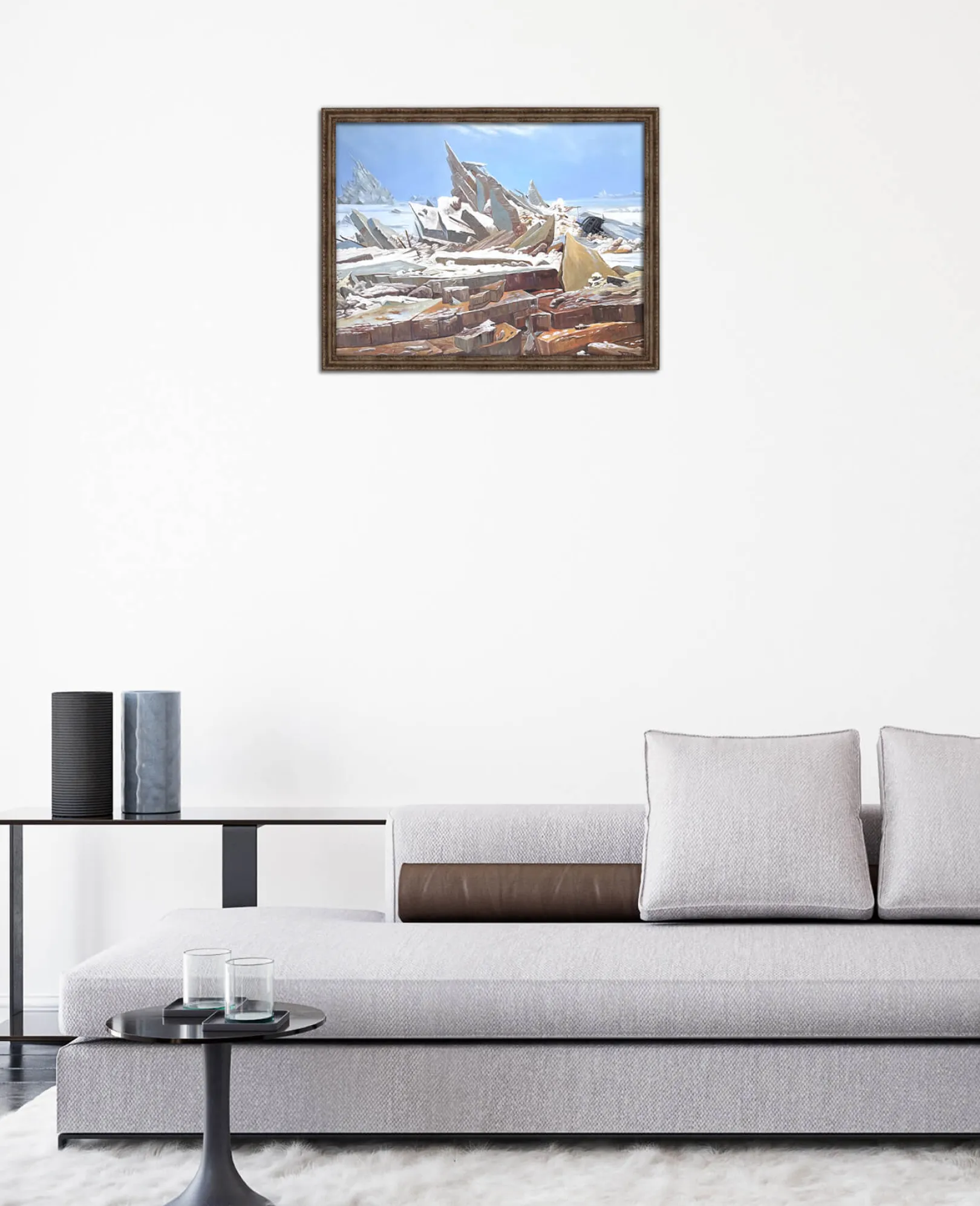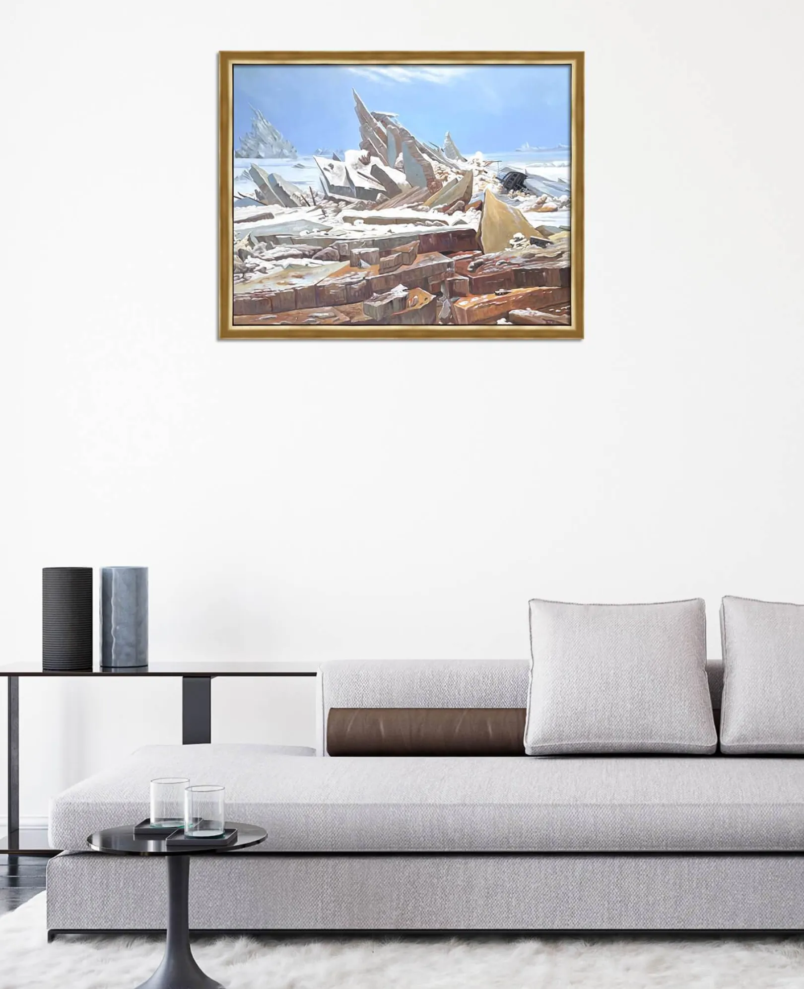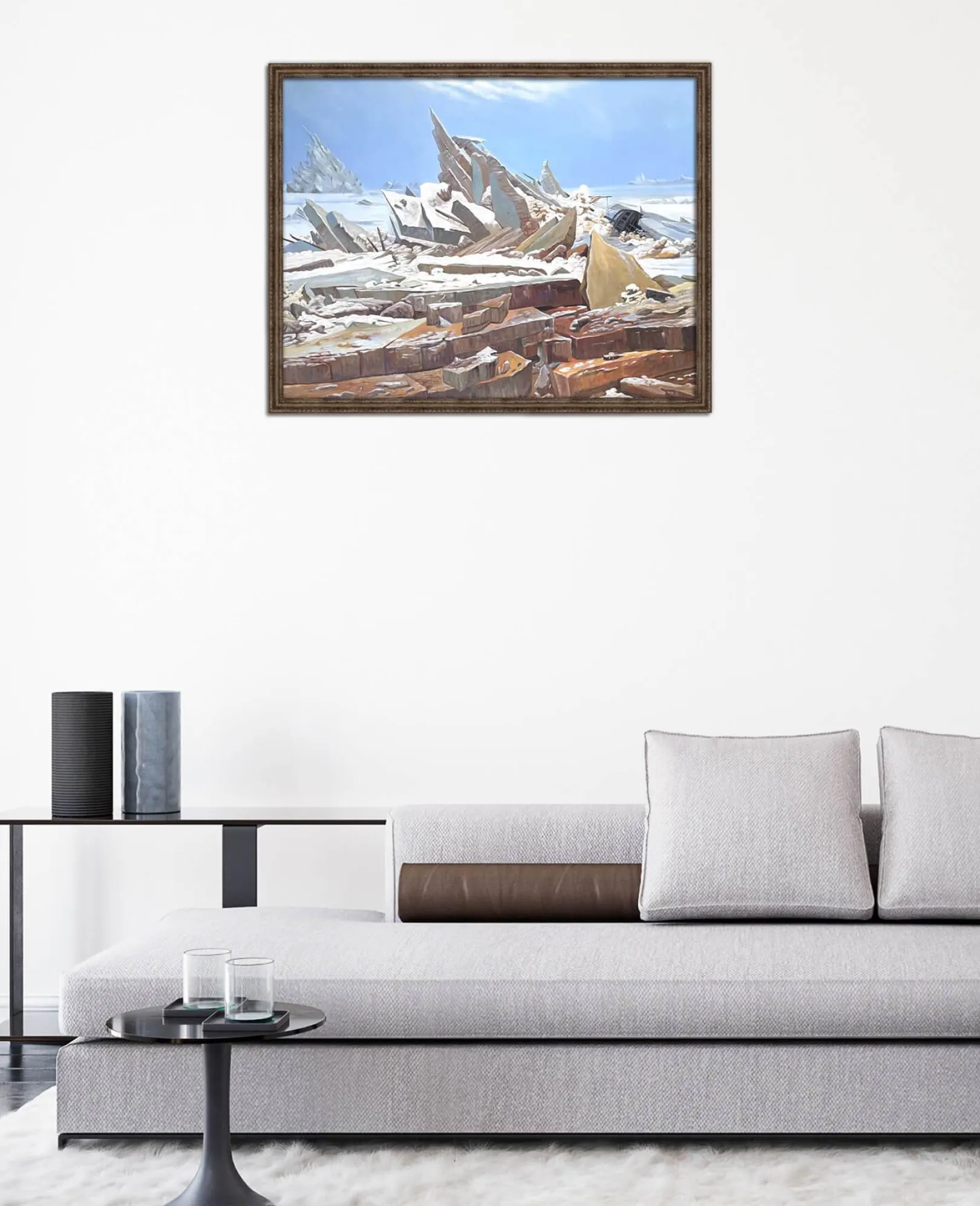 Caspar David Friedrich liebt es, die Natur in all ihrer Pracht zu malen, doch dieses Gemälde unterstreicht ihre gefährliche und unerbittliche Seite. Das tosende Eismeer, das in imposante, spitze und vorspringende Blöcke zerteilt ist, zeigt eine wilde und unnachgiebige Macht. Das Auge verweilt auf der Schönheit der Farben und den Details, die durch Lichtakzente fein hervorgehoben werden, und vergisst dabei fast das unglückselige Schiff, dessen Untergang diesen prächtigen Aufruhr verursachte.& Friedrich ist ein leidenschaftlicher Verfechter epischer Landschaftsdarstellungen, die wir auch in Der Wanderer, ein Wolkenmeer betrachtend und Der Watzmann sehen.