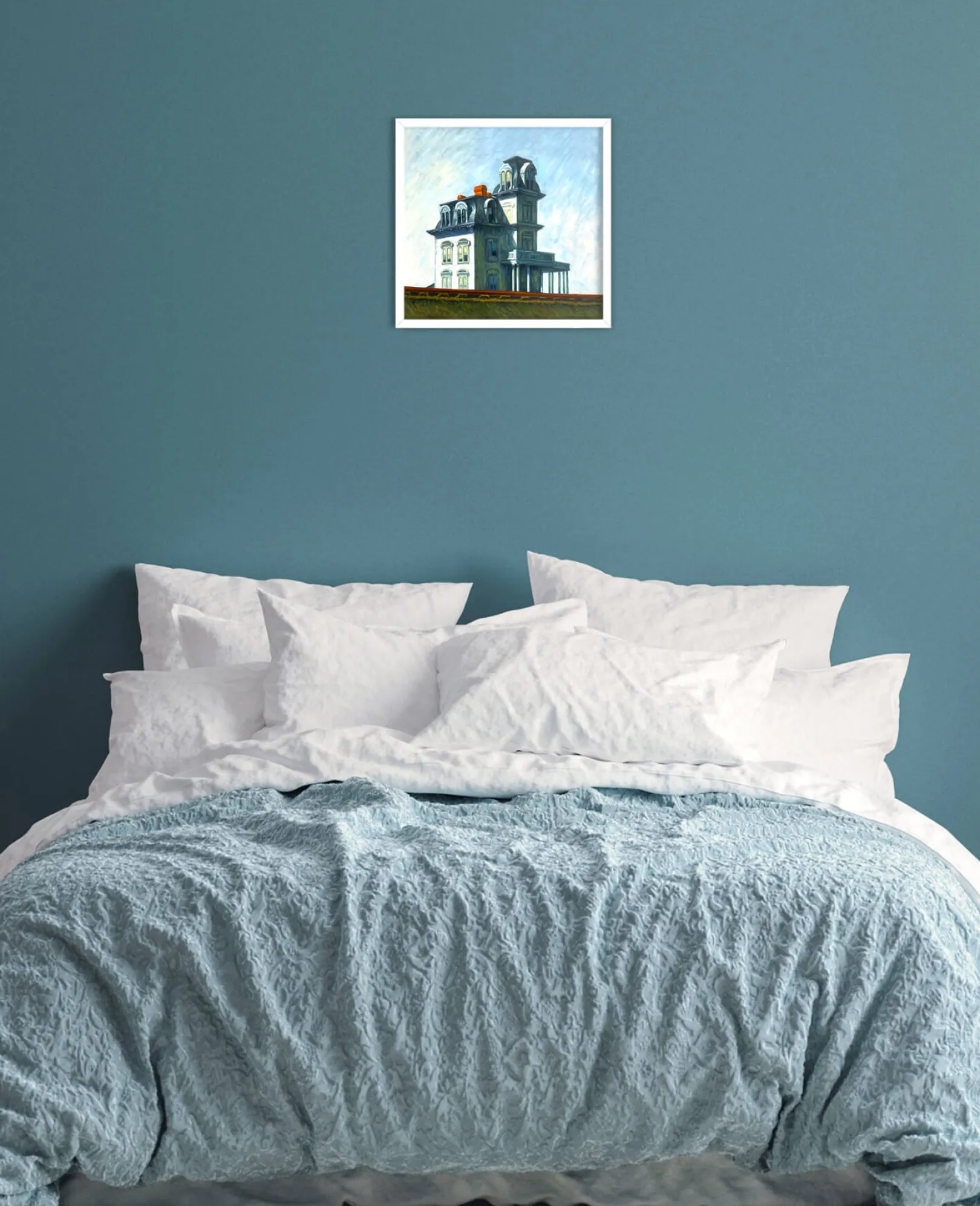 Dieses majestätische und imposante Haus, das buchstäblich zwischen der alten und der neuen Ära gefangen ist, verkörpert ein vorindustrielles Gebäude, das Edward Hopper lange Zeit als faktisch und emotionslos bezeichnete, während die Betrachtung dieses Gemäldes die ganze Tiefe zeigt, die ein Kunstwerk verbergen kann.Blau wie der Himmel, versucht dieses Bild, seine Form mit dem Hintergrund zu verschmelzen und die Dualität zwischen Natur und Industrie, Konservatismus und Progressivität noch stärker zu betonen. Die kupferfarbene Eisenbahn unterstreicht diesen Bruch eines Herrenhauses, das sich in den Himmel erhebt und gleichzeitig in der Moderne zementiert wird.Verstörend und faszinierend, wird es nicht aufhören, die Meister des Films zu inspirieren, bis es schließlich zu Hoppers Emblem wird.