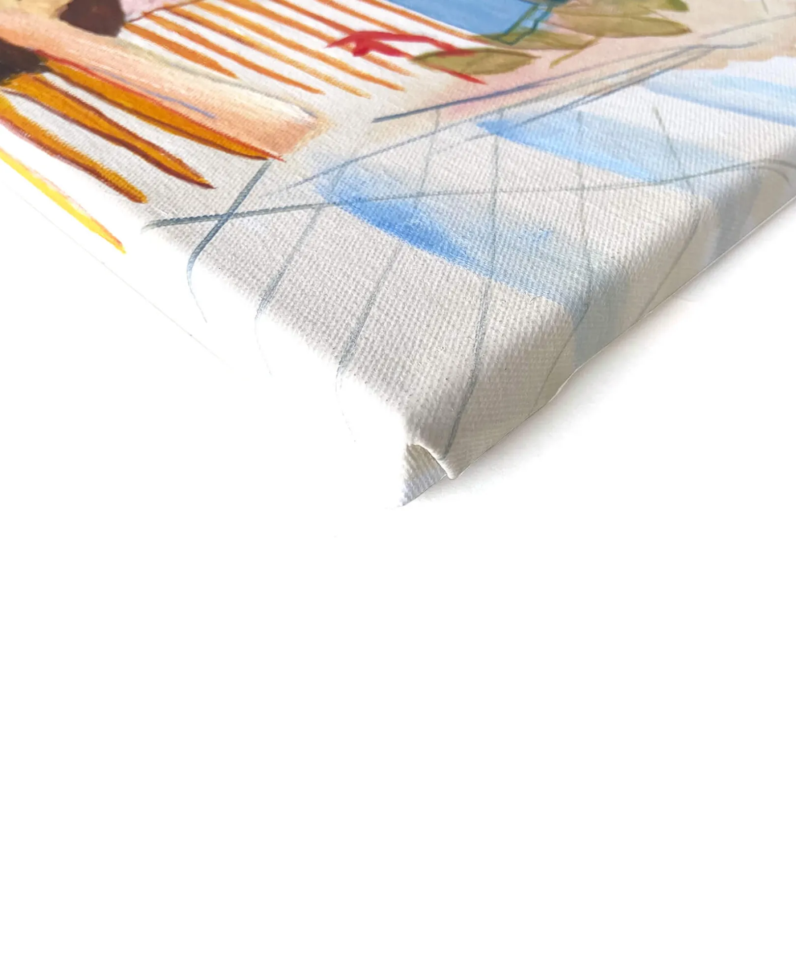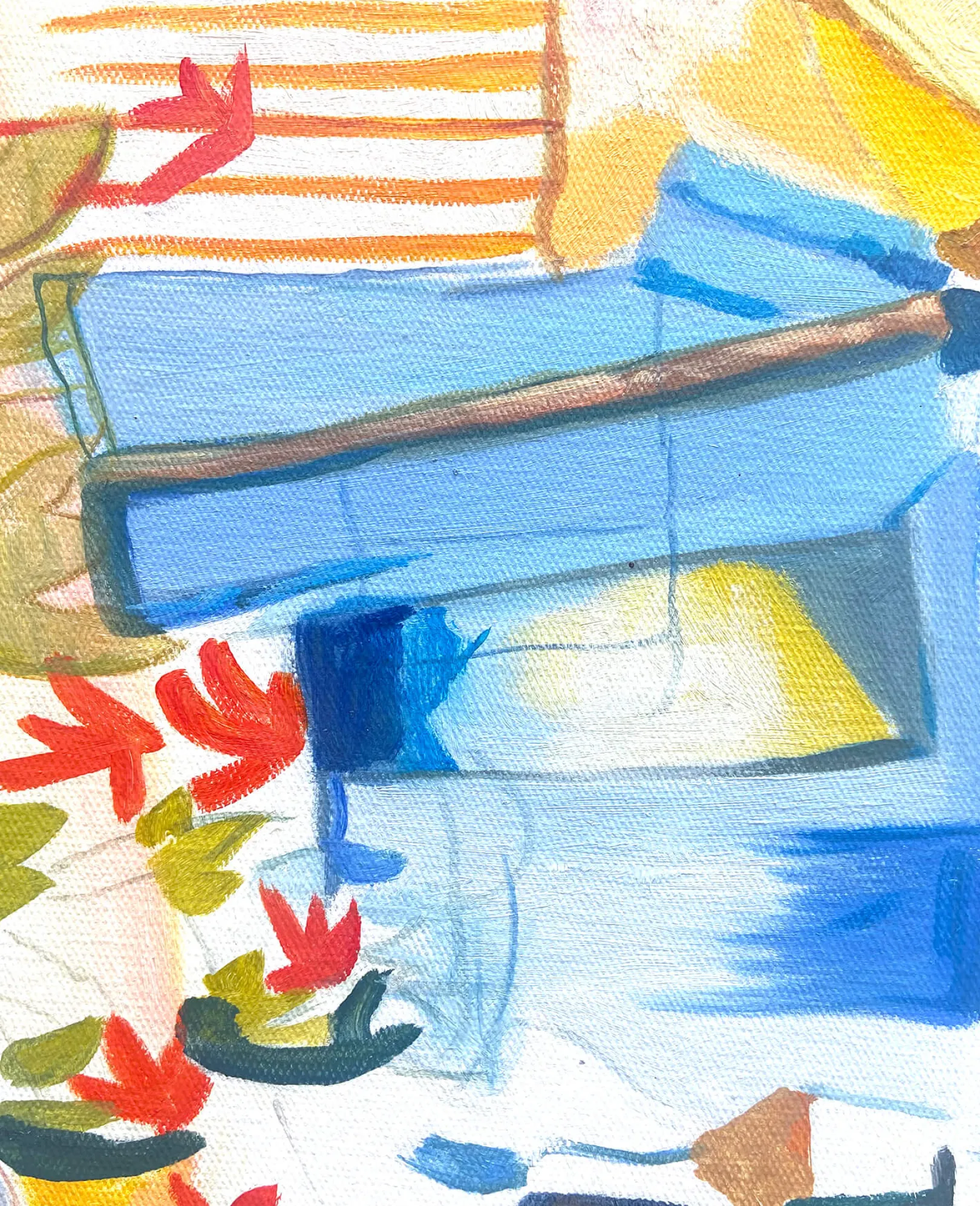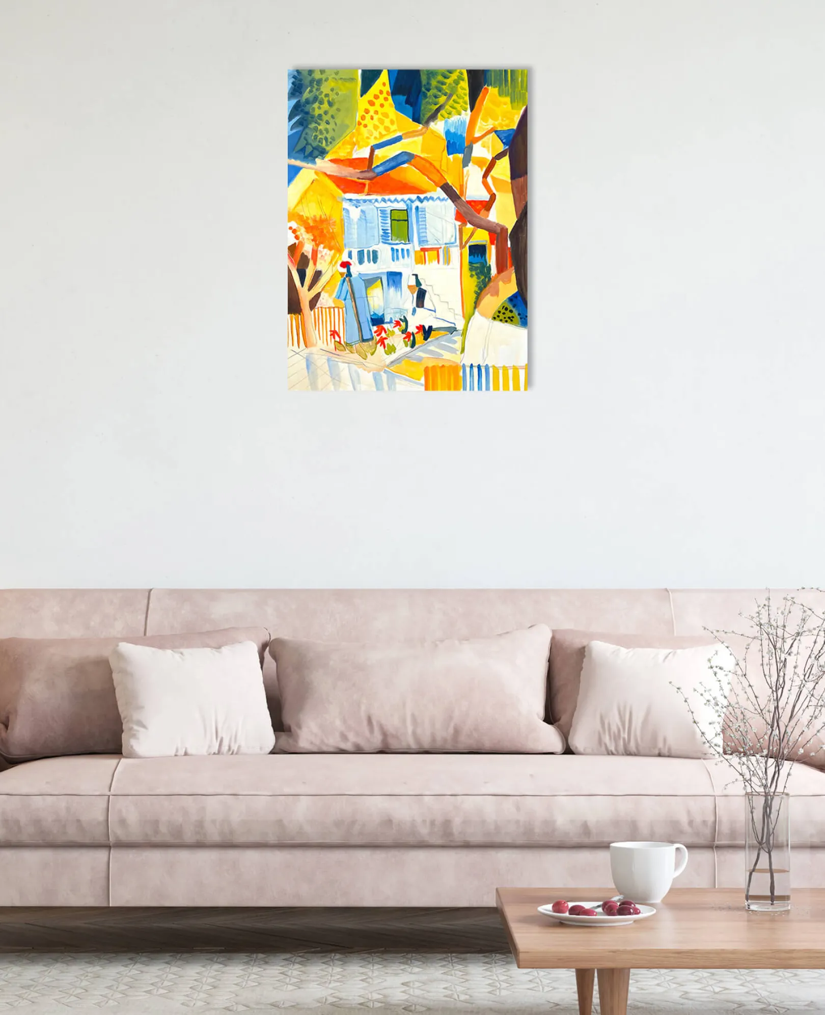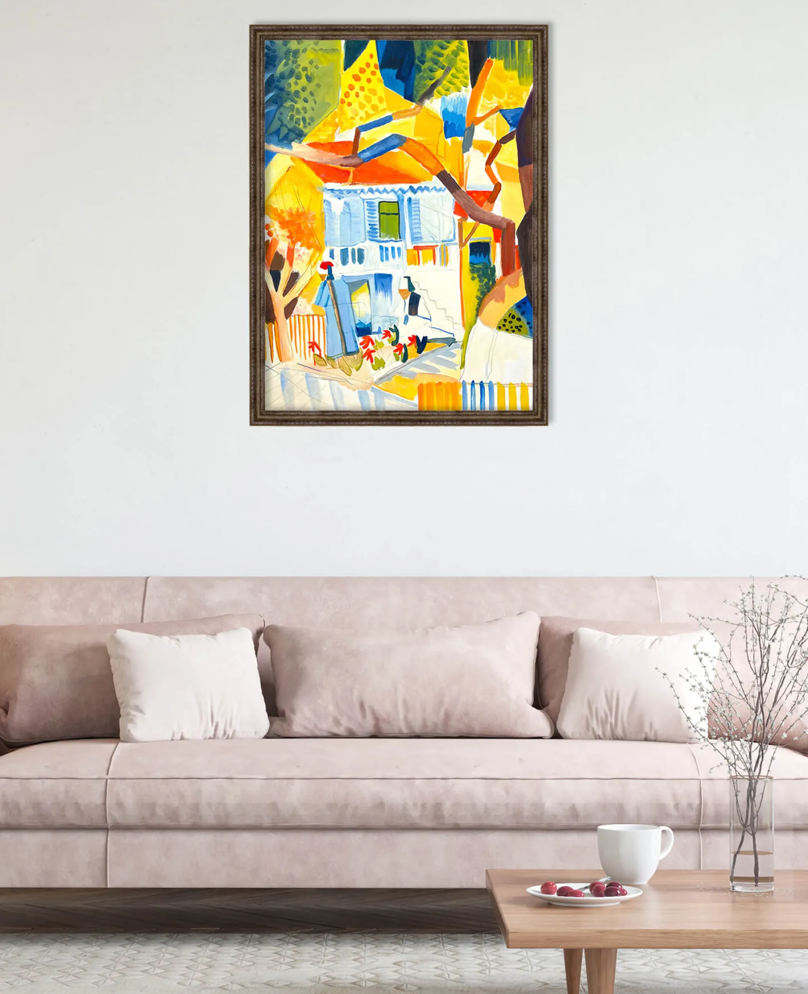 Dieses kleine Gemälde ist eines der letzten Werke des deutschen Künstlers August Macke. Es ist eine Liebeserklärung aneinen beliebten Urlaubsort des jungen expressionistischen Malers: ein Haus im Küstendorf Ezzahra (oder St. Germain) in Tunesien. Die männliche Figur, die am Fuße der weißen Treppekniet, trägt einen Fez, eine traditionelle Kopfbedeckung.