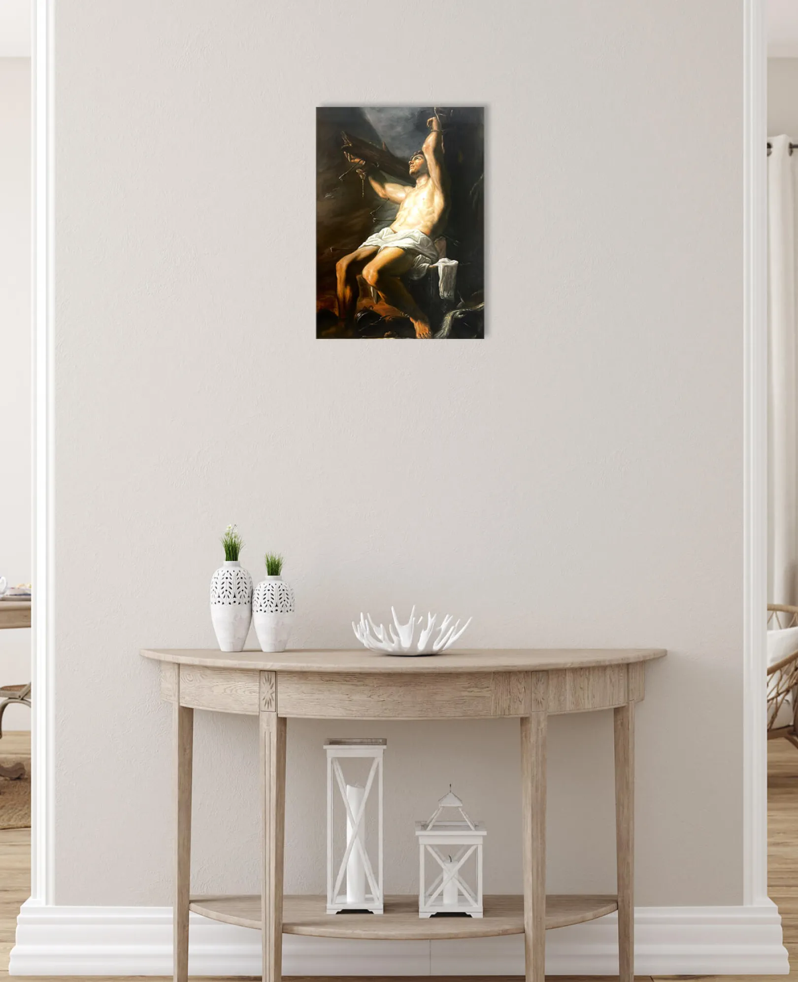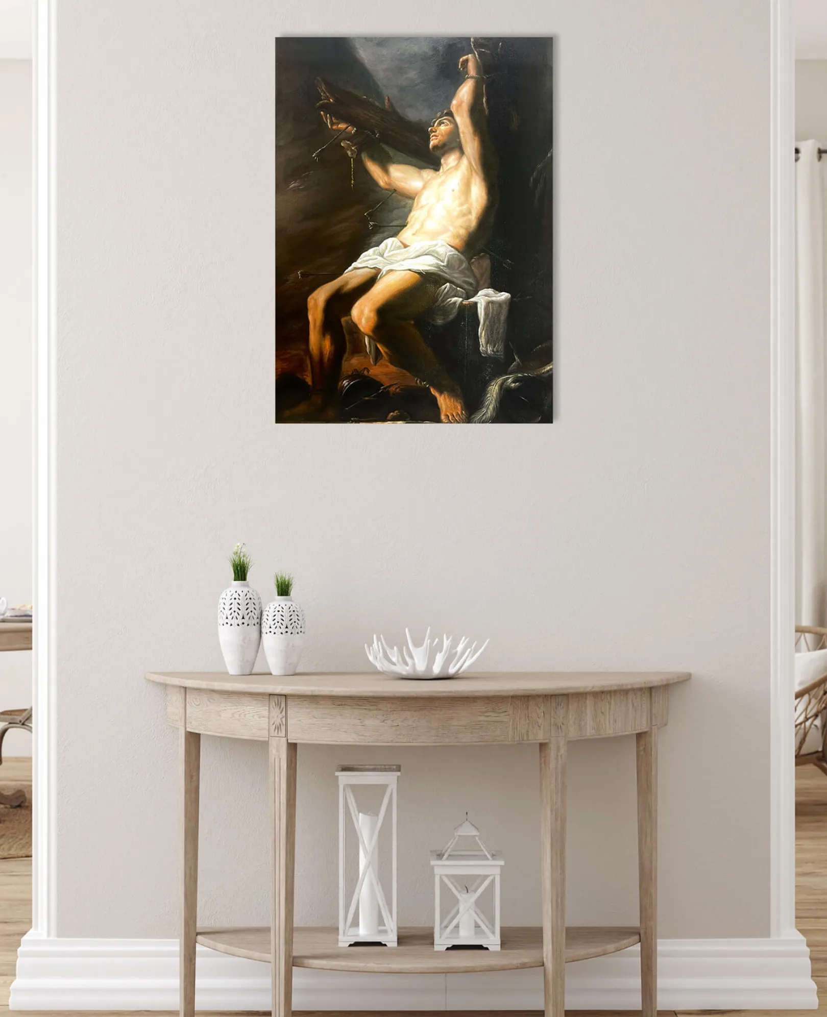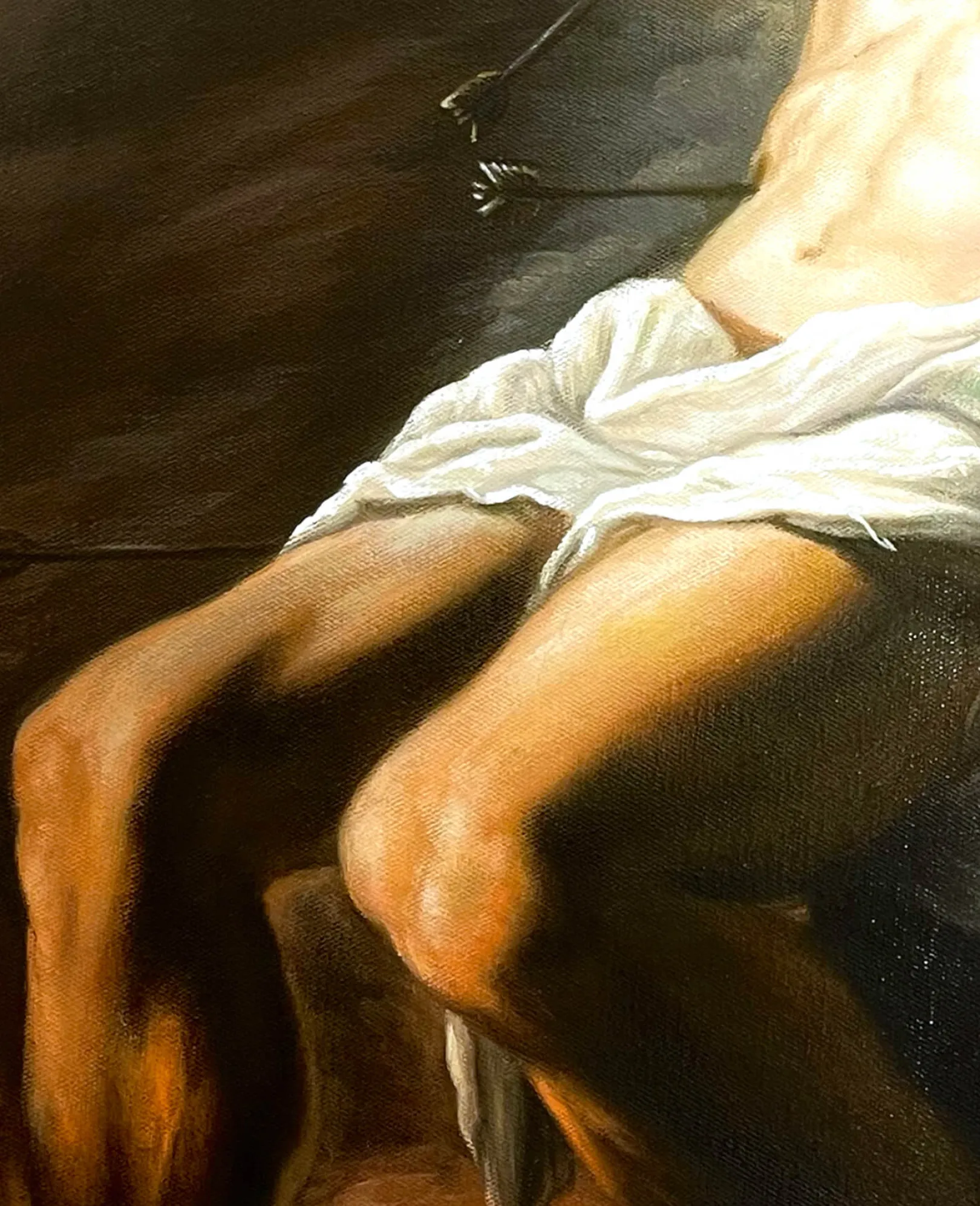 Mit diesem lebensgroßen Ölgemälde auf Leinwand liefert Mattia Preti eine persönliche und originelle Interpretation eines großen religiösen Themas: das Martyrium des Sebastian. Der italienische Barockmaler hat sich dafür entschieden, den Heiligen sitzend und in den Himmel blickend darzustellen. Ein Lichtstrahl, Symbol der göttlichen Macht, erhellt deutlich seinen Oberkörper, während seine Wunden im Schatten bleiben.