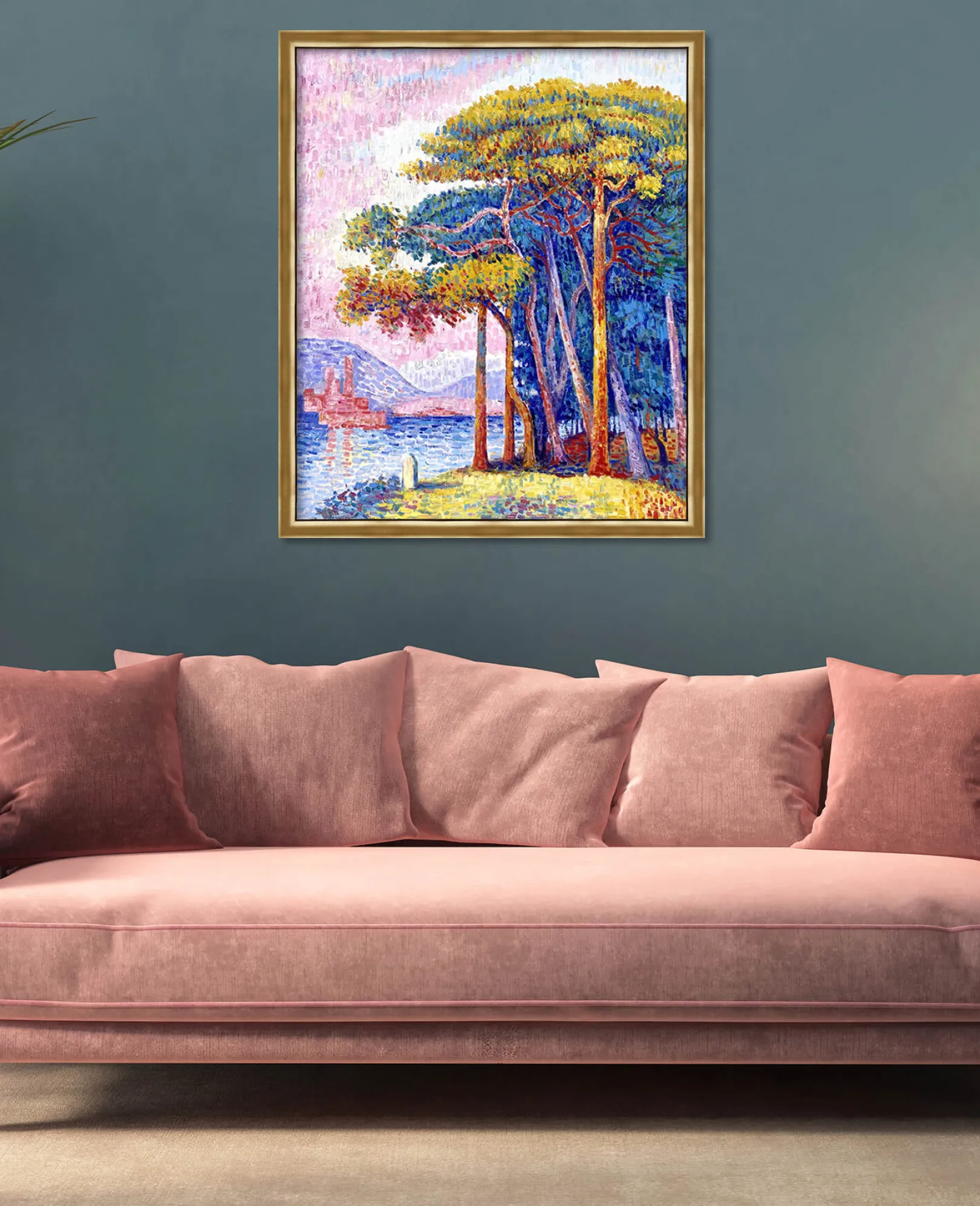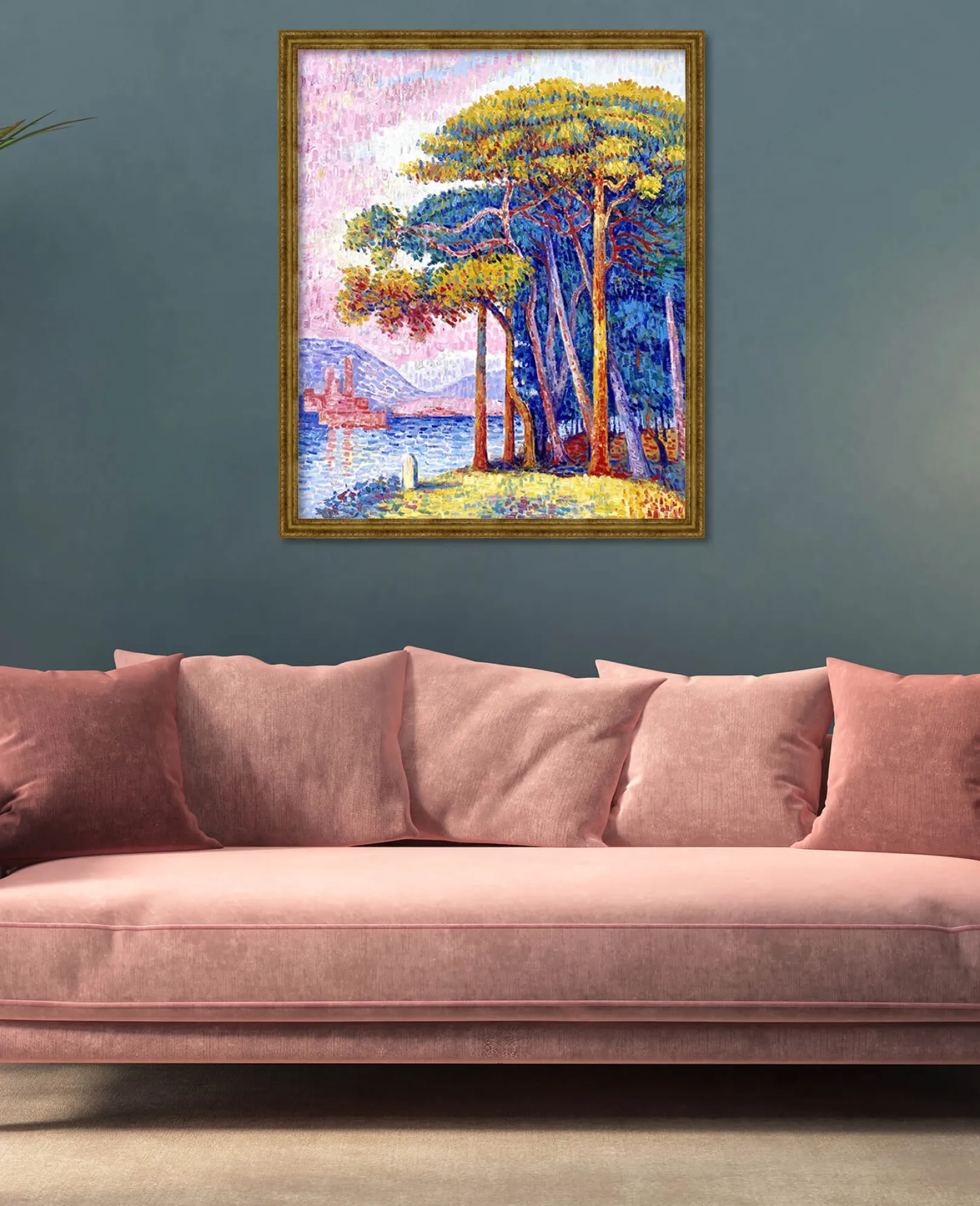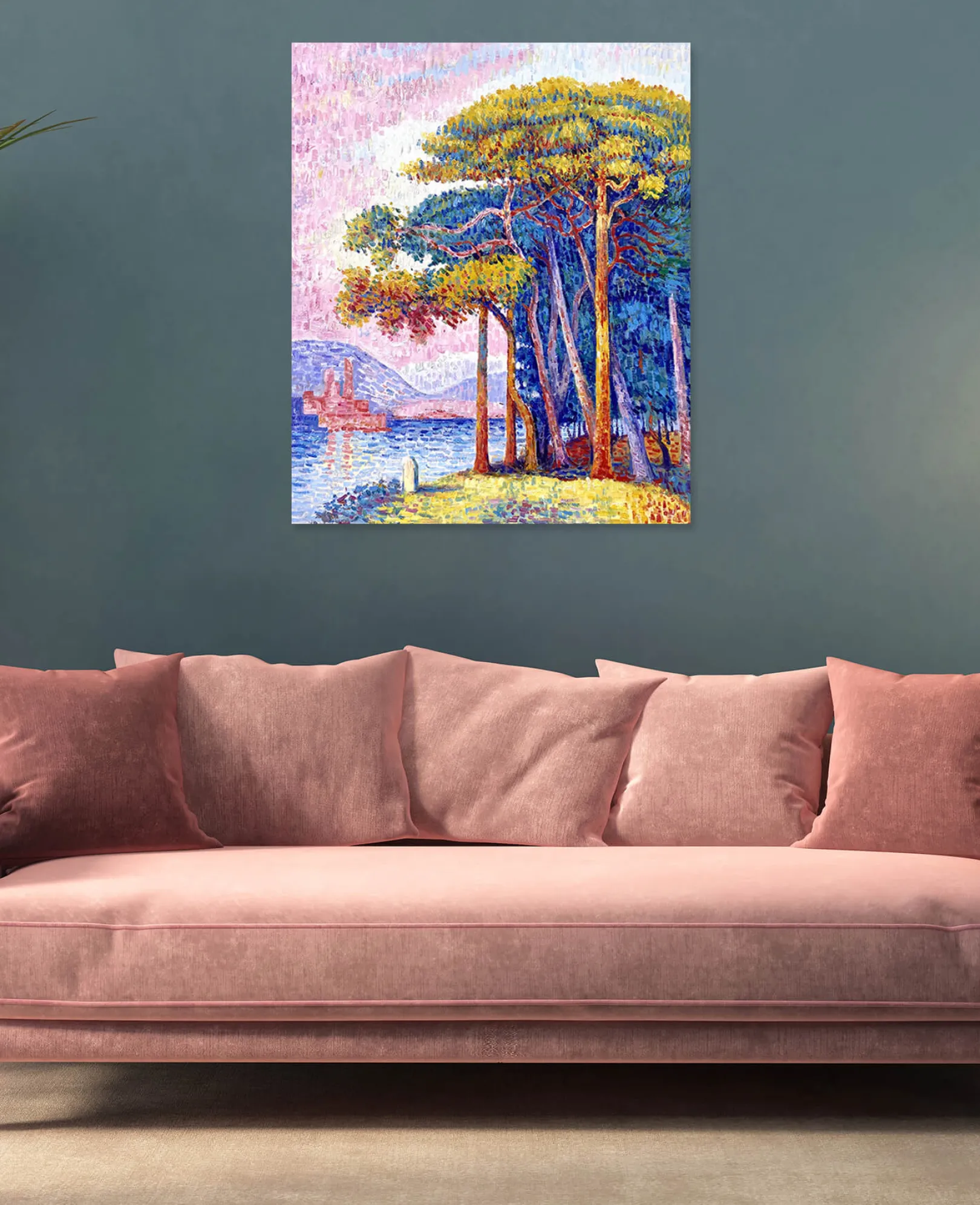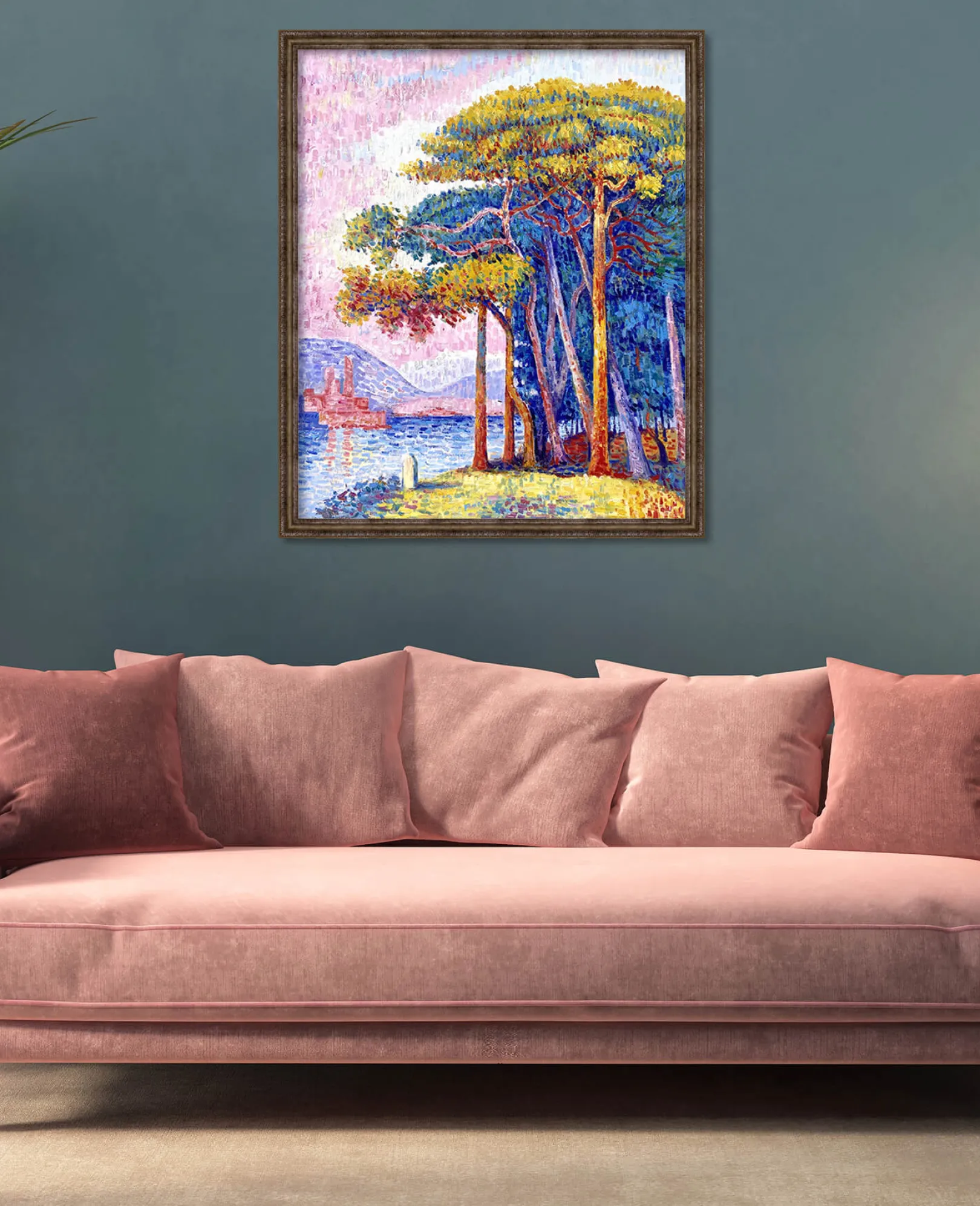 Dieses Werk ist eine poetische Darstellung des Pinienwaldes von Antibes an der Côte d’Azur. Ab 1913 hielt sich Paul Signac mit seiner zweiten Frau Jeanne Selmersein-Desgranges, die ebenfalls Malerin war, regelmäßig in Antibes auf. Er genoss es besonders, die Meeresufer der Mittelmeerküste zu erkunden. Hier werden die Farben nicht gemischt, sondern in kleinen Pinselstrichen nebeneinander gesetzt, wobei das Verfahren der Teilung angewandt wird, das das Wesen des Pointillismus ausmacht. Signac wird mit seinen Landschaftsbildern übrigens zu einem ihrer berühmtesten Vertreter.