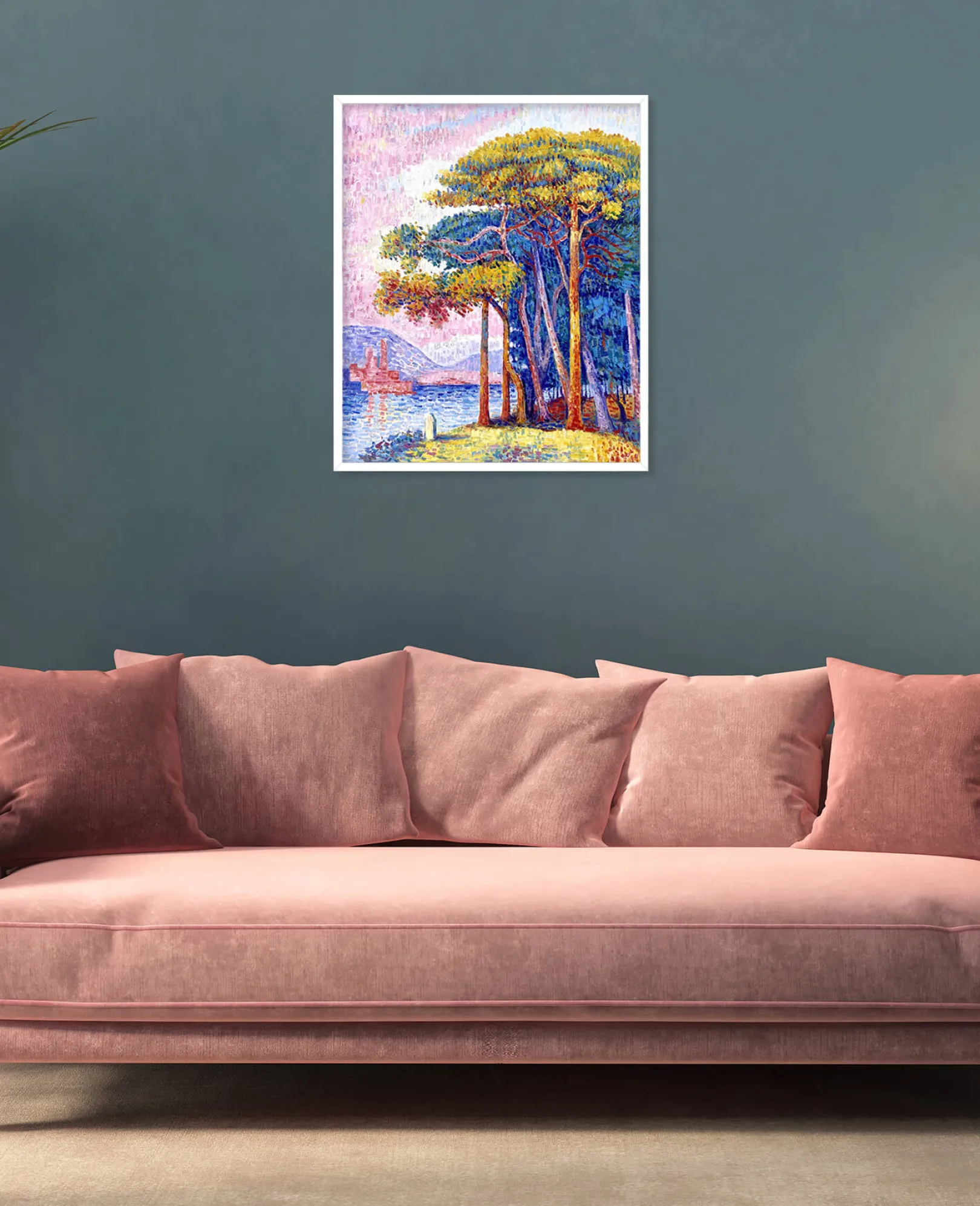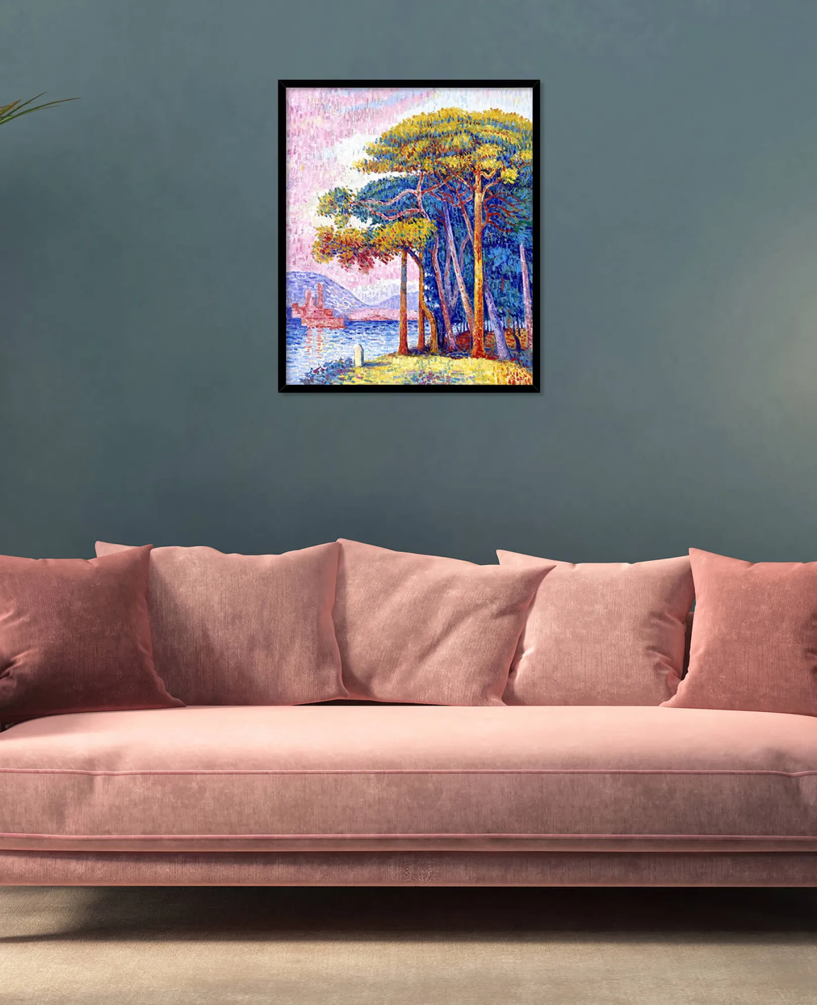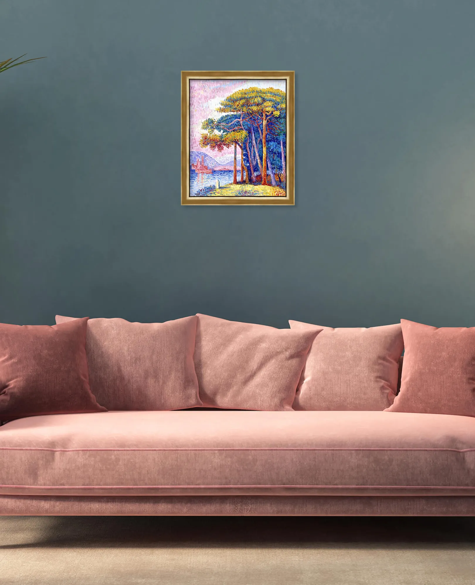 Dieses Werk ist eine poetische Darstellung des Pinienwaldes von Antibes an der Côte d’Azur. Ab 1913 hielt sich Paul Signac mit seiner zweiten Frau Jeanne Selmersein-Desgranges, die ebenfalls Malerin war, regelmäßig in Antibes auf. Er genoss es besonders, die Meeresufer der Mittelmeerküste zu erkunden. Hier werden die Farben nicht gemischt, sondern in kleinen Pinselstrichen nebeneinander gesetzt, wobei das Verfahren der Teilung angewandt wird, das das Wesen des Pointillismus ausmacht. Signac wird mit seinen Landschaftsbildern übrigens zu einem ihrer berühmtesten Vertreter.