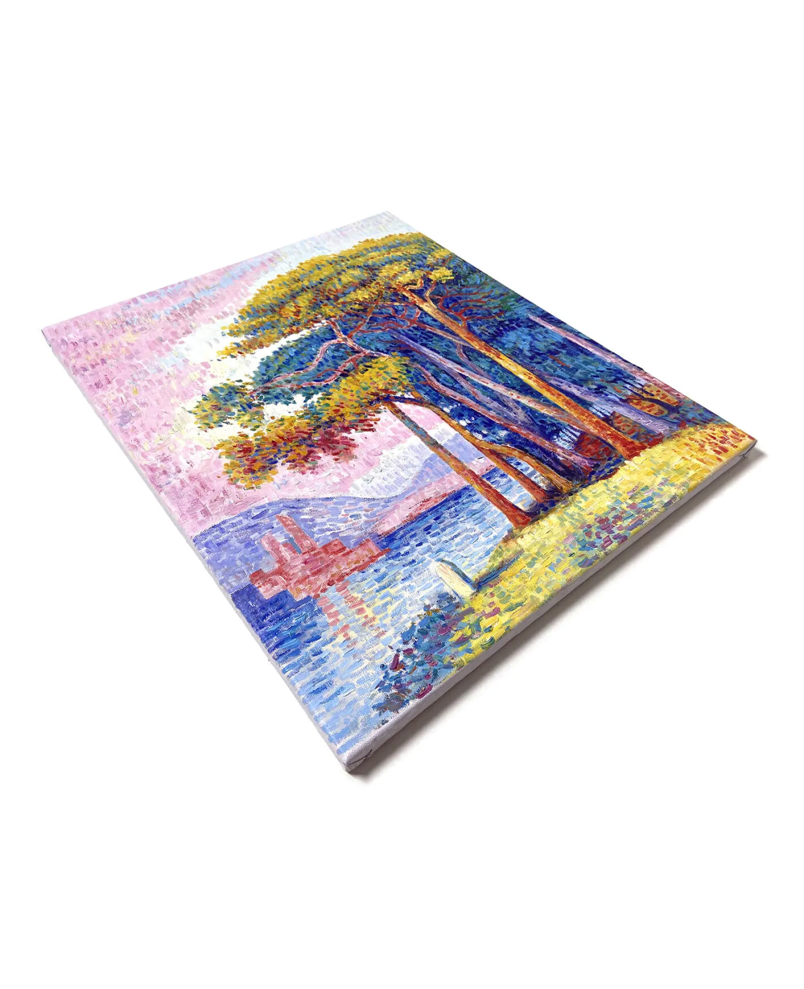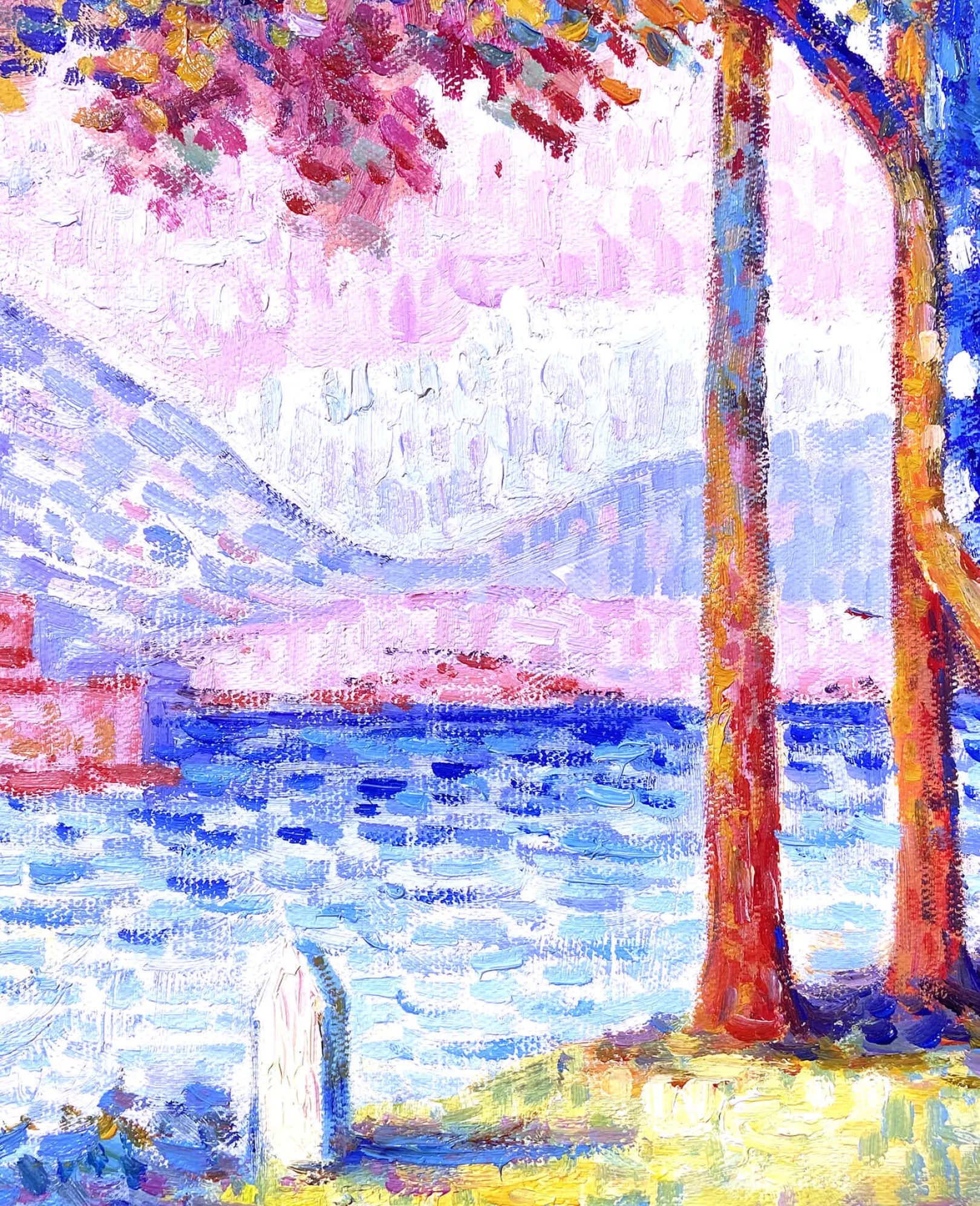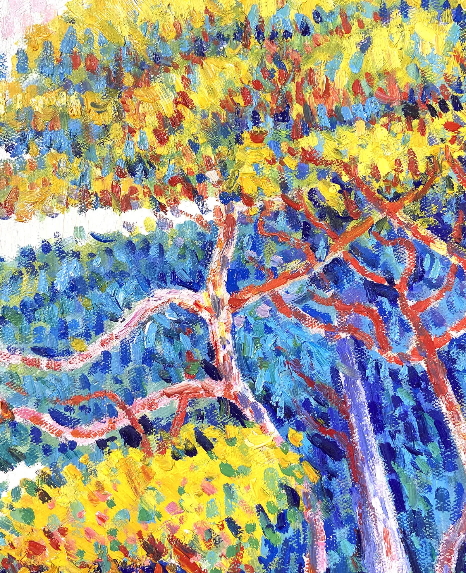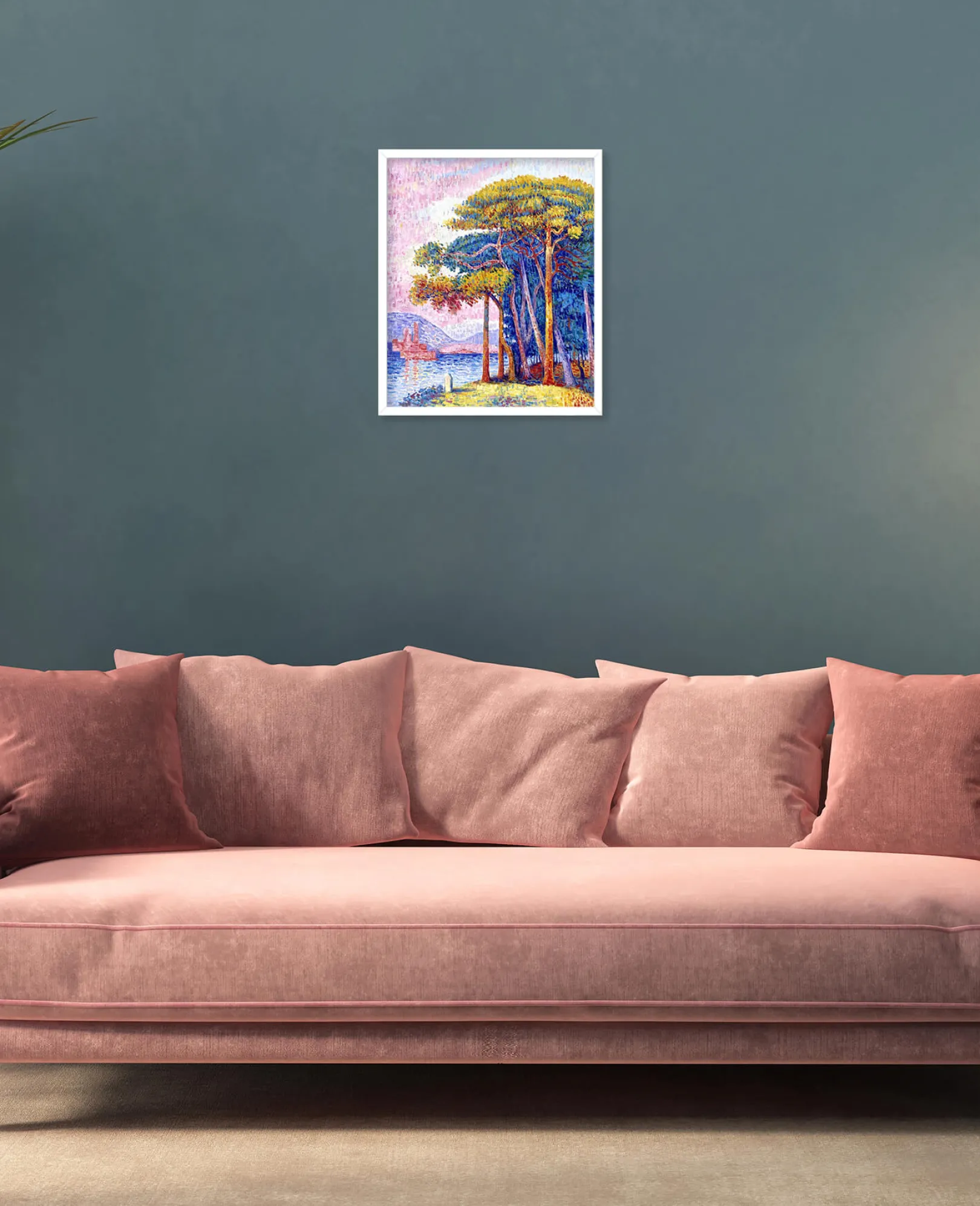 Dieses Werk ist eine poetische Darstellung des Pinienwaldes von Antibes an der Côte d’Azur. Ab 1913 hielt sich Paul Signac mit seiner zweiten Frau Jeanne Selmersein-Desgranges, die ebenfalls Malerin war, regelmäßig in Antibes auf. Er genoss es besonders, die Meeresufer der Mittelmeerküste zu erkunden. Hier werden die Farben nicht gemischt, sondern in kleinen Pinselstrichen nebeneinander gesetzt, wobei das Verfahren der Teilung angewandt wird, das das Wesen des Pointillismus ausmacht. Signac wird mit seinen Landschaftsbildern übrigens zu einem ihrer berühmtesten Vertreter.