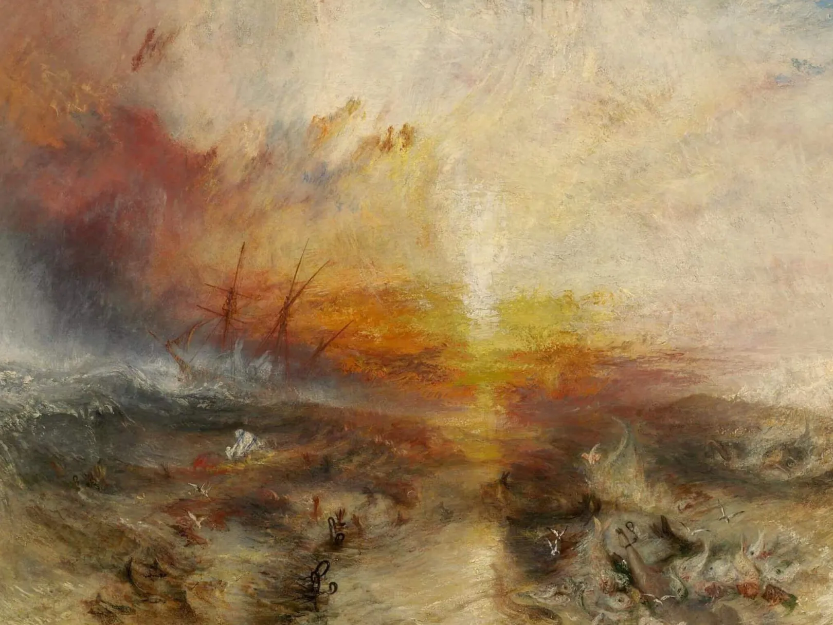 William Turners „Sklavenschiff“ bietet eine verstörende Mischung aus Schönheit und Brutalität, ein Werk, das die emotionale Intensität der Romantik unterstreicht. Das Bild zeigt ein Sklavenschiff in einem tobenden Sturm, das über Bord geworfene Sklaven zurücklässt. Die feurigen Töne des Himmels, der Kontrast zum heftigen Blau des Meeres und die undeutlichen Formen schaffen eine Atmosphäre von Chaos und Verzweiflung.