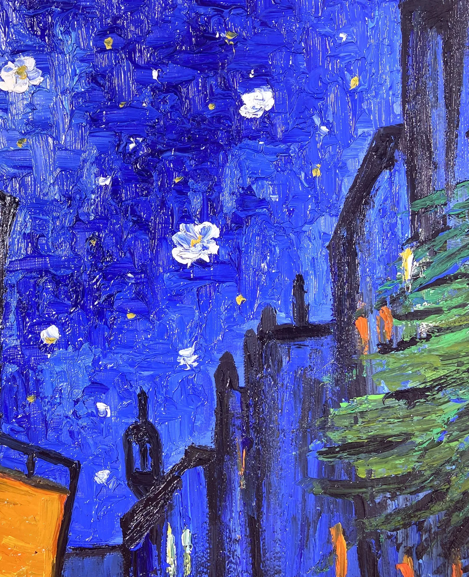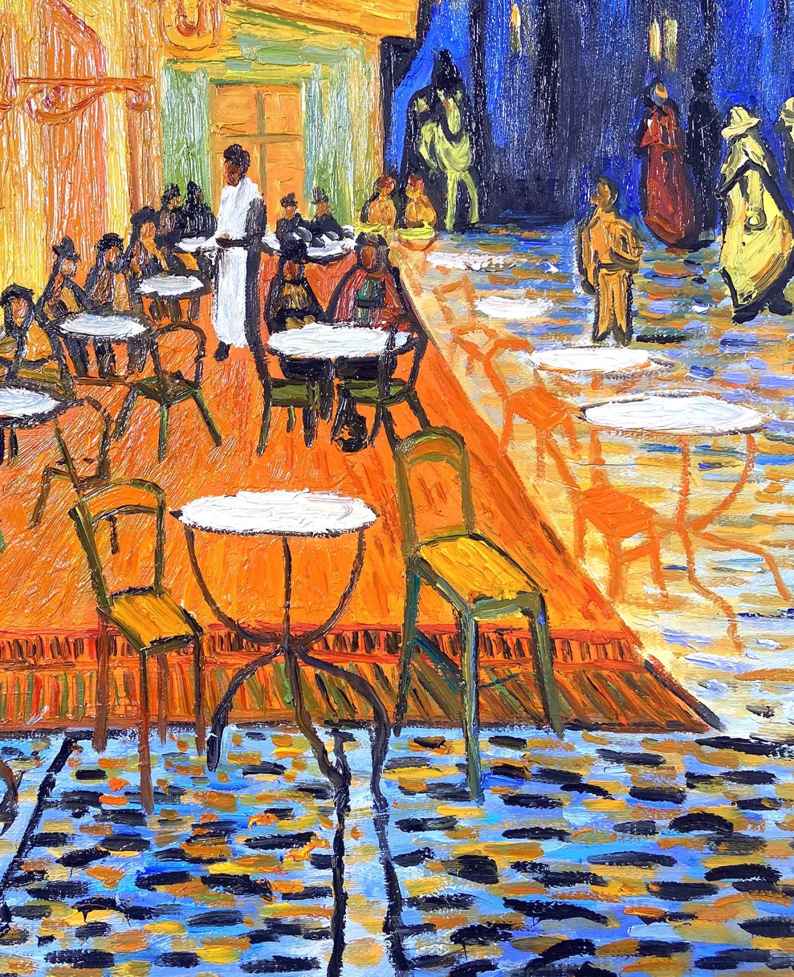 Es war das erste Gemälde, in dem Vincent Van Gogh einen Sternenhimmel darstellte, den wir später auch in Sternennacht an der Rhône, das im selben Monat entstand, und Sternennacht, ein Jahr später, wiederfinden. In diesem Werk versucht der Künstler, die nächtliche Atmosphäre eines kleinen Platzes in der provenzalischen Stadt Arles einzufangen. Er will eine Nacht in leuchtenden Farben zeigen und vielleicht, so sagt er, irrt er sich manchmal in der genauen Tonalität.