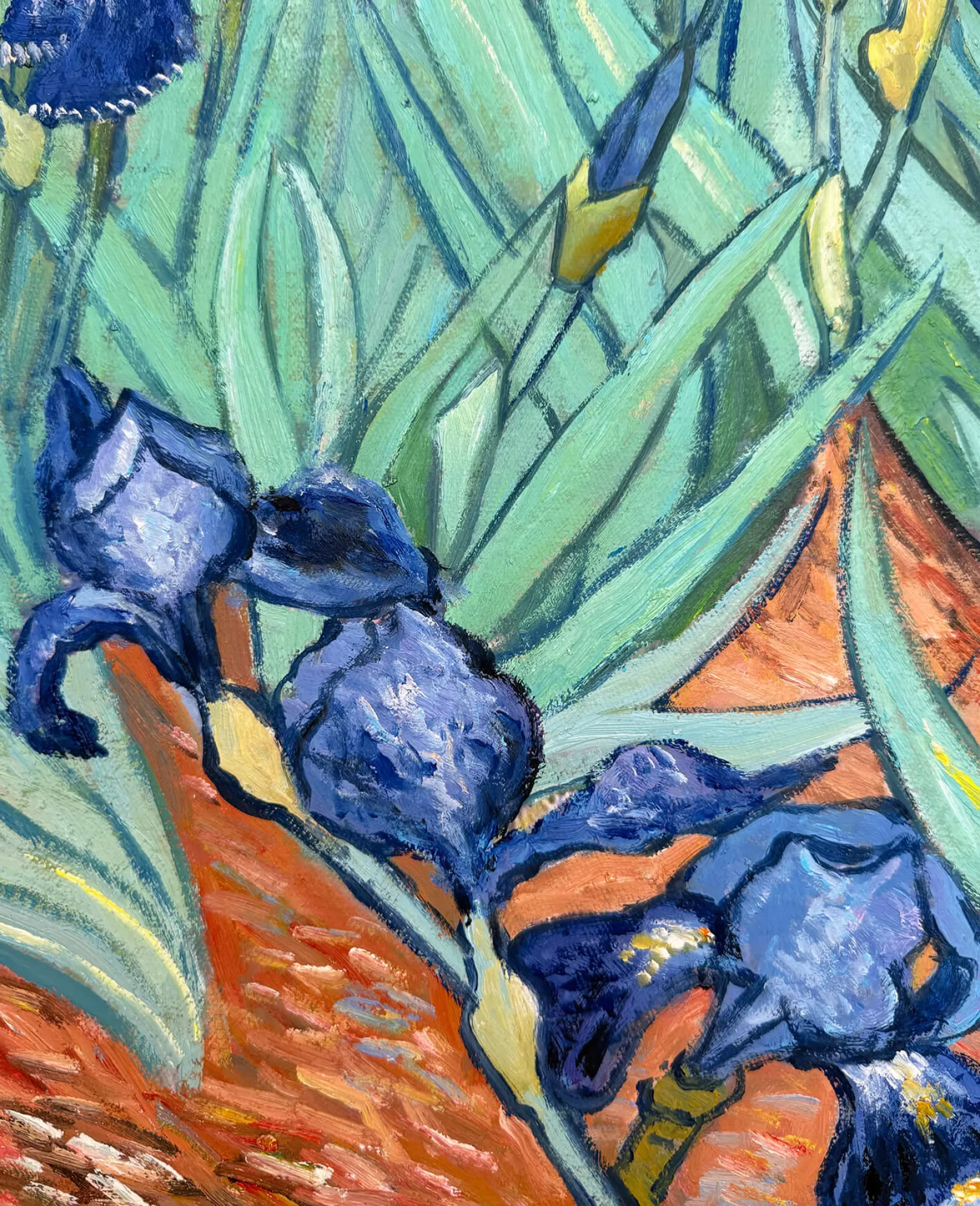 Als Vincent Van Gogh vor kurzem in die Klosterheilanstalt Saint-Paul de Mausole in Saint-Rémy-de-Provence eingewiesen wurde (Mai 1889), entschied er sich dafür, die blühenden Schwertlilien zu malen, die im Garten der Anstalt gepflanzt worden waren. Er erklärte, dass diese impressionistische Malerei den Blitzableiter für seine Krankheit darstellte, weil er der Meinung war, dass er durch das Weitermalen verhindern konnte, verrückt zu werden. Die Farbe stellt hier das Element der Freiheit des Malers dar. Seine Subjektivität vermischt sich mit der Realität, um die Kontraste zu verstärken und einen Bildraum mit intensiver Leuchtkraft zu schaffen. Vase mit Iris ist ein weiteres Gemälde von Van Gogh, das diese Blume darstellt.