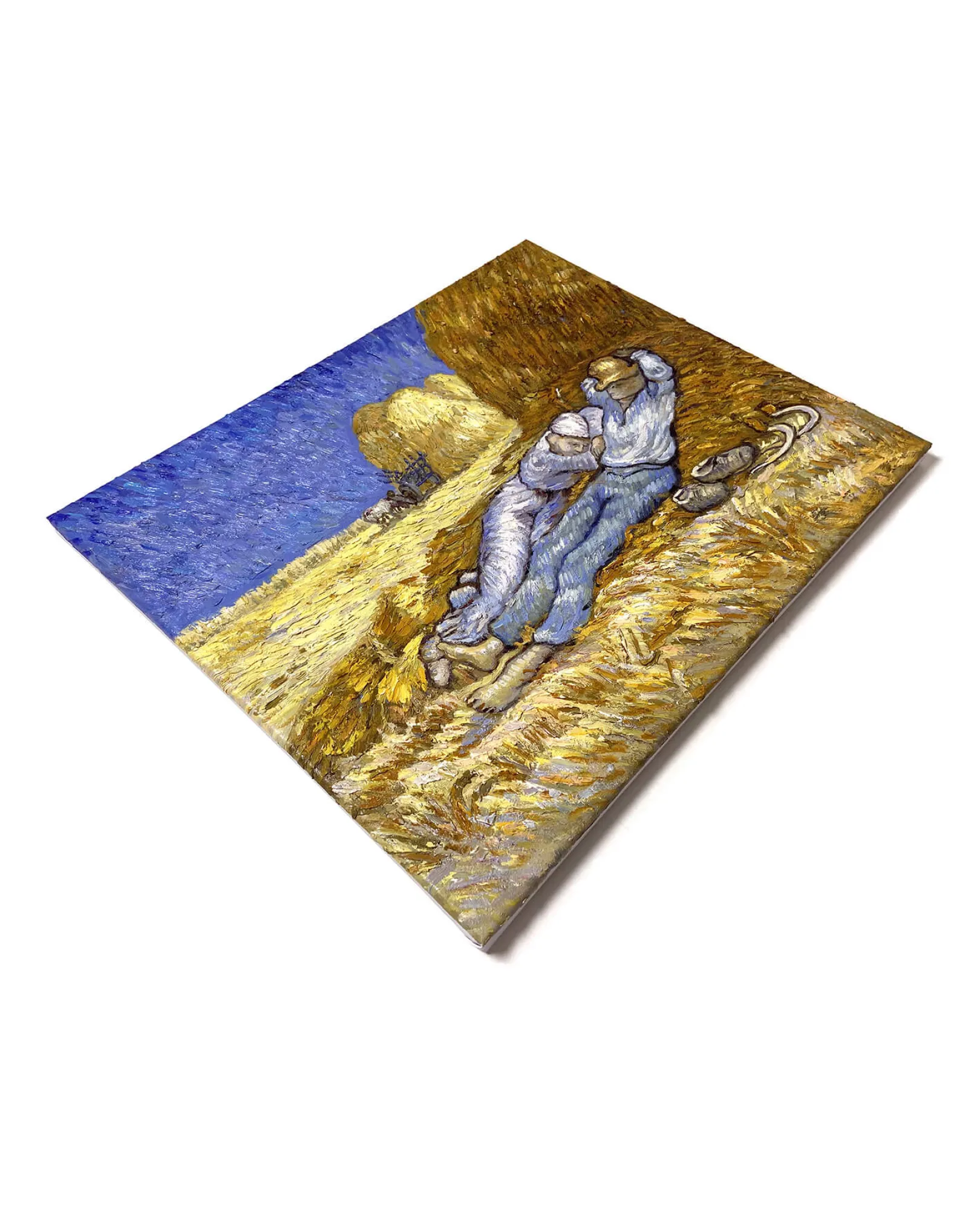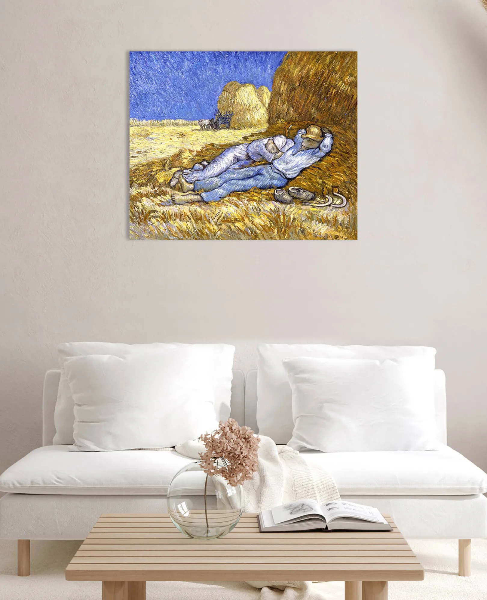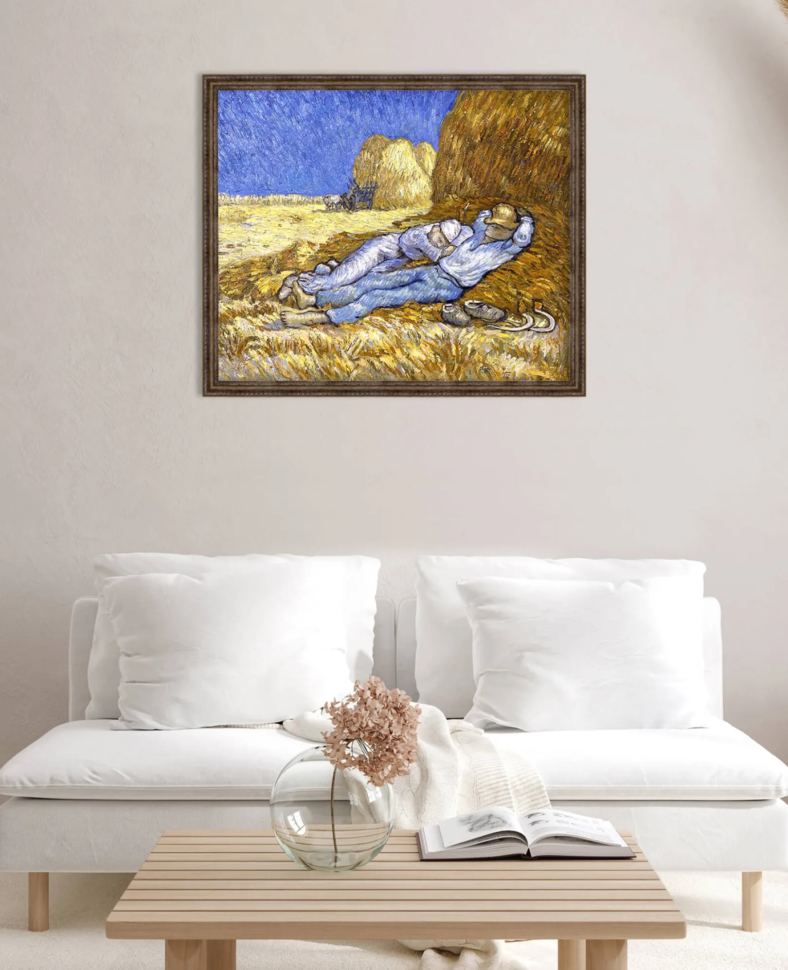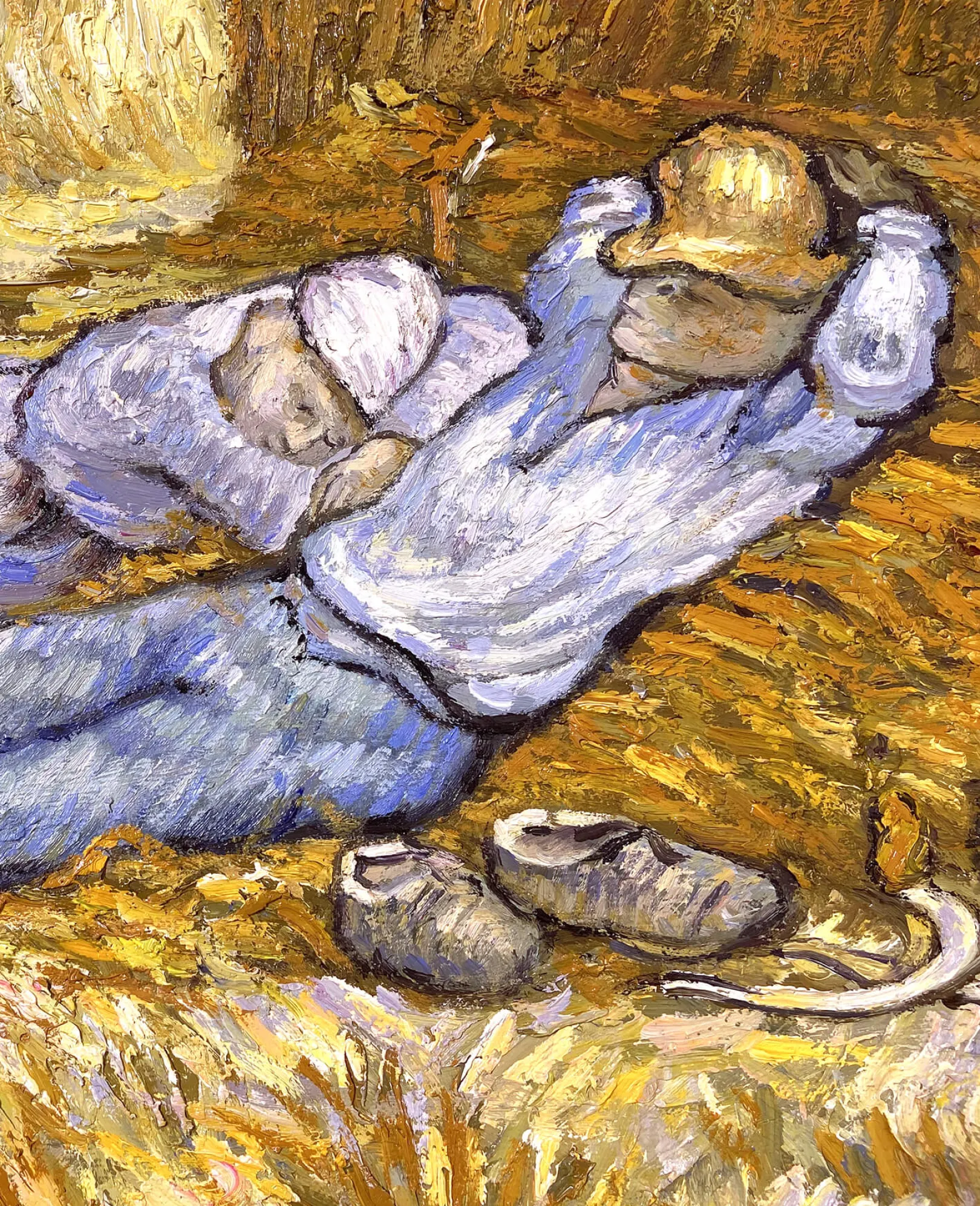 Die Komposition wurde von einer Zeichnung des Künstlers Jean-François Millet übernommen. Diese persönliche und beruhigende Übertragung von Vincent Van Gogh erfolgt hauptsächlich durch eine Farbkonstruktion, die auf dem Kontrast der Farben beruht und es ermöglicht, die konstante Intensität, die von seinen Werken ausgeht, wiederzufinden.& Farben, die wir oft in den Bildern des Künstlers wiederfinden, wie z. B.& Weizenfeld mit Krähen und Weizenfeld hinter dem Hospiz Saint-Paul mit einem Mäher.