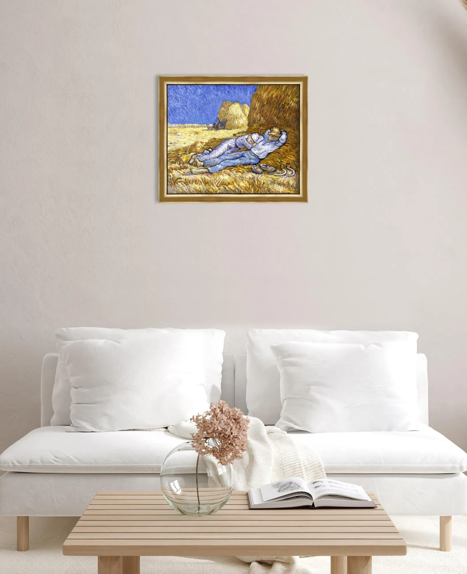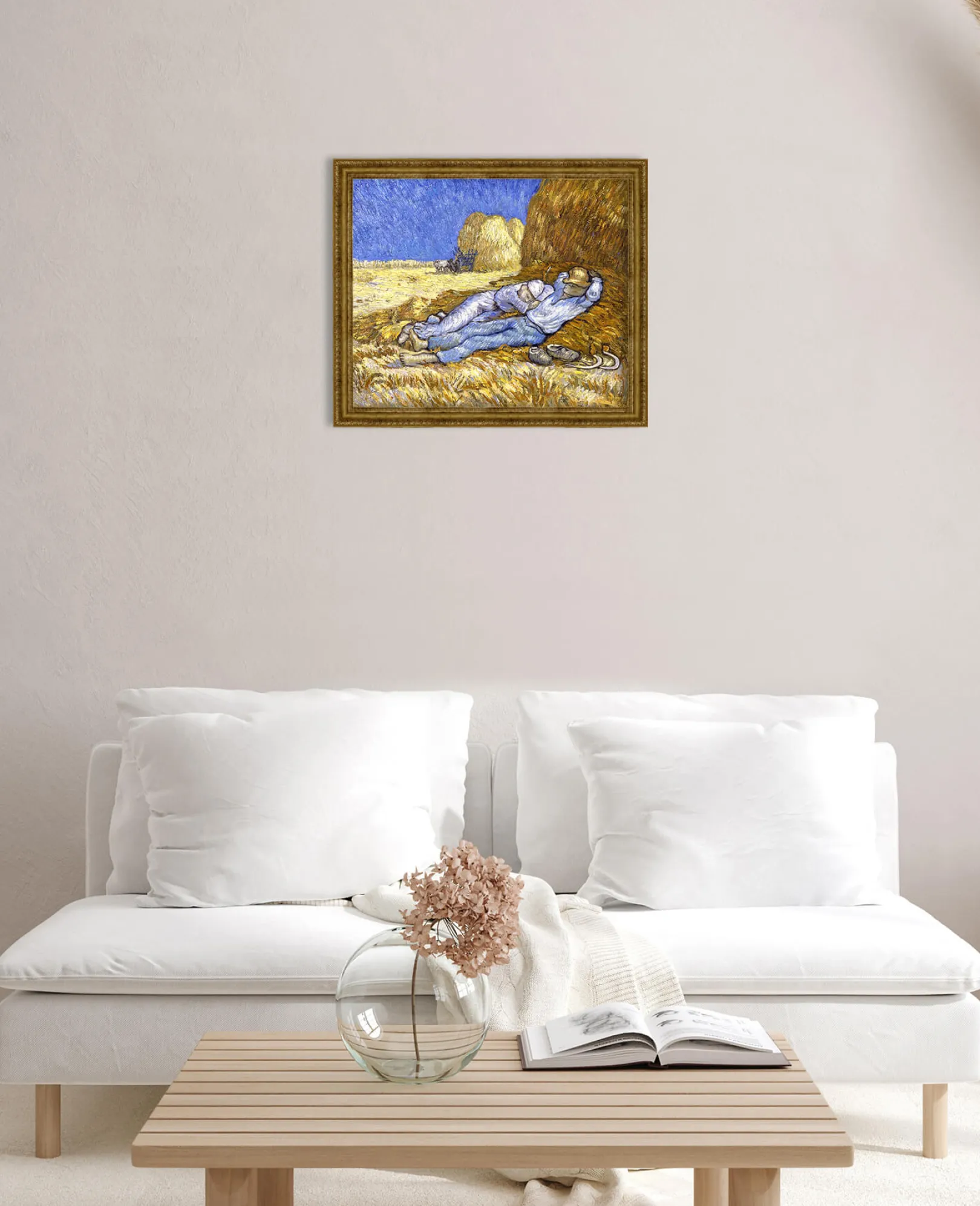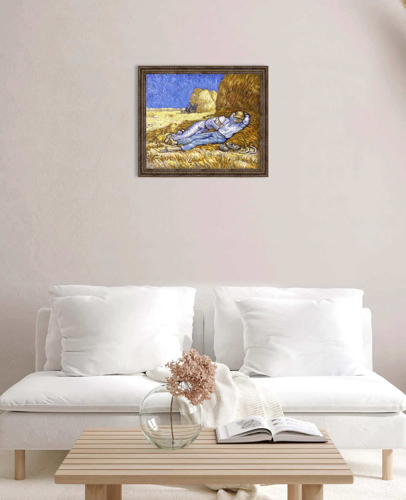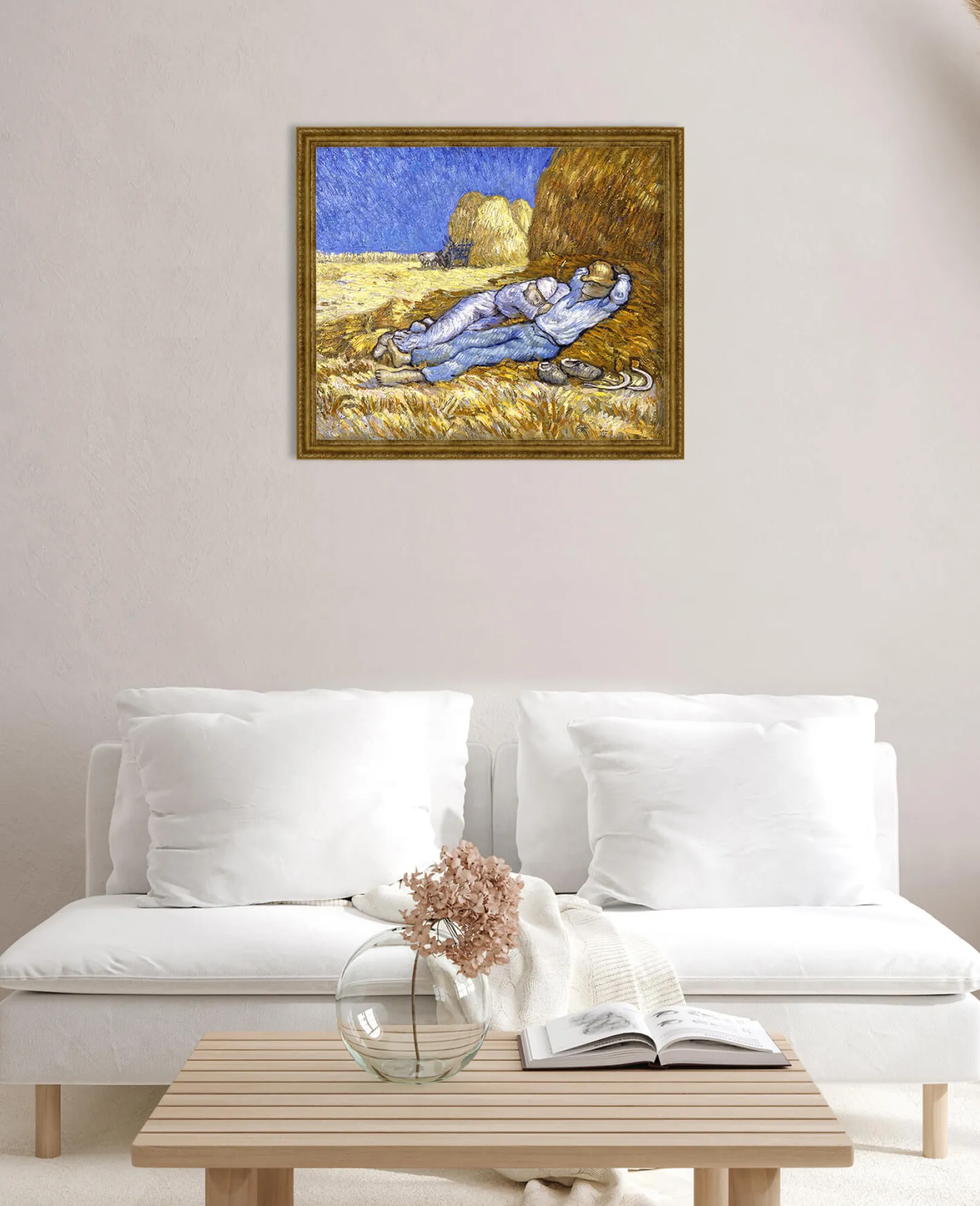 Die Komposition wurde von einer Zeichnung des Künstlers Jean-François Millet übernommen. Diese persönliche und beruhigende Übertragung von Vincent Van Gogh erfolgt hauptsächlich durch eine Farbkonstruktion, die auf dem Kontrast der Farben beruht und es ermöglicht, die konstante Intensität, die von seinen Werken ausgeht, wiederzufinden.& Farben, die wir oft in den Bildern des Künstlers wiederfinden, wie z. B.& Weizenfeld mit Krähen und Weizenfeld hinter dem Hospiz Saint-Paul mit einem Mäher.