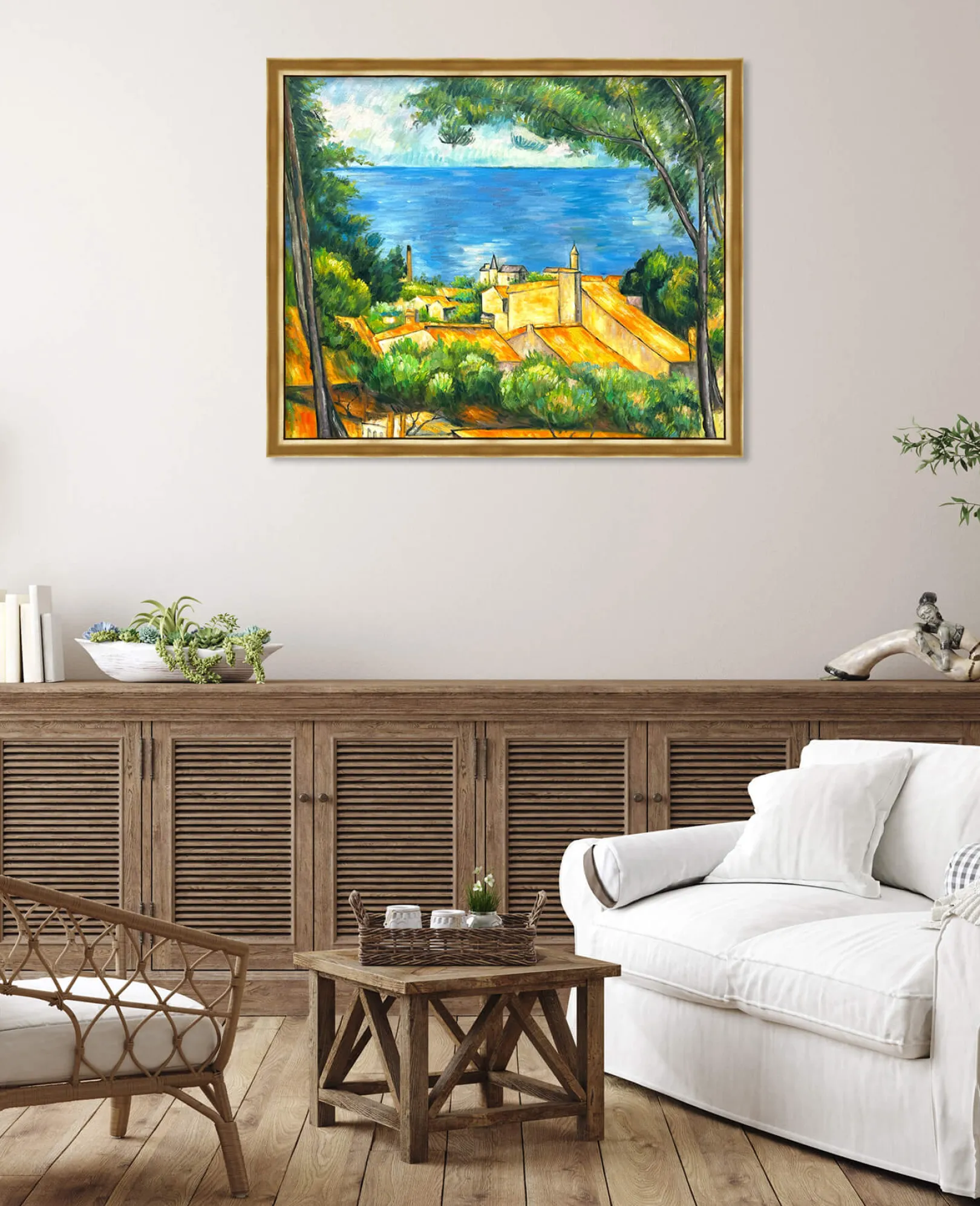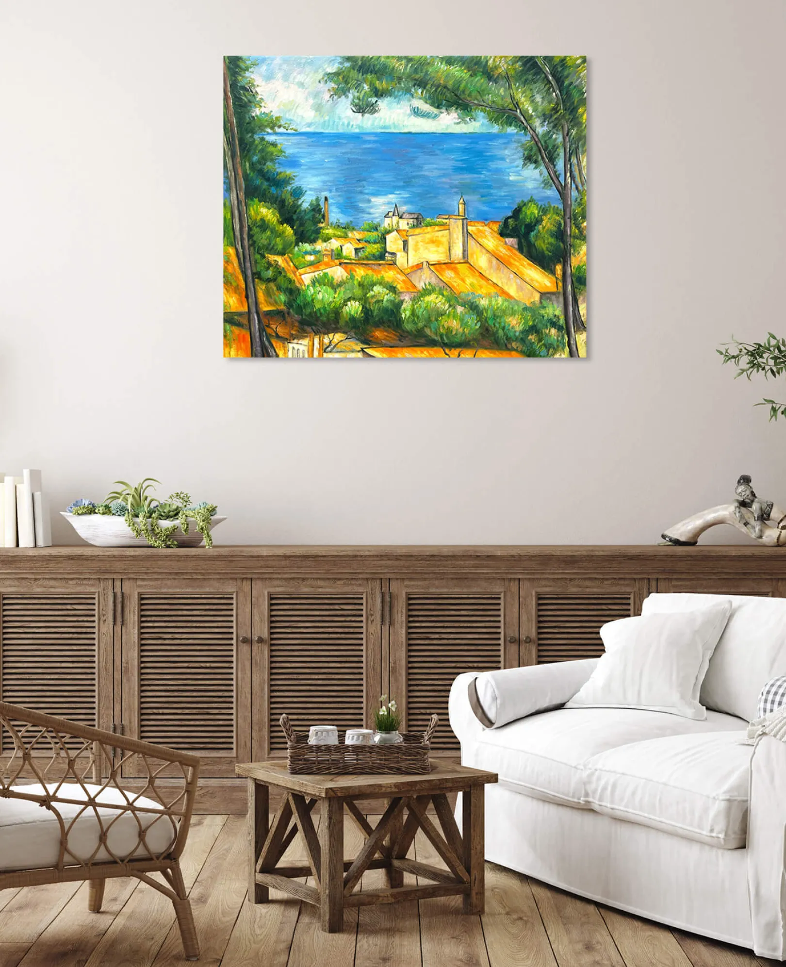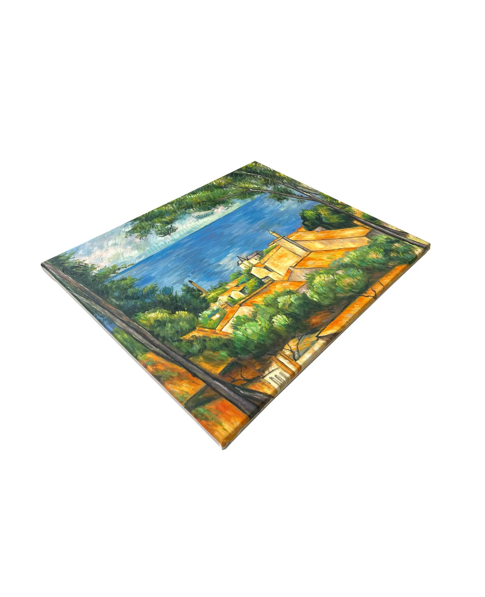 Dieses impressionistische Ölgemälde auf Leinwand, das Ende des 19. Jahrhunderts entstand, ist eines der Bilder, die Paul Cézanne während eines Aufenthalts in seiner Heimat Provence malte. Es ist eine Hommage an die Pracht von Estaque, einem Stadtteil von Marseille mit einer ruhigen Atmosphäre und einer typisch mediterranen Vegetation. Die Aleppo-Kiefern blicken friedlich auf die roten Dächer der Häuser, die den Strand säumen.