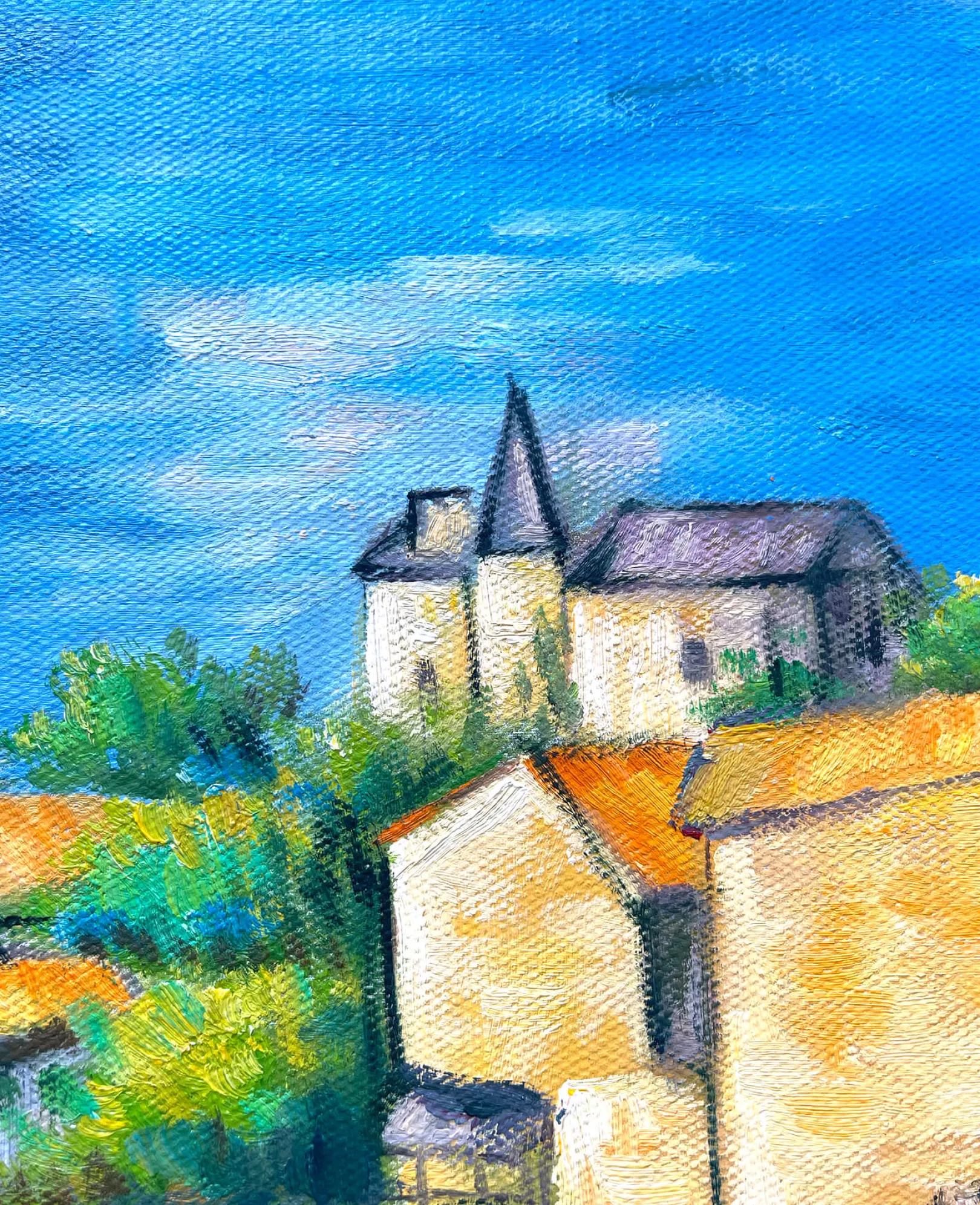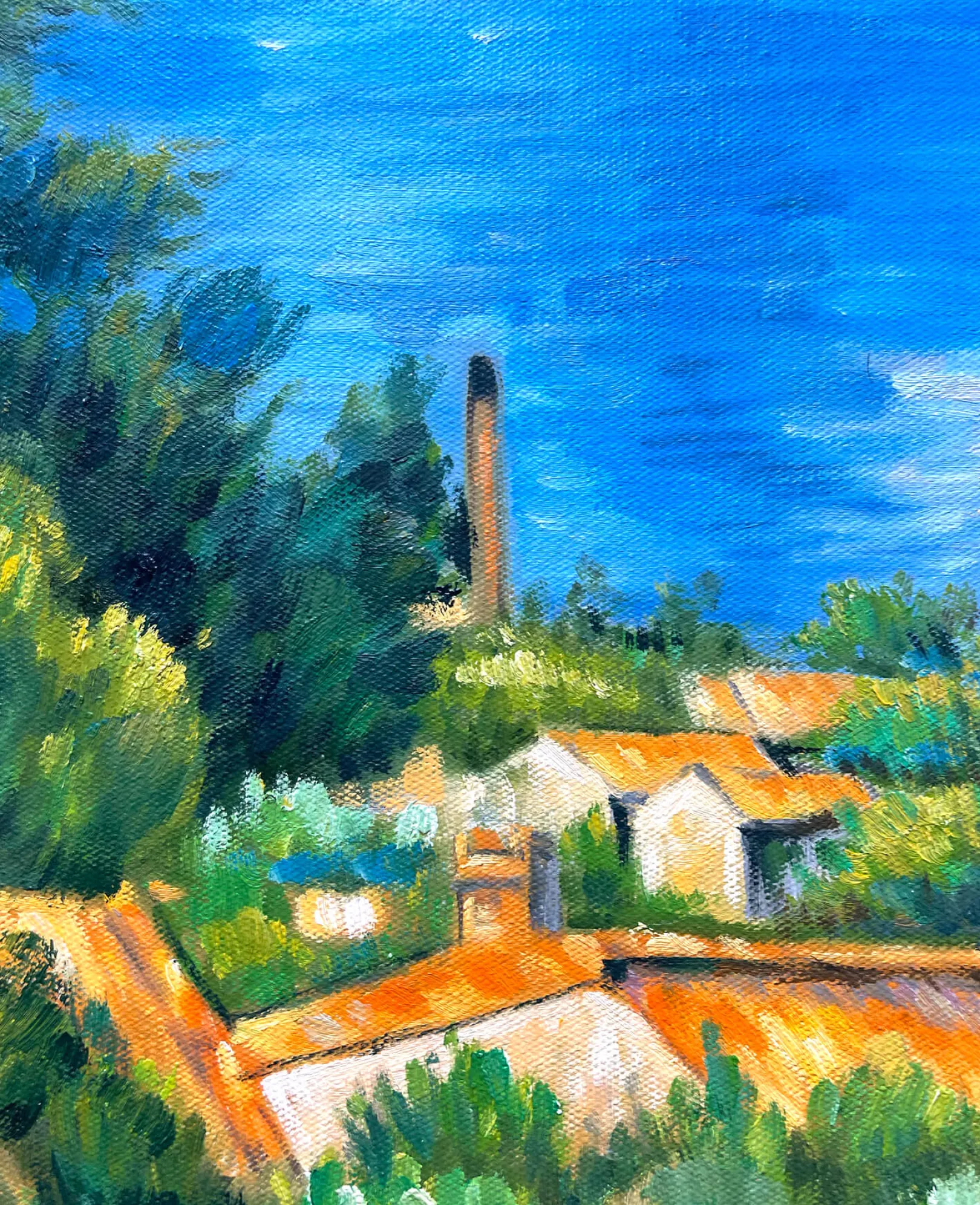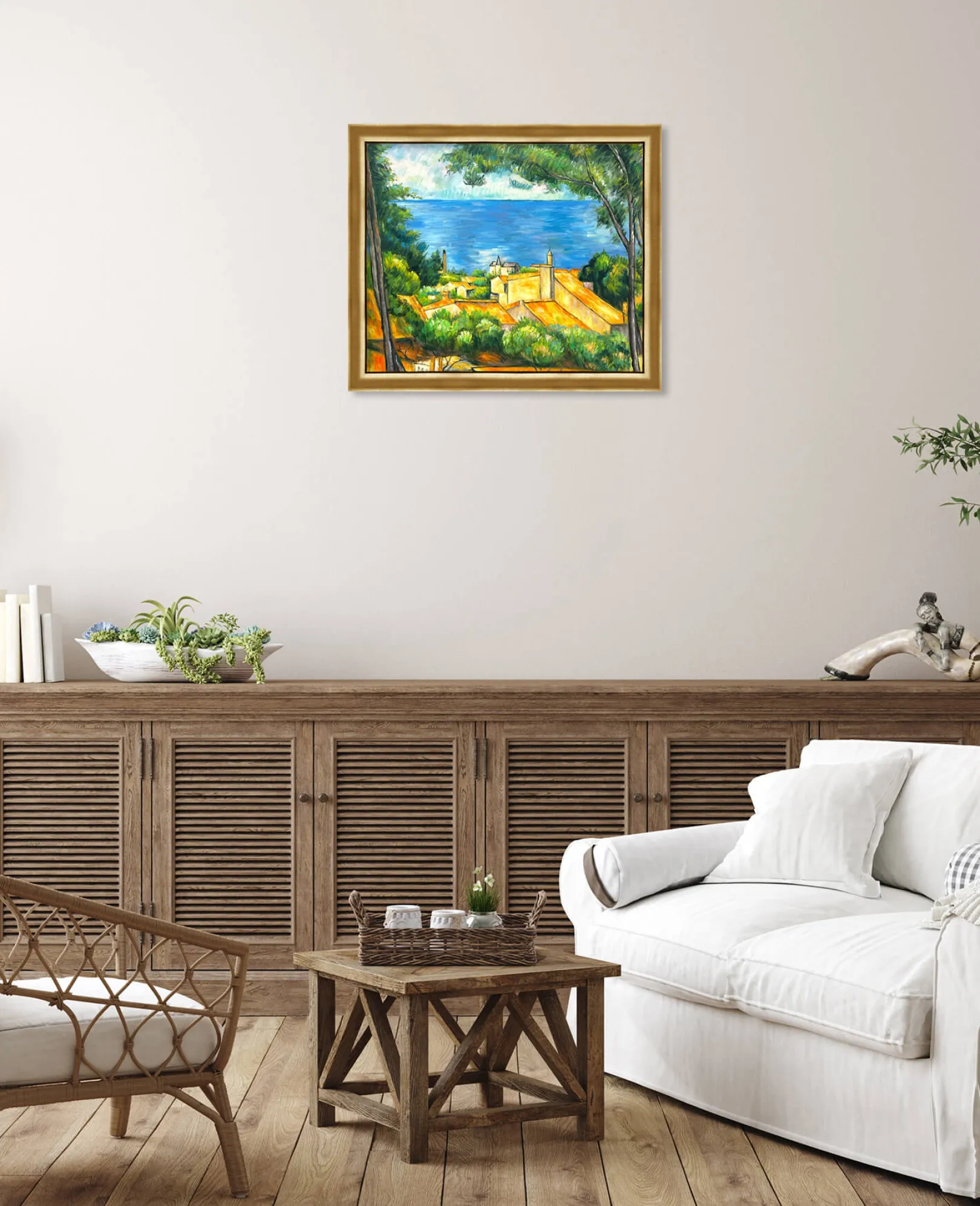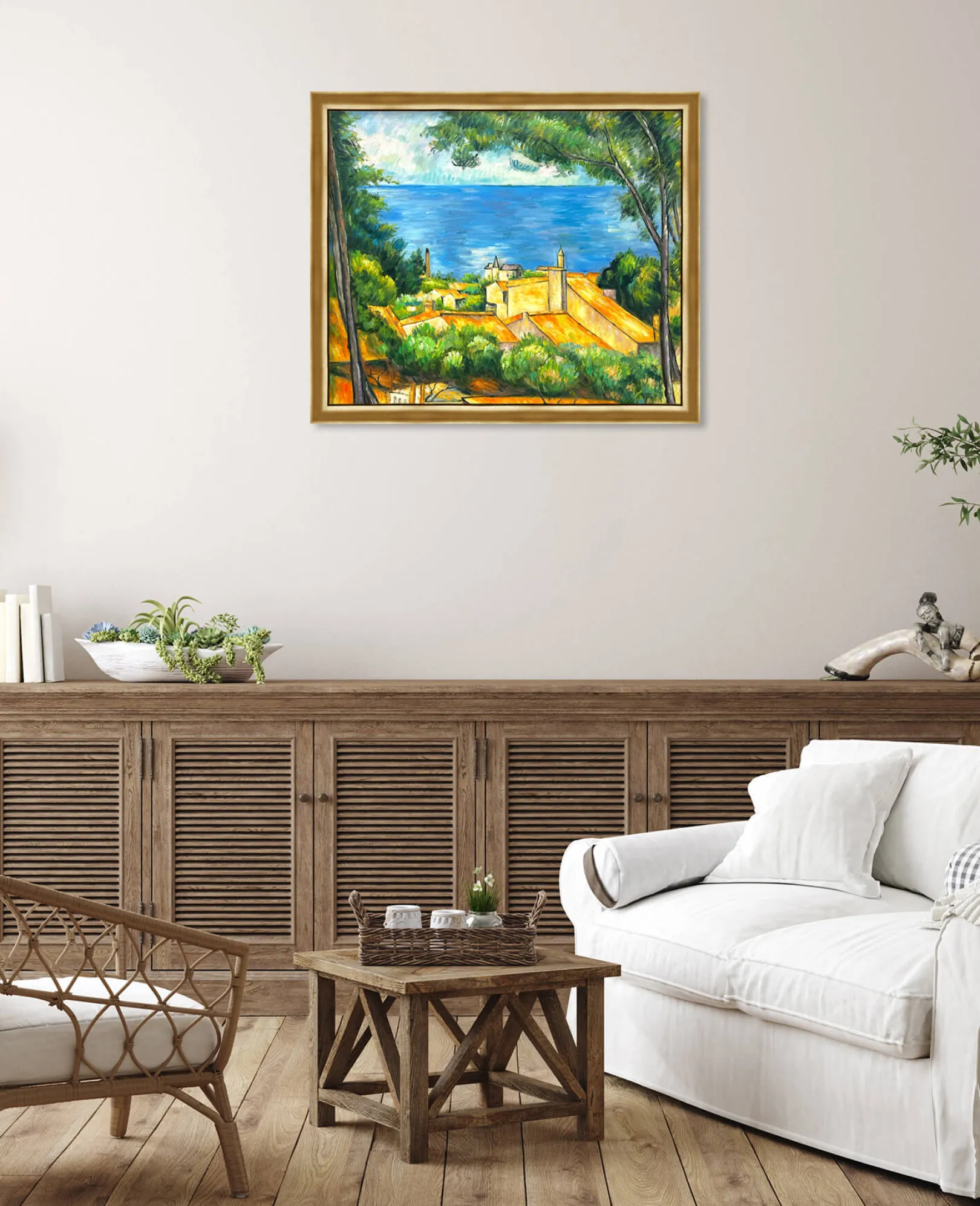 Dieses impressionistische Ölgemälde auf Leinwand, das Ende des 19. Jahrhunderts entstand, ist eines der Bilder, die Paul Cézanne während eines Aufenthalts in seiner Heimat Provence malte. Es ist eine Hommage an die Pracht von Estaque, einem Stadtteil von Marseille mit einer ruhigen Atmosphäre und einer typisch mediterranen Vegetation. Die Aleppo-Kiefern blicken friedlich auf die roten Dächer der Häuser, die den Strand säumen.