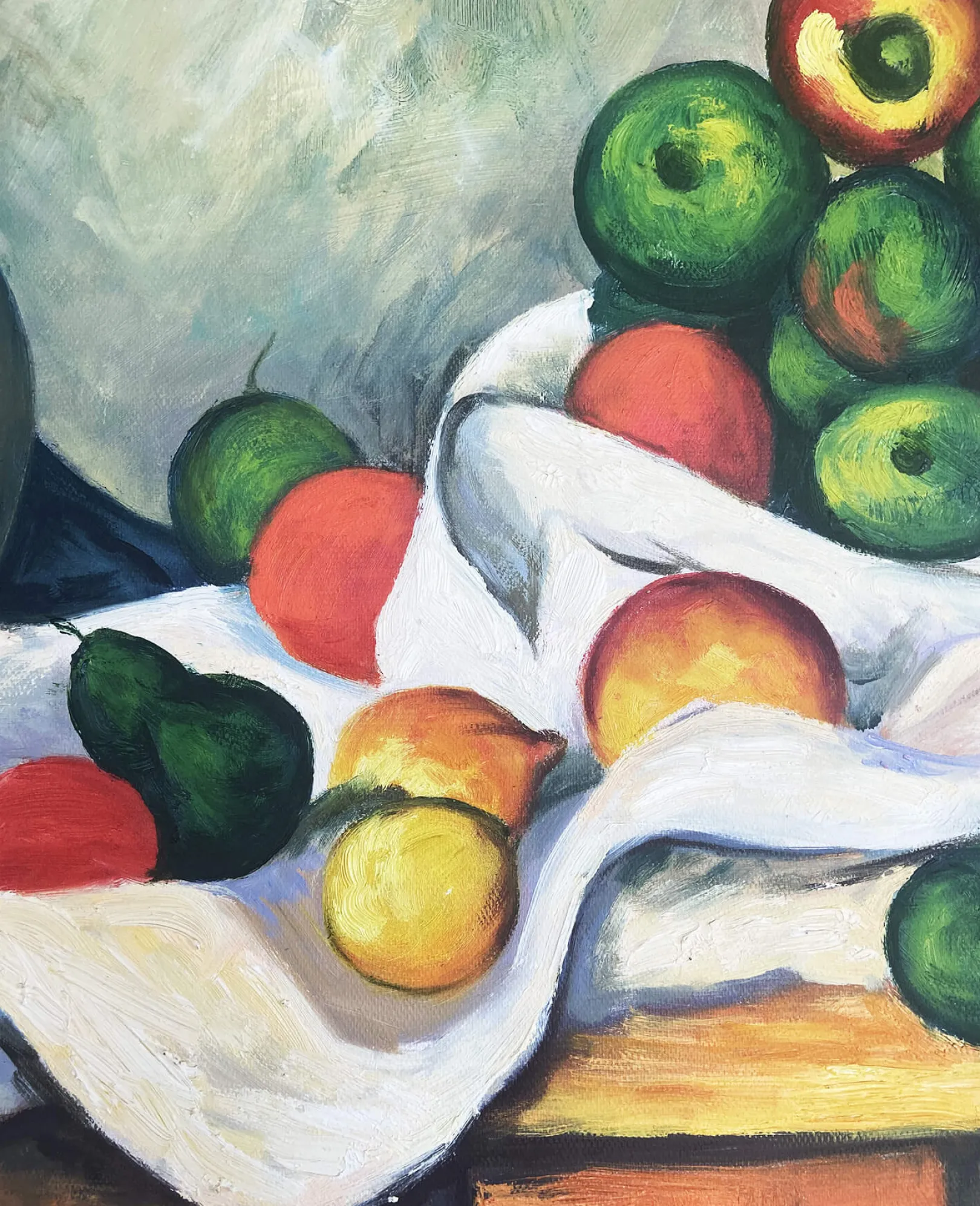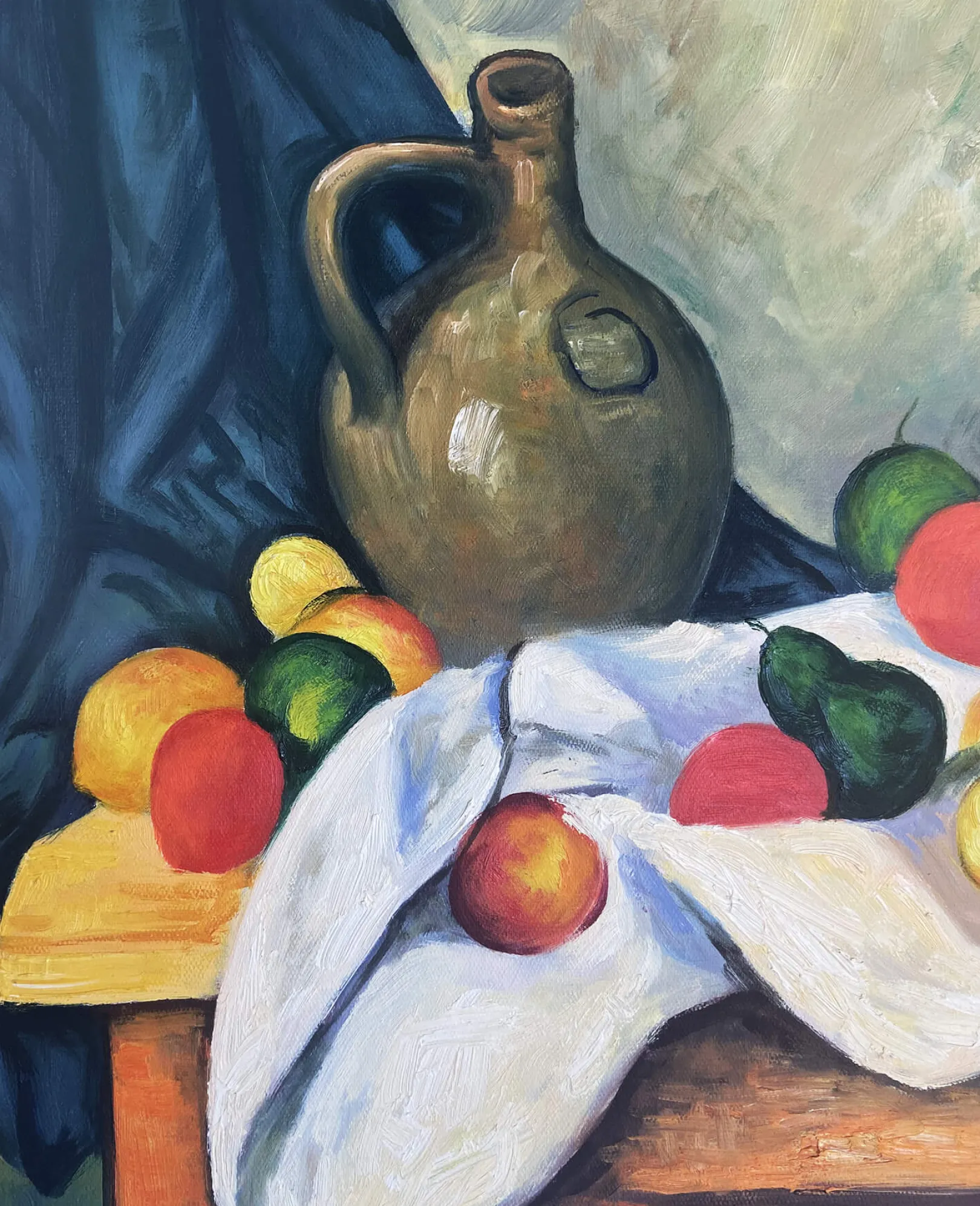 Dieses subtile und zugleich kraftvolle Gemälde von Paul Cézanne hat die ernste Ausstrahlung eines Meisterwerks. Die Konturen sind ausgefeilt und der Schatten ist tief. Durch die Farbe, die ihre eigenen Punkte hat, überlappen sich die Symmetrien der Objekte und resultieren in einer Rivalität der Achsen, die einem statischen Ganzen den Eindruck eines geheimen Lebens verleiht.& Ein weiteres Bild aus dieser Serie des Künstlers ist Der Apfelkorb.
