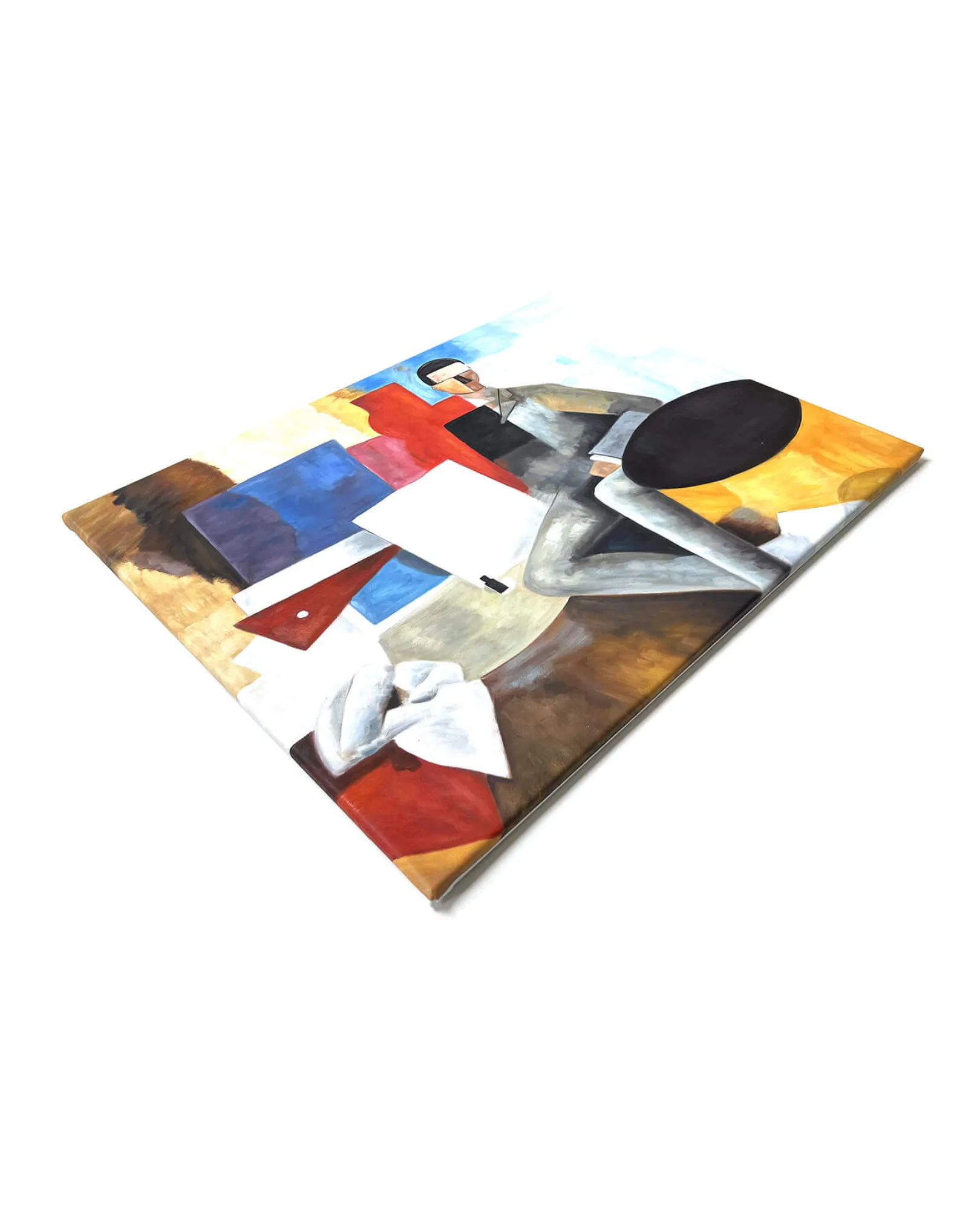 Das als Selbstporträt betrachtete Werk „Sitzender Mann“ stellt einen wichtigen Schritt in La Fresnayes Schaffen vor dem Krieg dar. Der linke Teil des Gemäldes, das geometrisierte Stillleben, ist Gegenstand eines weiteren Gemäldes mit dem Titel „Stillleben im Winkelmaß“ . Der andere Teil des Gemäldes ist einer Figur mit undefiniertem Gesicht nach kubistischer Norm gewidmet, die die gesamte Höhe des Gemäldes einnimmt, in einer frontalen Position und in einer Umgebung, in der sich Kurven und rechteckige Formen überschneiden, die von Flächen aus Primärfarben begrenzt werden, die den Hintergrund zerschneiden. Diese von einem Streben nach Harmonie beherrschte Komposition wird durch die Farbe geschickt strukturiert und durch die unvollendeten Teile beleuchtet.
