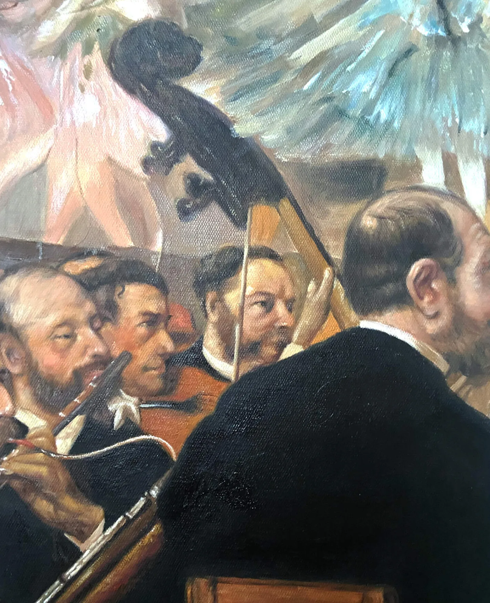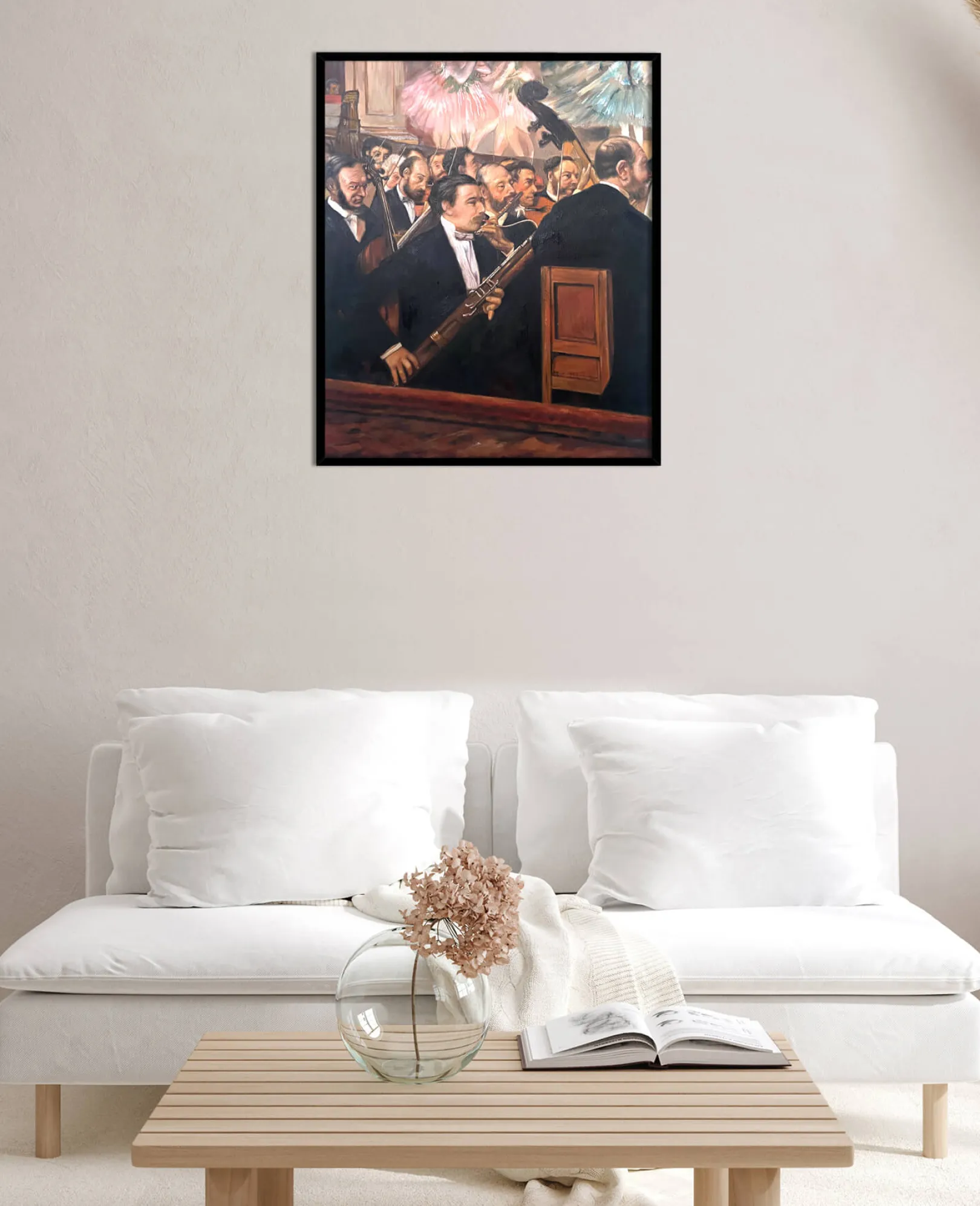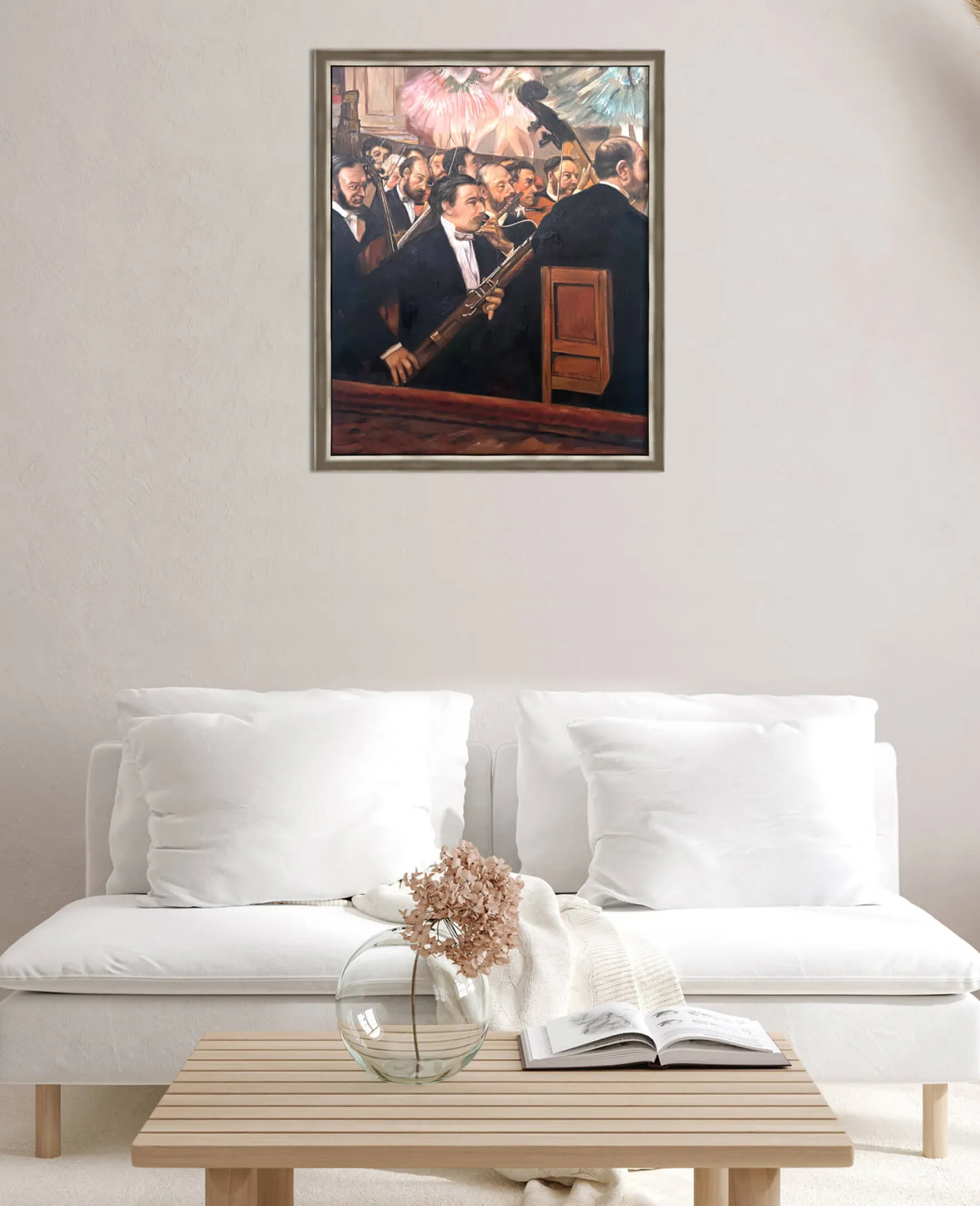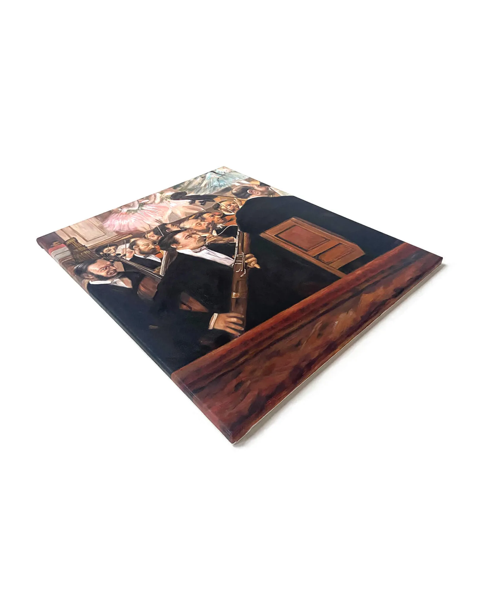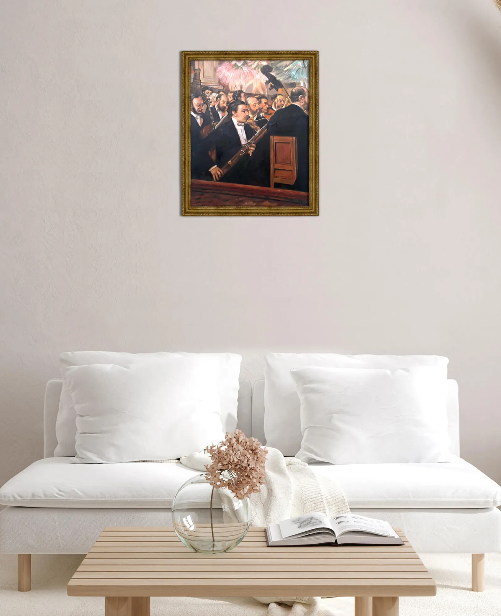 Als Edgar Degas dieses Bild malte, kannte er die Pariser Oper gut. Man würde sich jedoch täuschen, wenn man glaubte, in diesem Gemälde eine realistische Darstellung des Orchesters der Pariser Oper im Jahr 1870 zu sehen. Abgesehen davon, dass mehrere der abgebildeten Personen keine Instrumentalisten waren, setzte Degas, um seinen Freund, den Fagottisten Désiré Dihau, hervorzuheben, diesen in die erste Reihe, während das Fagott normalerweise hinter den Celli und Kontrabässen platziert wurde. Eine ebenso bewusste Änderung wie der sehr originelle Bildausschnitt des Gemäldes, der das Orchester von schräg oben zeigt und von den Tänzerinnen nur die Beine und die Tutus zeigt.