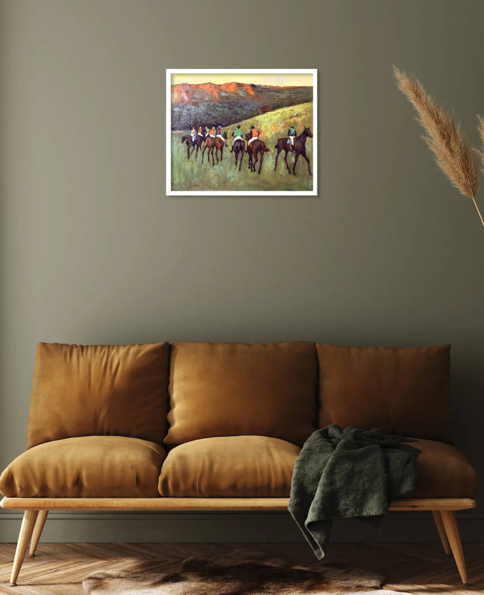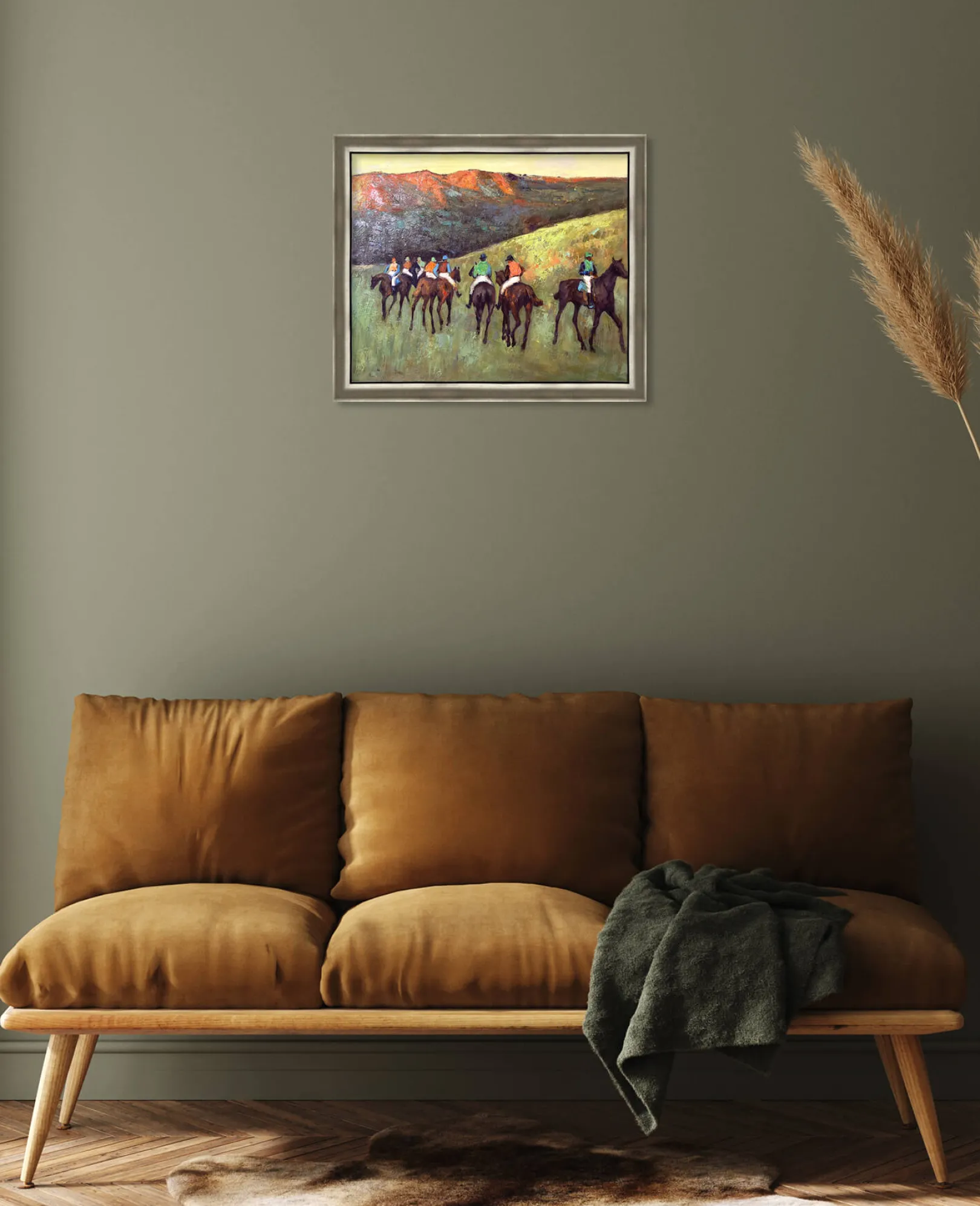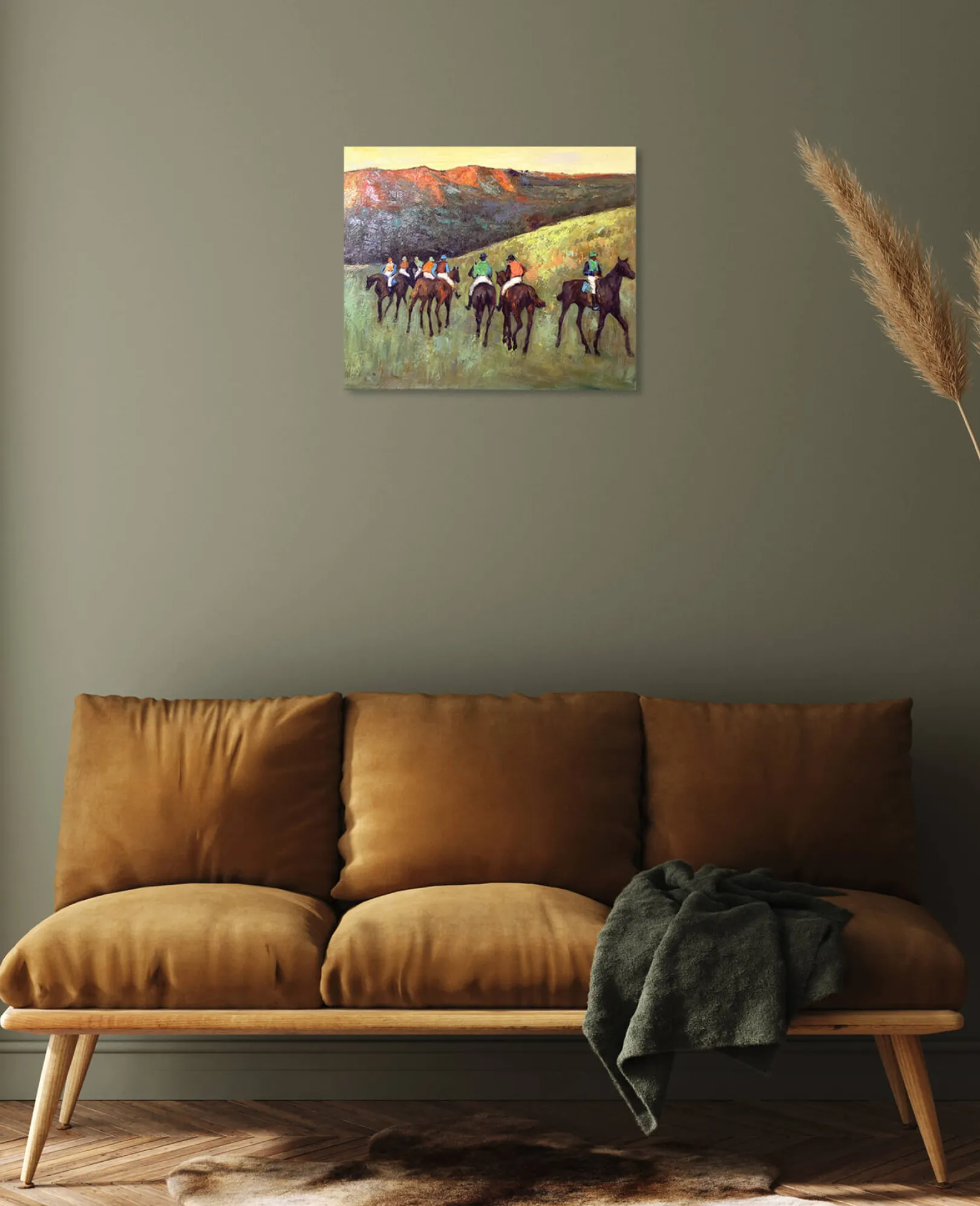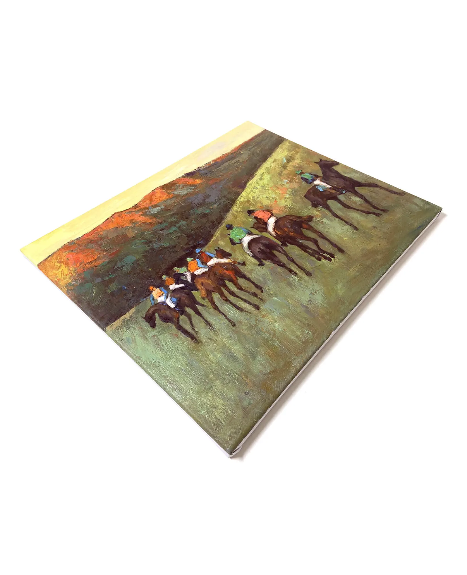 Ende des 19. Jahrhunderts wurden Pferderennen in Frankreich zu einem Volkssport. Der leidenschaftliche Edgar Degas schuf eine bedeutende Serie von Gemälden zum Thema Pferderennen, die er „Scènes de vie moderne“ (Szenen des modernen Lebens) nannte. Ob auf der Rennbahn oder auf den Feldern, Degas zeigte die Macht und das Prestige dieser Rennen in seiner Zeit. Hier schildert der Künstler Reiter, die sich inmitten einer weiten Landschaft im Licht der Dämmerungssonne auf ein Rennen vorbereiten. Degas lässt seinem Talent als Kolorist und seinem Einfluss von Paul Gauguin freien Lauf.