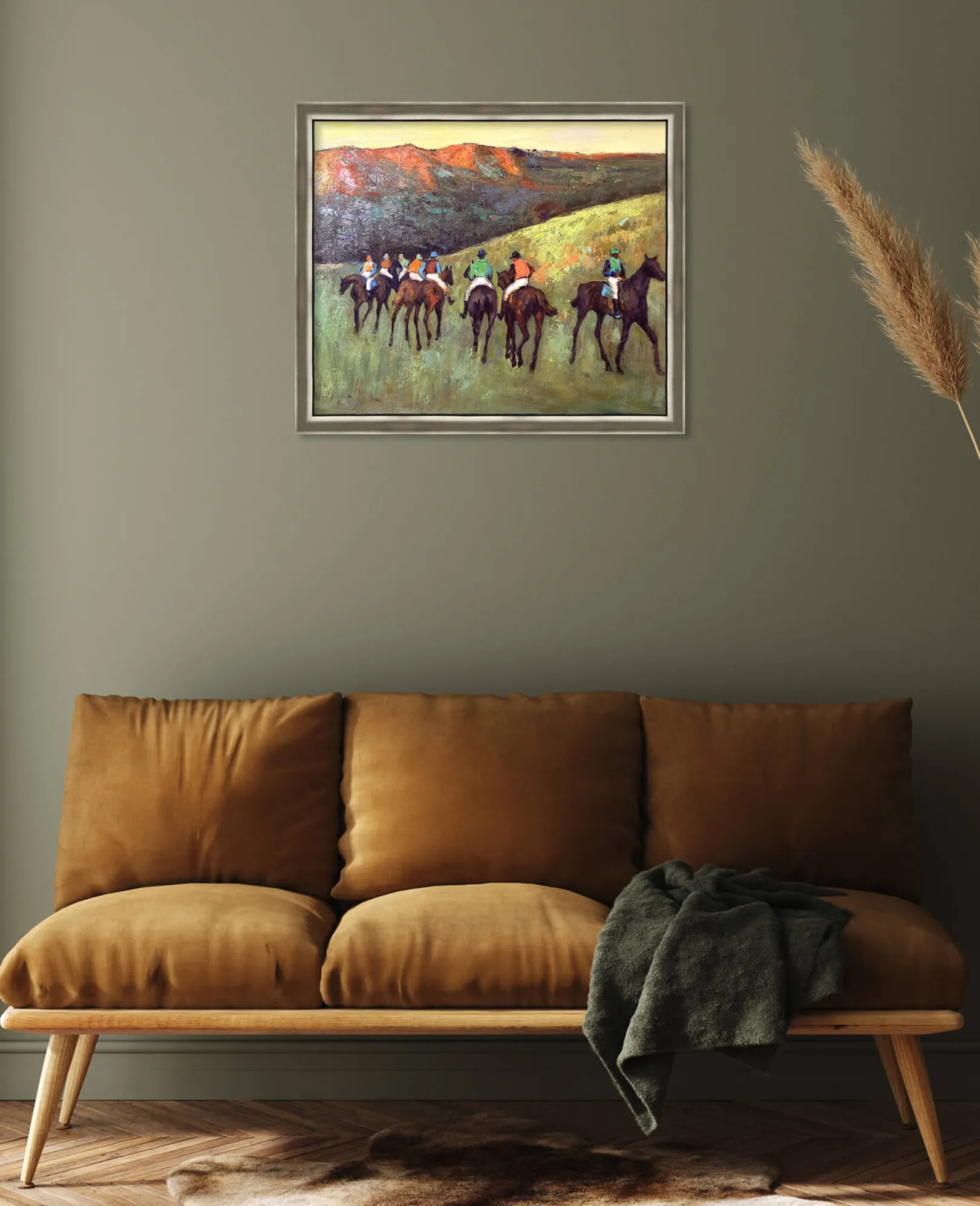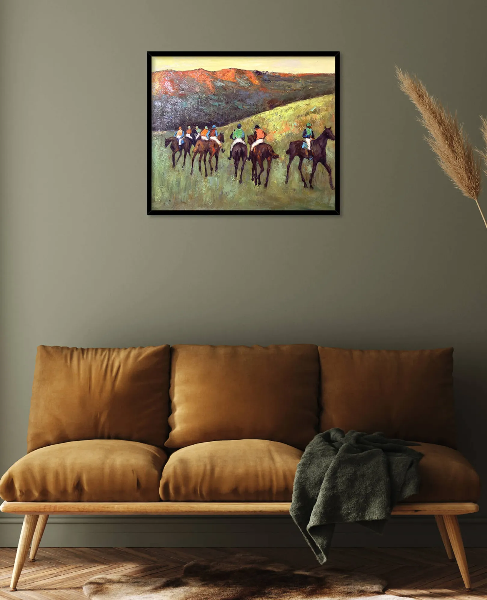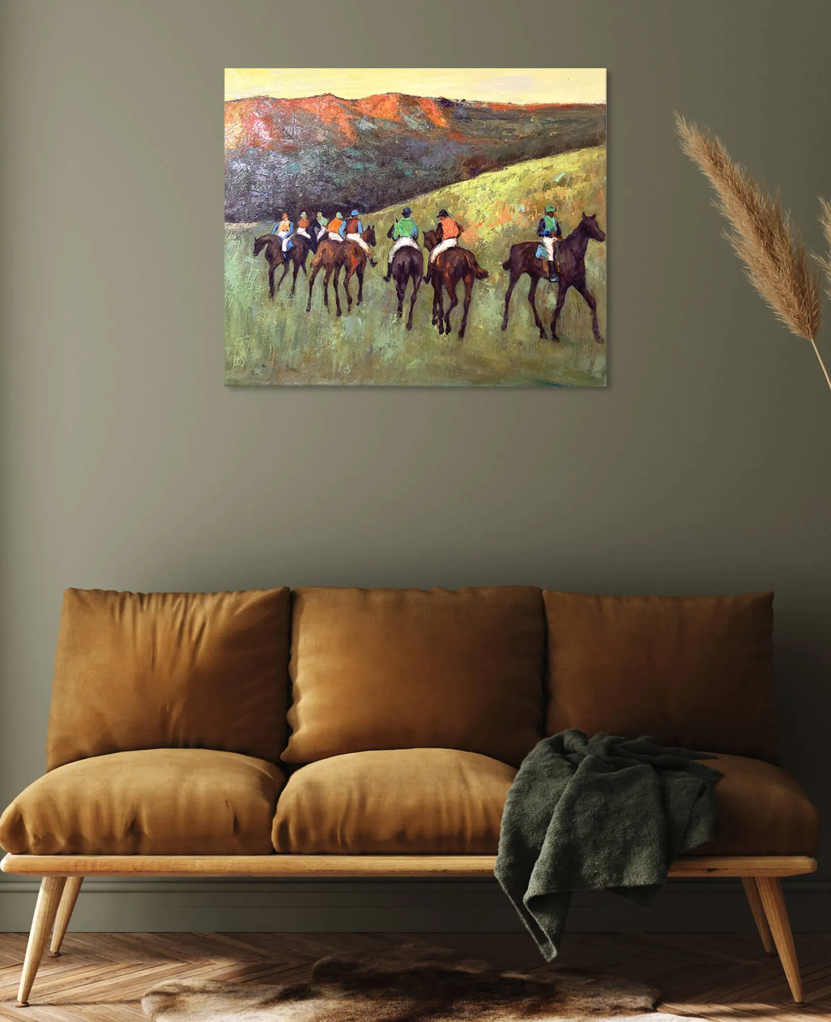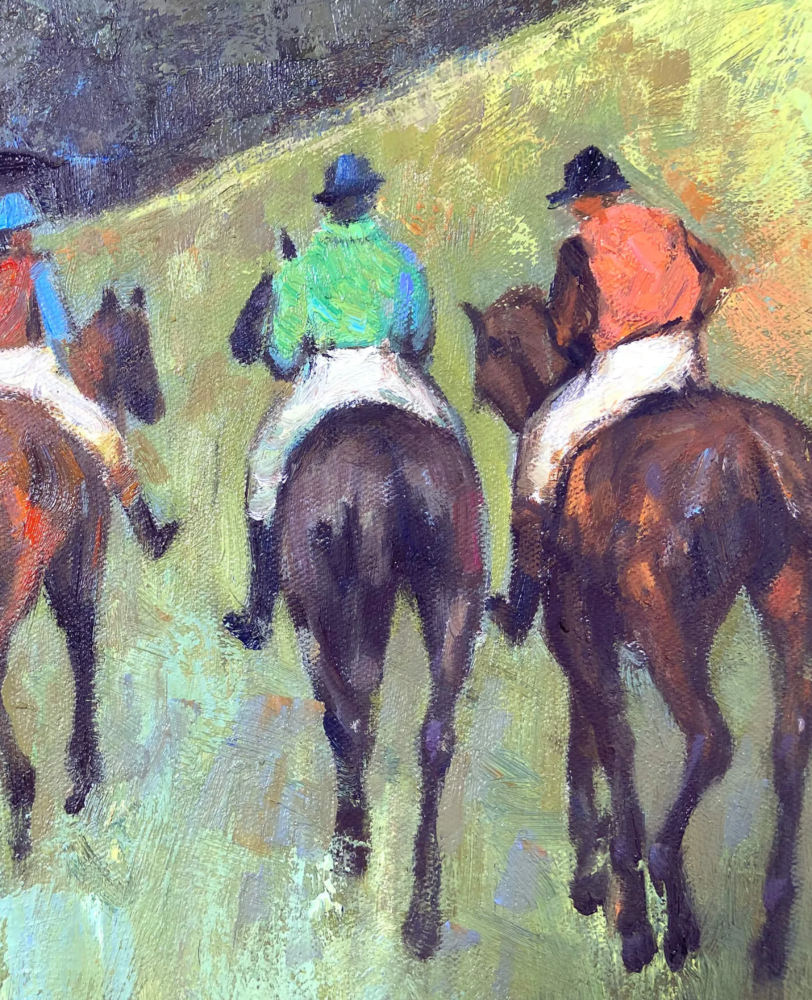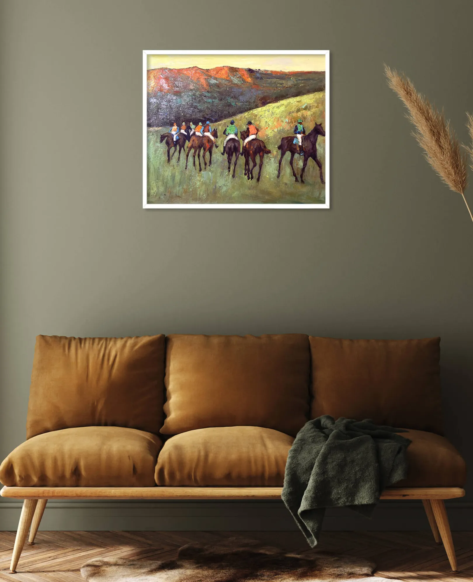 Ende des 19. Jahrhunderts wurden Pferderennen in Frankreich zu einem Volkssport. Der leidenschaftliche Edgar Degas schuf eine bedeutende Serie von Gemälden zum Thema Pferderennen, die er „Scènes de vie moderne“ (Szenen des modernen Lebens) nannte. Ob auf der Rennbahn oder auf den Feldern, Degas zeigte die Macht und das Prestige dieser Rennen in seiner Zeit. Hier schildert der Künstler Reiter, die sich inmitten einer weiten Landschaft im Licht der Dämmerungssonne auf ein Rennen vorbereiten. Degas lässt seinem Talent als Kolorist und seinem Einfluss von Paul Gauguin freien Lauf.