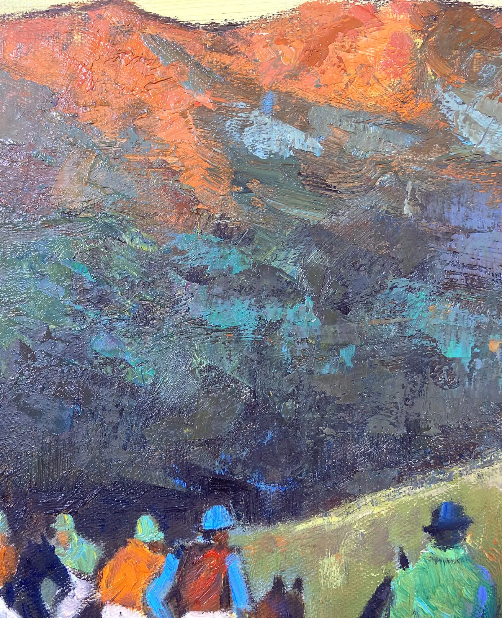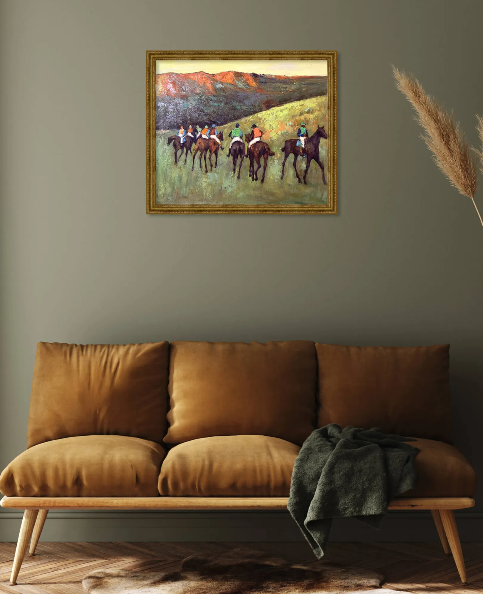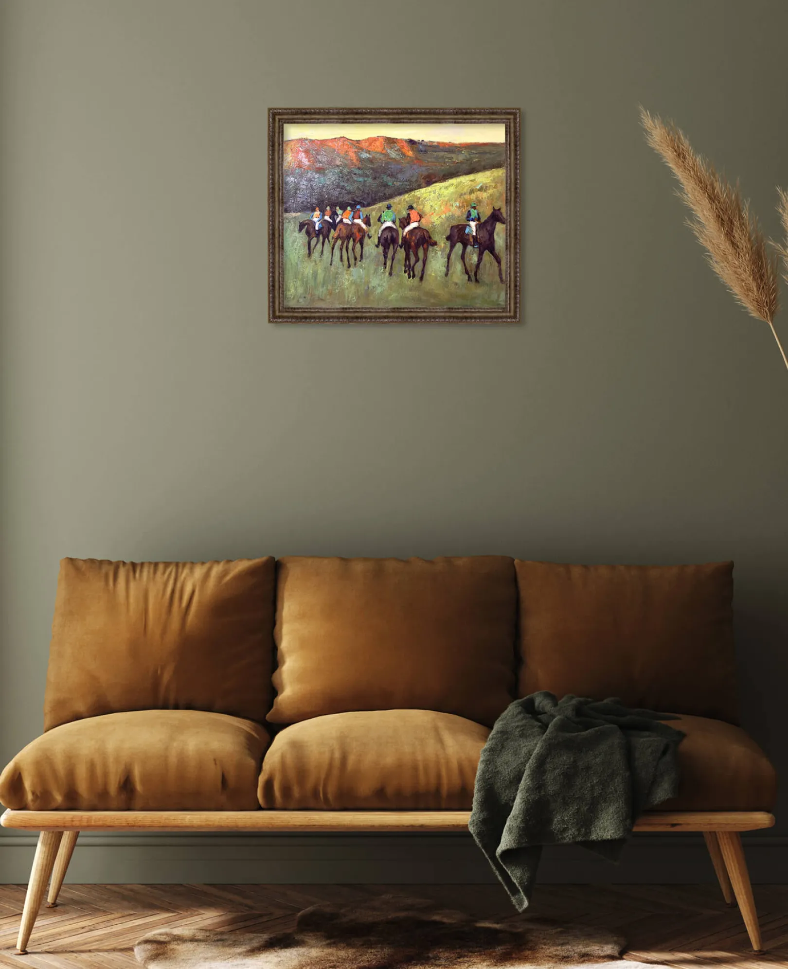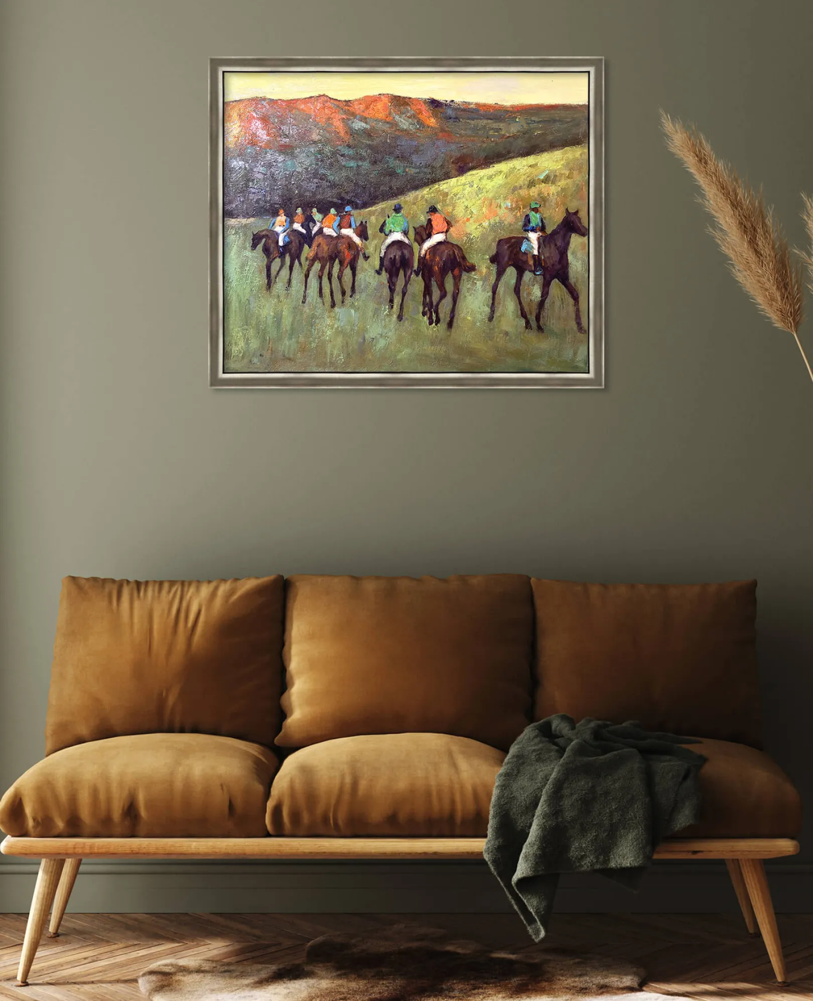 Ende des 19. Jahrhunderts wurden Pferderennen in Frankreich zu einem Volkssport. Der leidenschaftliche Edgar Degas schuf eine bedeutende Serie von Gemälden zum Thema Pferderennen, die er „Scènes de vie moderne“ (Szenen des modernen Lebens) nannte. Ob auf der Rennbahn oder auf den Feldern, Degas zeigte die Macht und das Prestige dieser Rennen in seiner Zeit. Hier schildert der Künstler Reiter, die sich inmitten einer weiten Landschaft im Licht der Dämmerungssonne auf ein Rennen vorbereiten. Degas lässt seinem Talent als Kolorist und seinem Einfluss von Paul Gauguin freien Lauf.