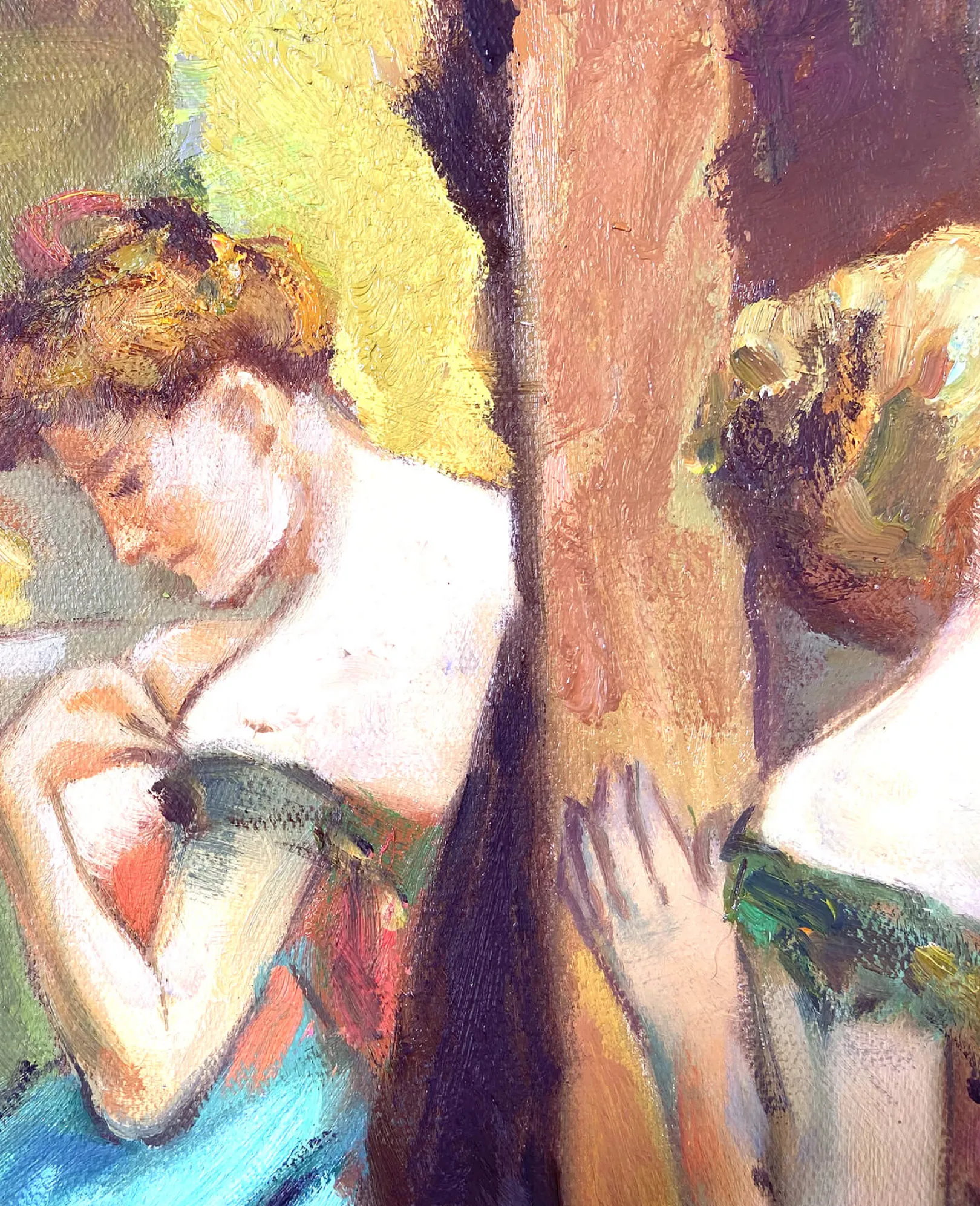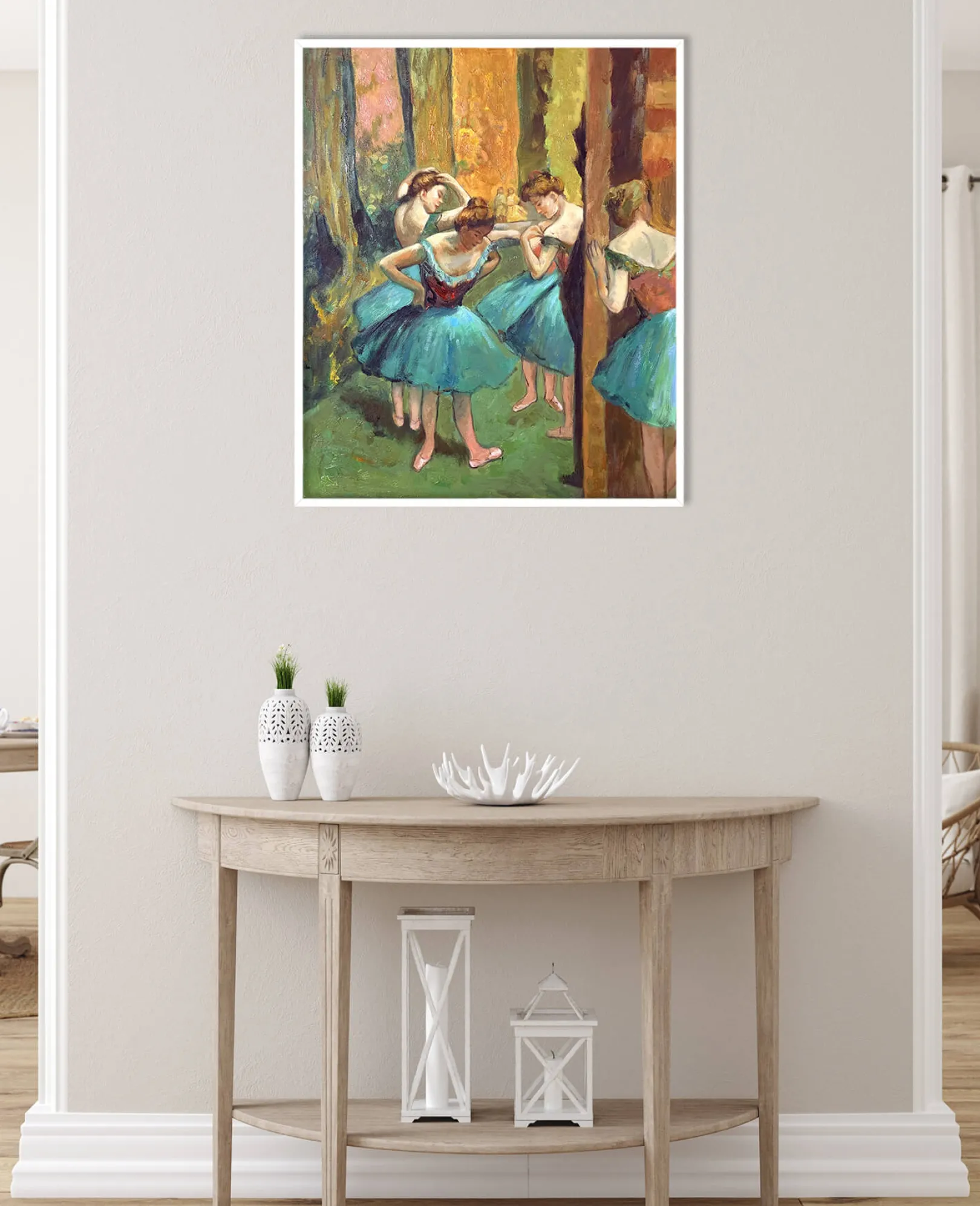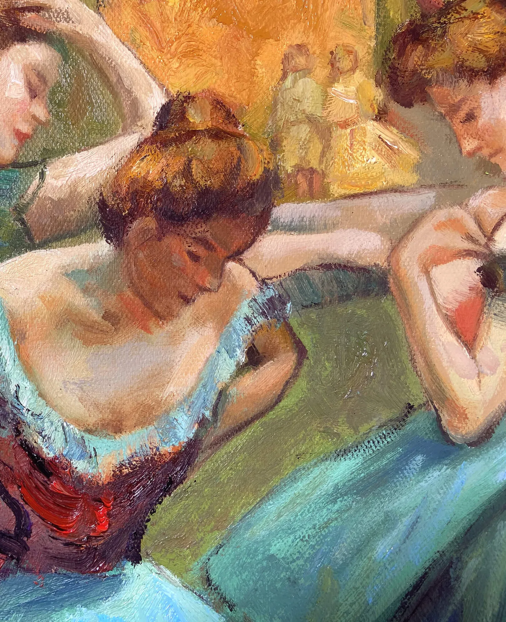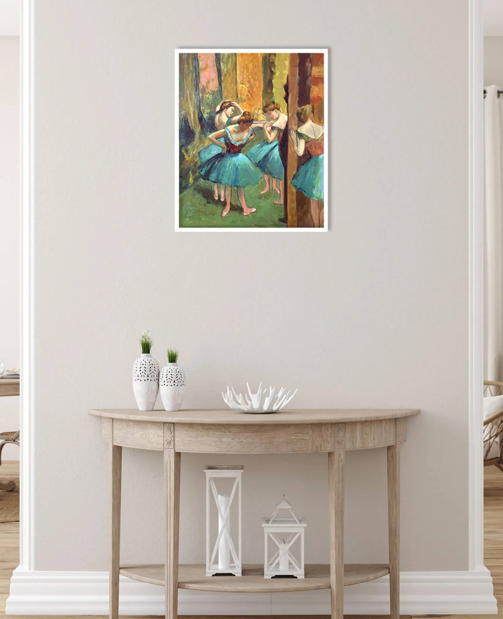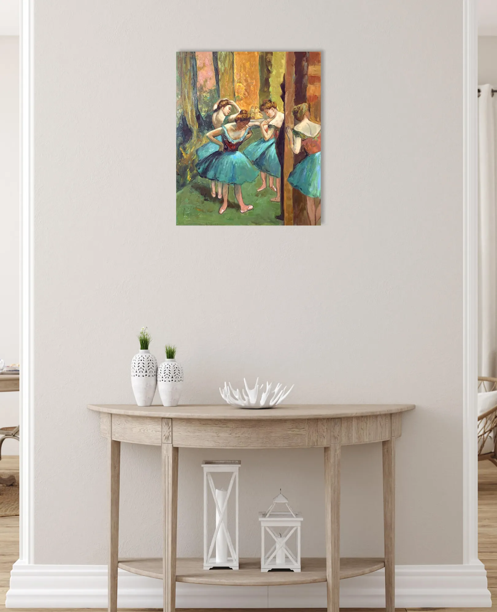 Edgar Degas machte in den 1860er Jahren die Pariser Oper zum Hauptthema seiner Arbeiten. Er erkundete die verschiedenen Momente und Räume der Oper: das regelmäßige Training, die Kulissen und die Bühne. Hier beherrscht der Künstler die elliptischen Verkürzungen und die Praxis der Nahaufnahmen. Er versteht es, eine Reihe von Bewegungen zusammenzufassen, die durch eine immer kursivere Zeichnung angedeutet werden, die der Malerei einen überraschenden Ausdruckswert verleiht.& In seiner Serie der Tänzerinnen finden wir auch Blaue Tänzerinnen, Ballerinas, die ihre Kleider anpassen, und Tänzerinnen in Rosa und Grün.