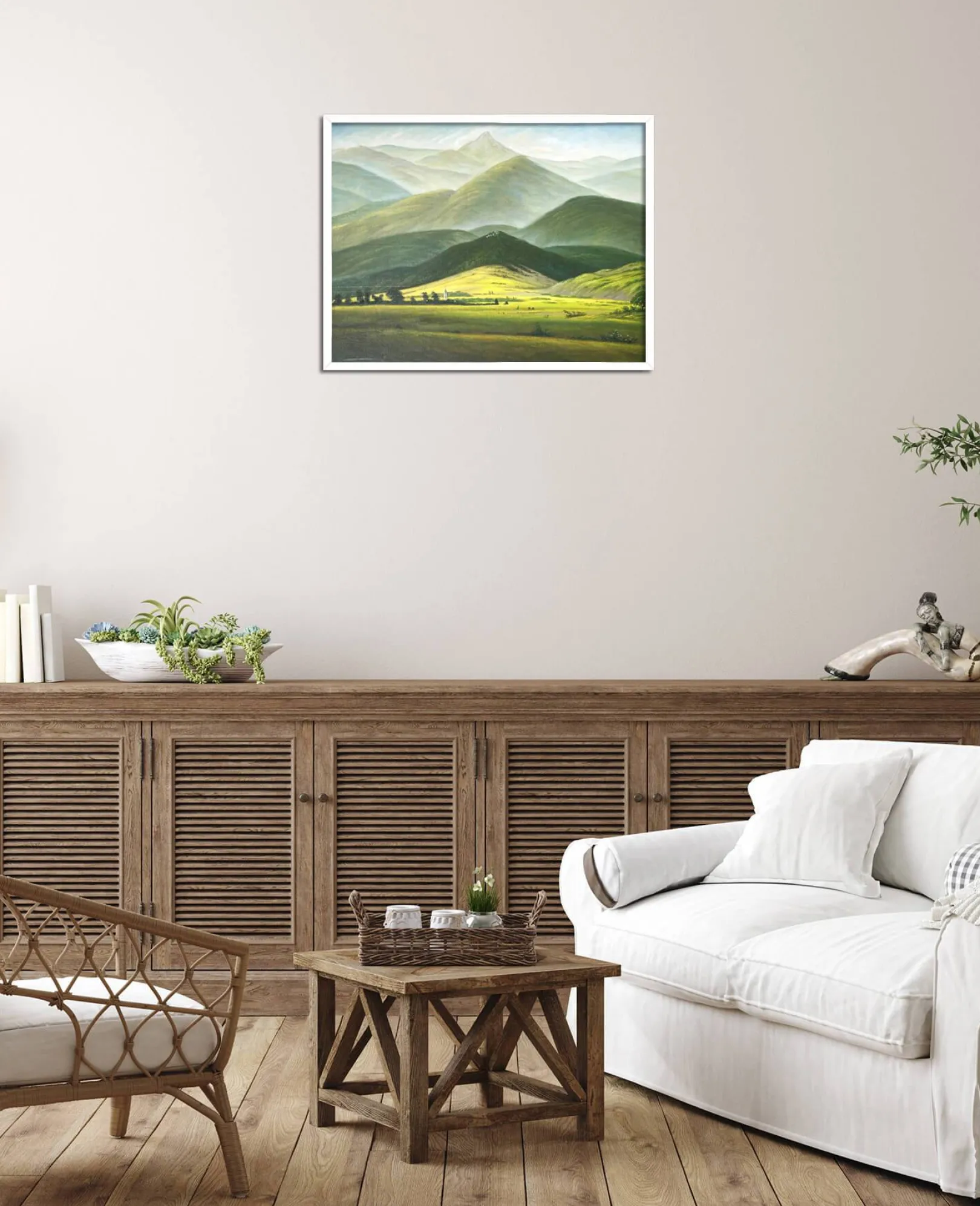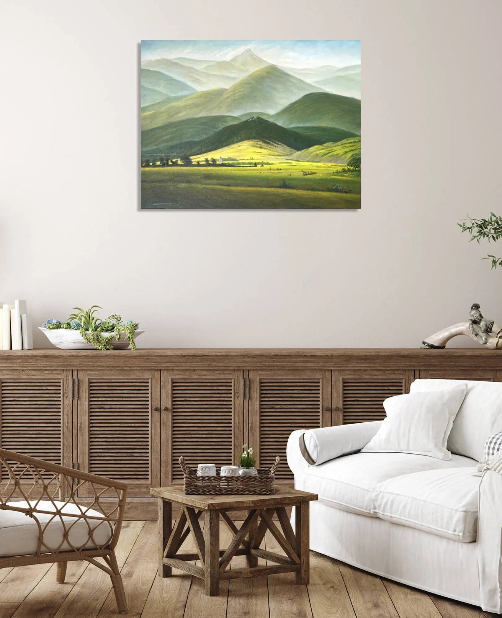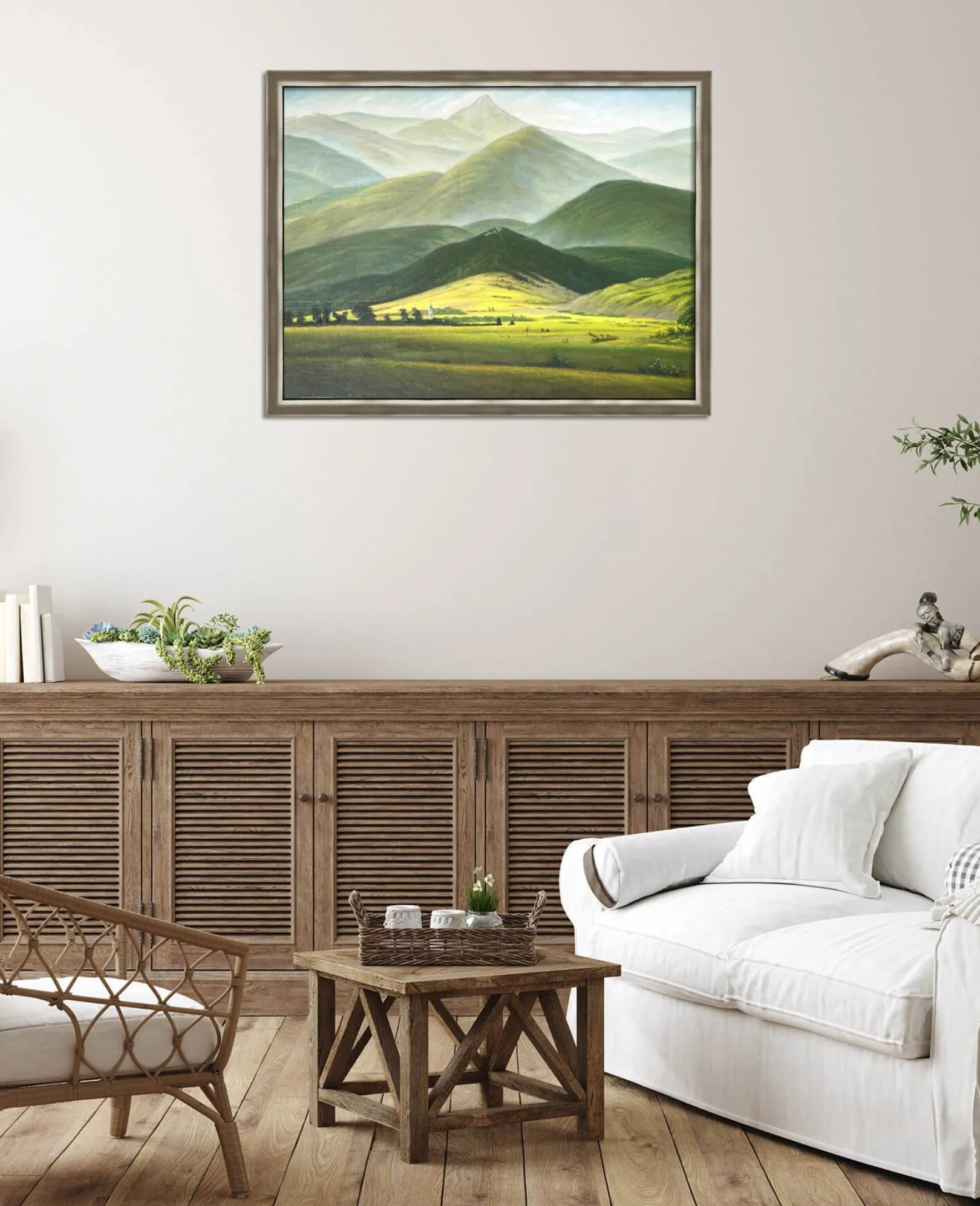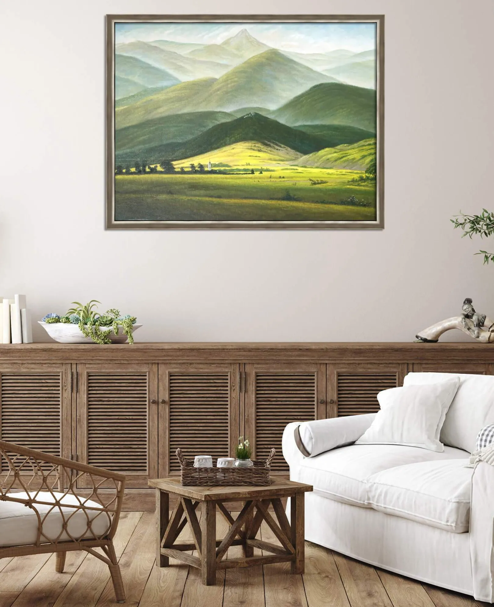 Aus der göttlichen Schöpfung hervorgegangen, ist die Natur laut Caspar David Friedrich der Treffpunkt zwischen dem Menschlichen und dem Göttlichen. Der Kirchturm einer Kirche ist in der grünen Ebene erkennbar, die einzige Spur menschlicher Aktivität, die den Kontakt zu Gott sucht. Die Tiefenwirkung in diesem Gemälde ist überwältigend. Dank der immer heller werdenden, verwischten und lichtdurchfluteten Farben blickt der Betrachter auf eine grandiose Landschaft, die unendlich und unerreichbar erscheint, wie das Abbild des Göttlichen.