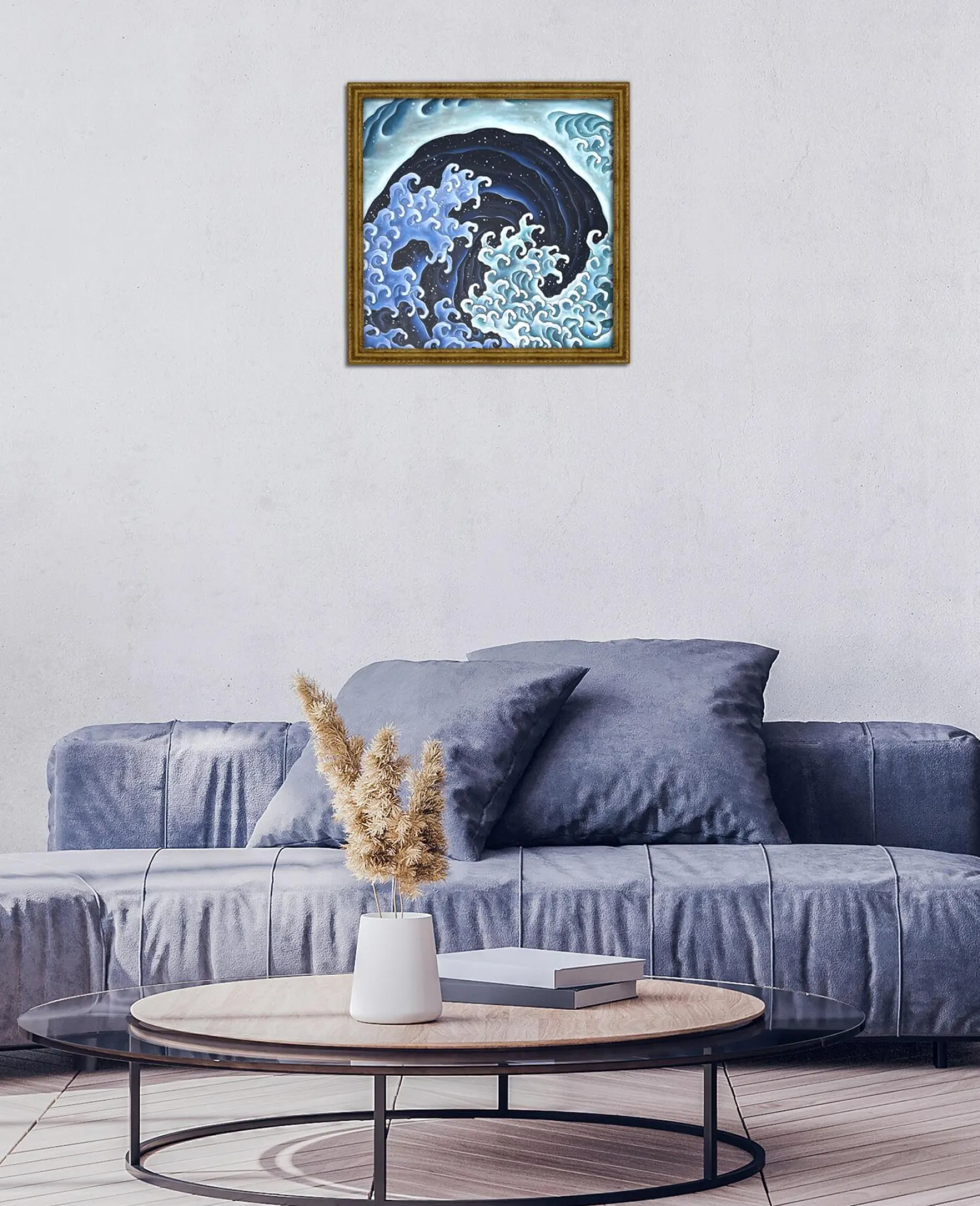 Katsushika Hokusai war von den wechselnden Aspekten des flüssigen Elements fasziniert. Mit dieser Darstellung einer Welle, die verschiedene Blautöne und hellere, schaumige Farbtöne enthält, hält er einen Moment fest, der für immer eingefroren bleibt. Der Blick des Betrachters wird von der Intimität dieser brechenden Welle verschluckt, deren dunklere Töne eine unendliche Tiefe heraufbeschwören. Die unzweifelhaft weibliche Gesamtform, die eher eiförmig und umhüllend ist, bildet einen schützenden Kokon, ähnlich wie der gebärende Mutterschoß.& Das Werk steht im Gegensatz zu Männerwelle desselben Künstlers.