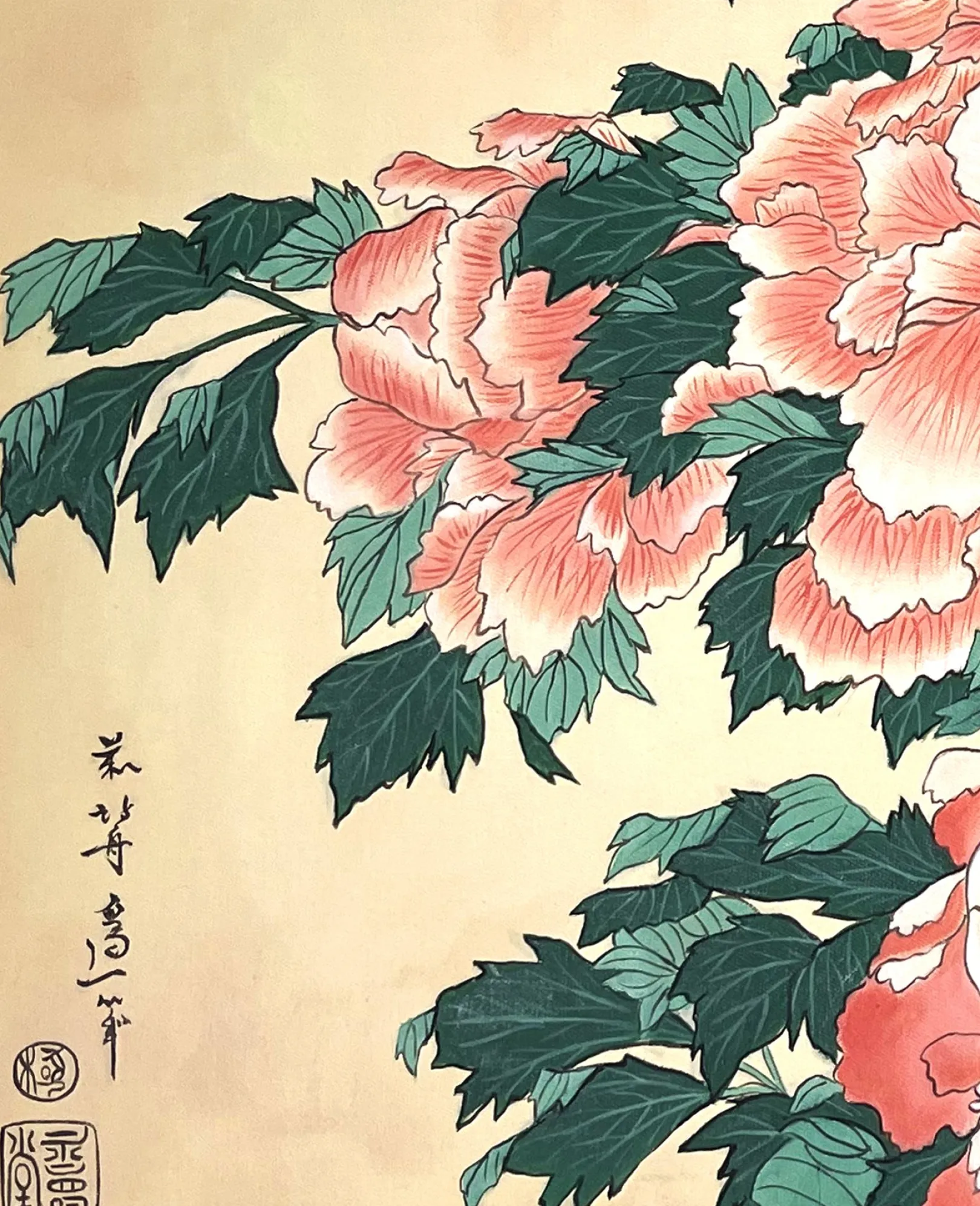 Katsushika Hokusai arbeitet in diesem fein gezeichneten Werk, das ursprünglich ein Kupferstich war, mit Rosa und Grün. Diese Farben, die durch Abstufungen zart nuanciert oder durch dunklere Töne radikal kontrastiert werden, verleihen den Pfingstrosen Volumen und Lebendigkeit. Ein um die Blüten kreisender Schmetterling trägt dazu bei, die Idee der Bewegung zu betonen und macht die Komposition poetisch lebendig. Eine elegante, subtil luftige Harmonie geht von diesem berührenden, von der Natur inspirierten Gemälde aus.& Das Werk erinnert uns an Kanarienvogel und Pfingstrosen.