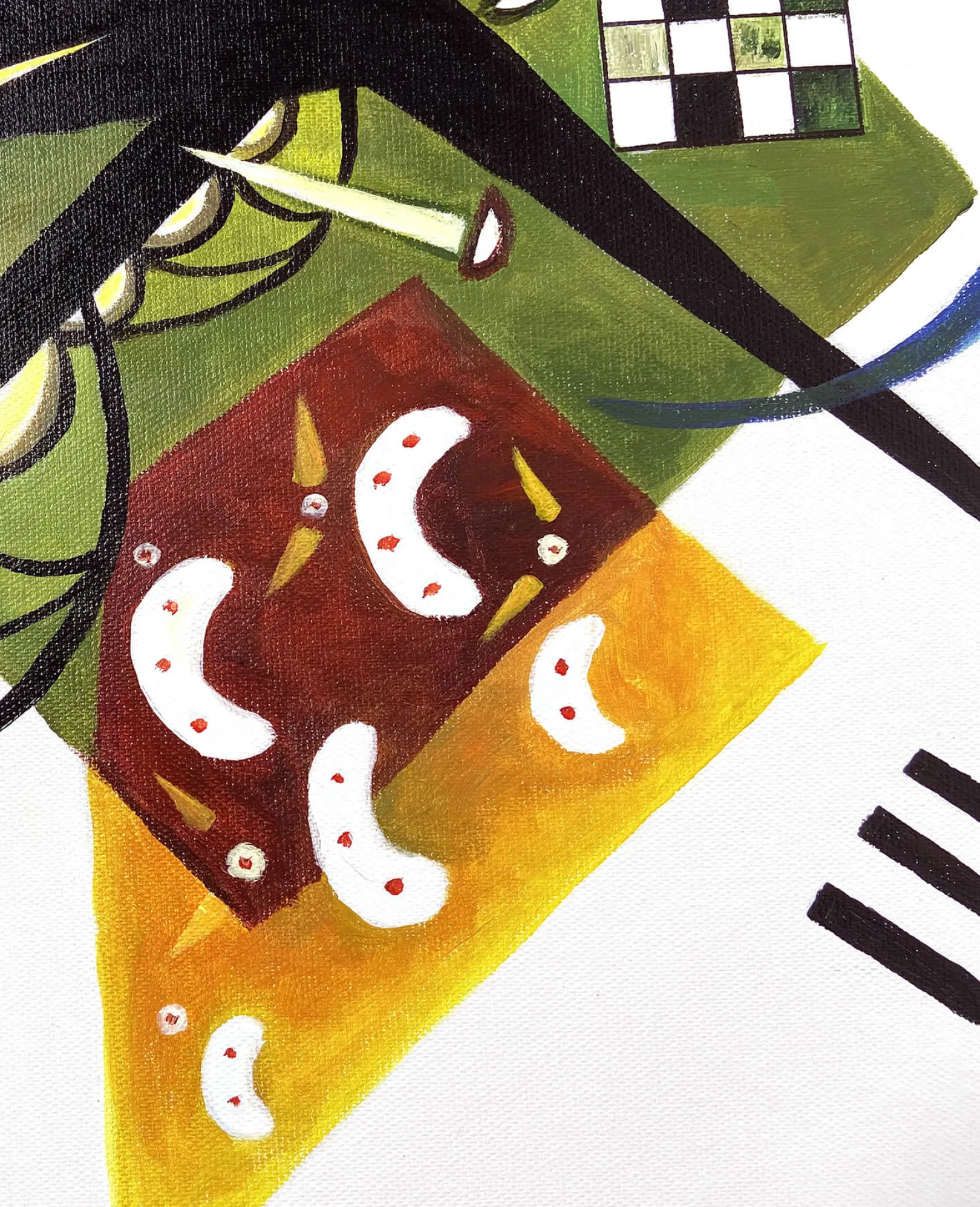 Dieses Werk von Wassily Kandinsky ist eine Ansammlung schwebender geometrischer Formen. Wir erleben die Spannung zwischen zwei Diagonalen, die mit Schachbrettern, Dreiecken und drei schwarzen Linien punktiert sind. Die vielen Farben in dieser Komposition sowie die Überlagerung der Formen lassen den Raum unendlich erscheinen und schaffen Abstraktion.