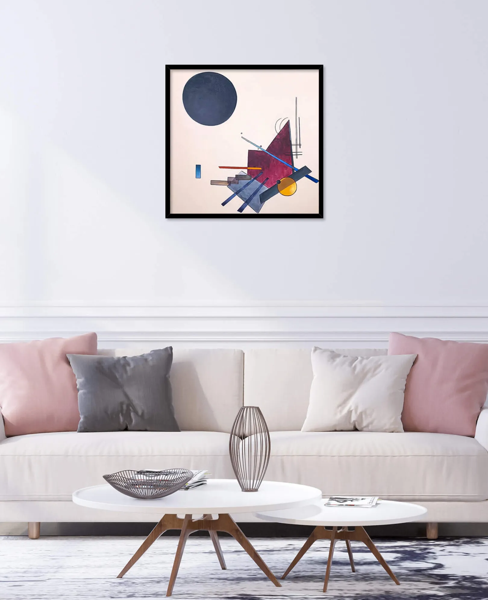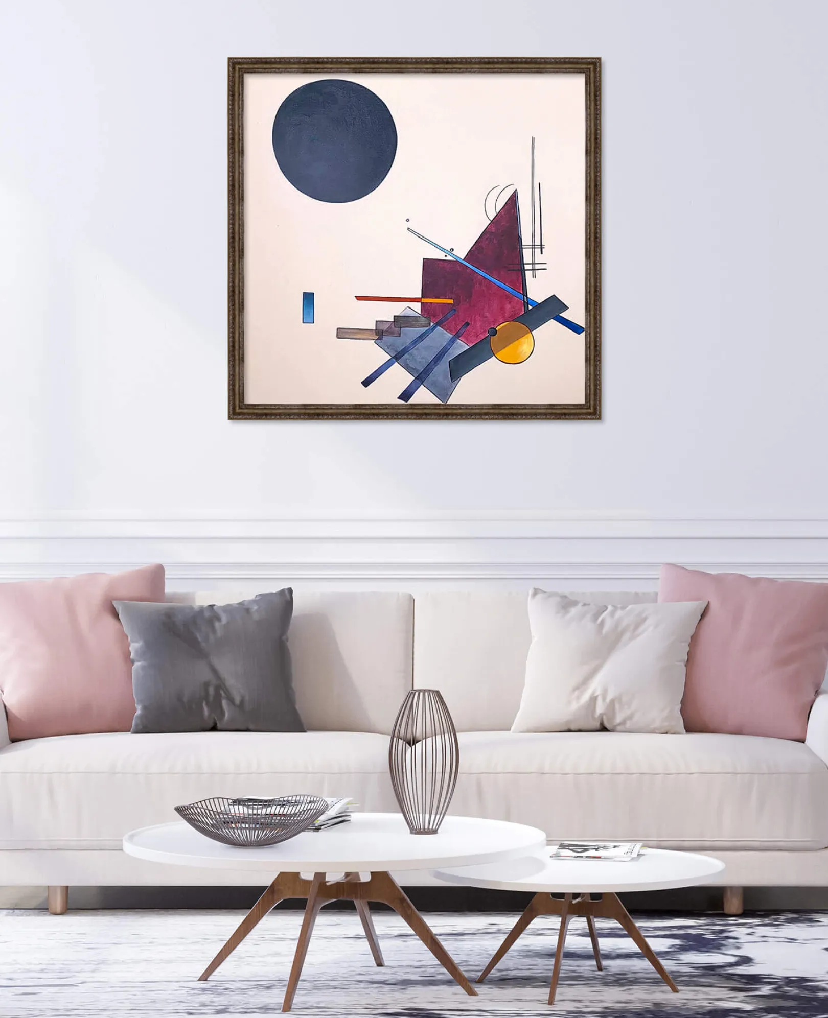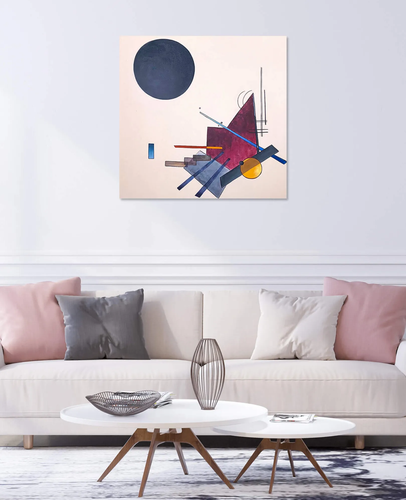 Die schwarze Kreisform dominiert dieses& abstrakte Werk. Sie stellt ein kontrastreiches Verhältnis zu den mehrfarbigen geometrischen Elementen her. Nicht wegen seiner geometrischen Form beschreibt Wassily Kandinsky den Kreis als „kosmische Verbindung“, als „intensive Wahrnehmung der inneren Kraft in ihren unzähligen Variationen“.