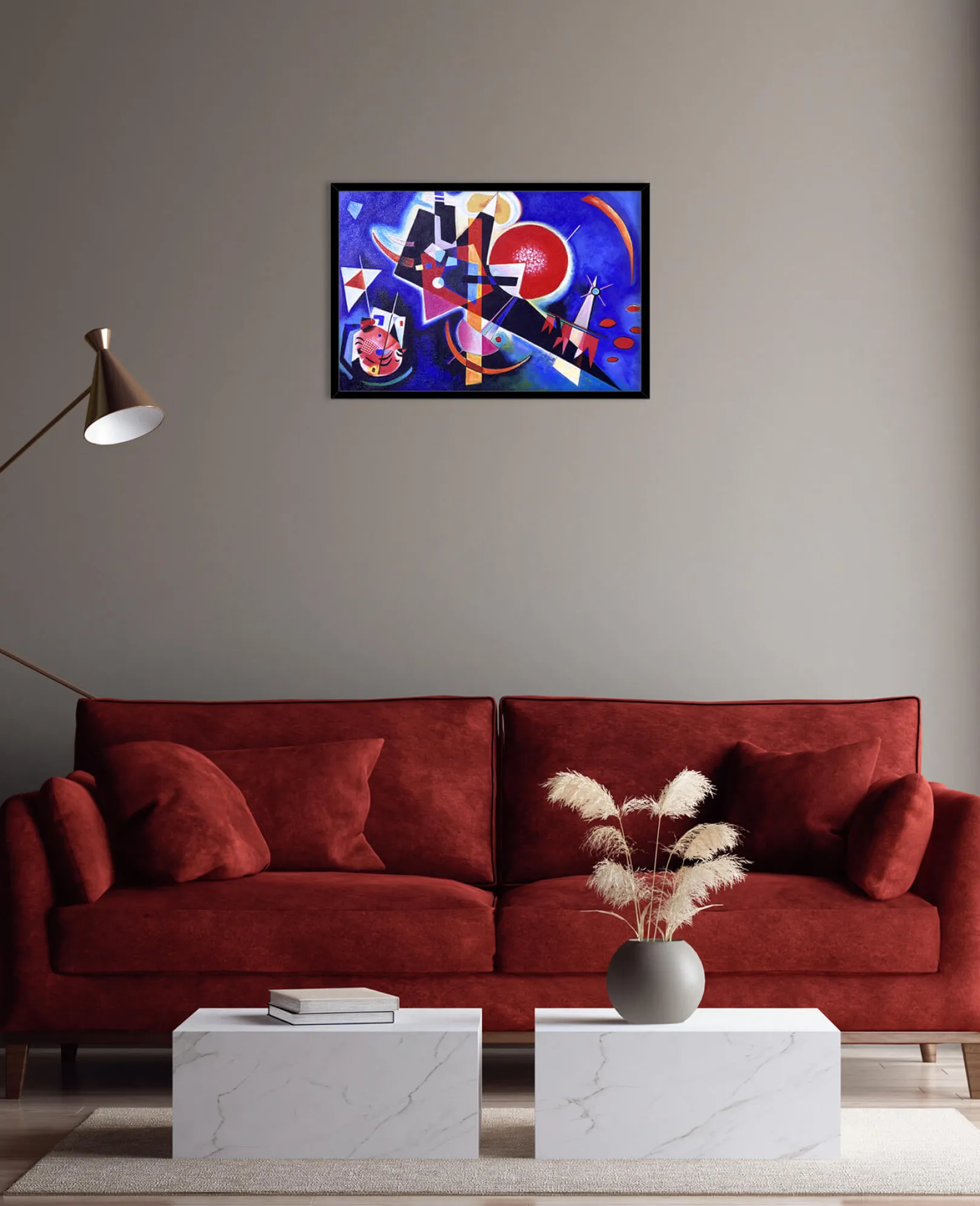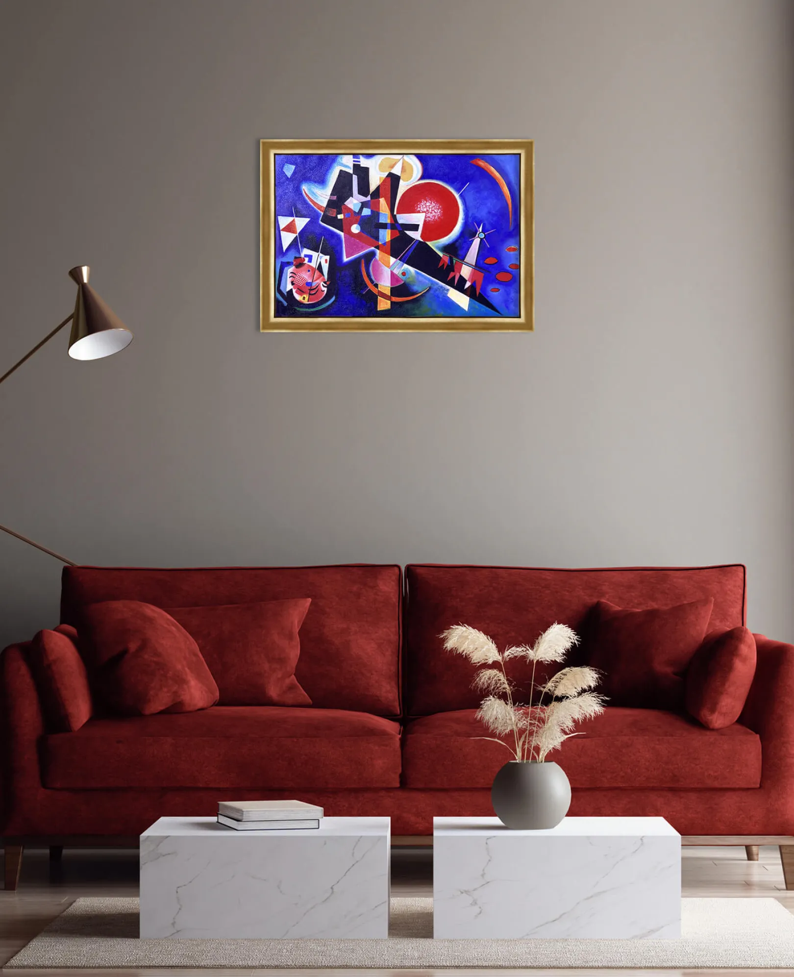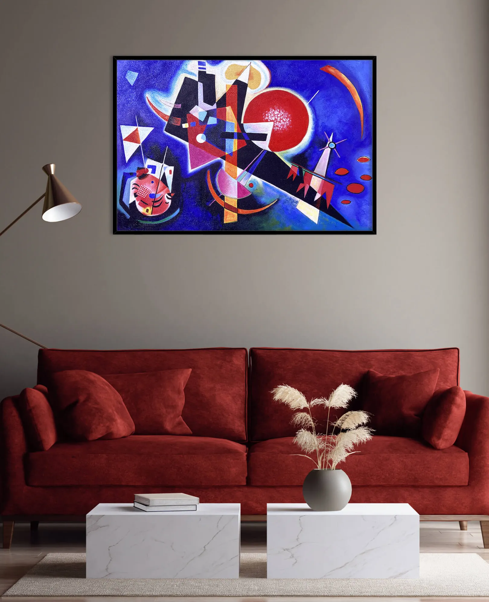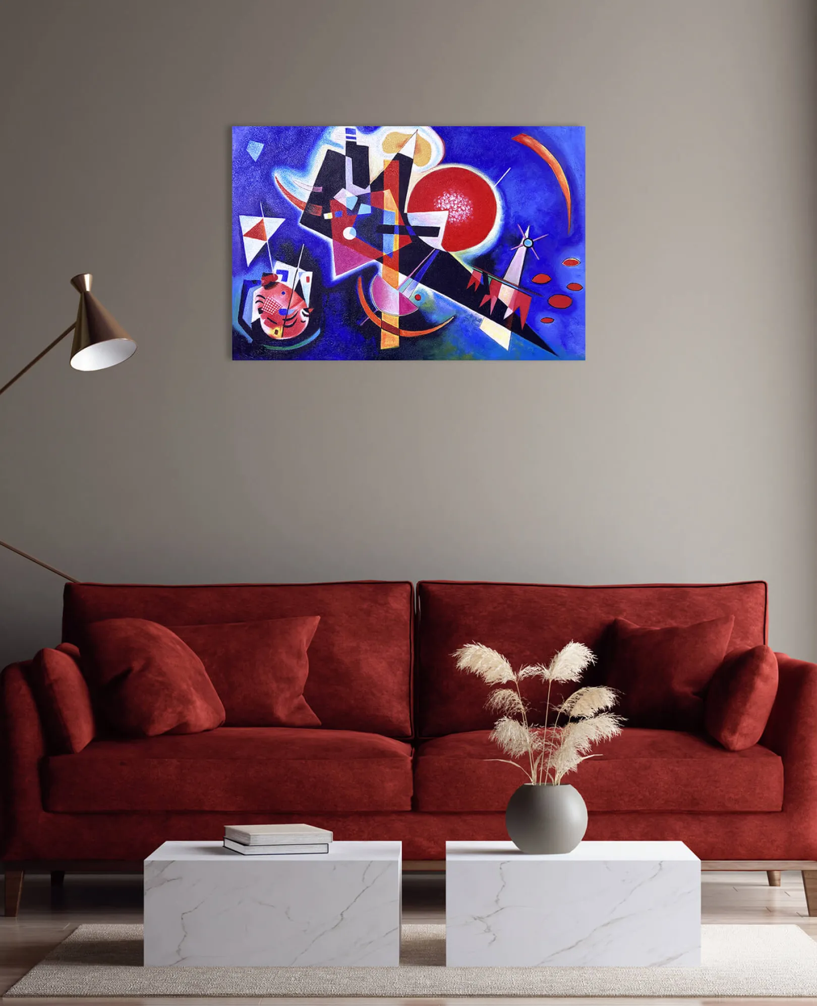 In diesem Werk verwendet Wassily Kandinsky hauptsächlich die Farbe Blau, die seine spirituelle Farbe war. Was jedoch zuerst auffällt, sind die leuchtenden Farben, die den Raum des Bildes erobern, sich dann nach und nach überlagern, auseinanderfallen, sich auflösen und dann zurückkehren, aber gemischt sind, um ein abstraktes Werk zu bilden. Kandinsky dachte gerne, dass „ein Werk zu schaffen, bedeutet, eine Welt zu schaffen“.& Es ist üblich, dass der Künstler seine Werke um eine bestimmte Farbe herum zentriert, wie es auch bei Heavy Red der Fall ist.