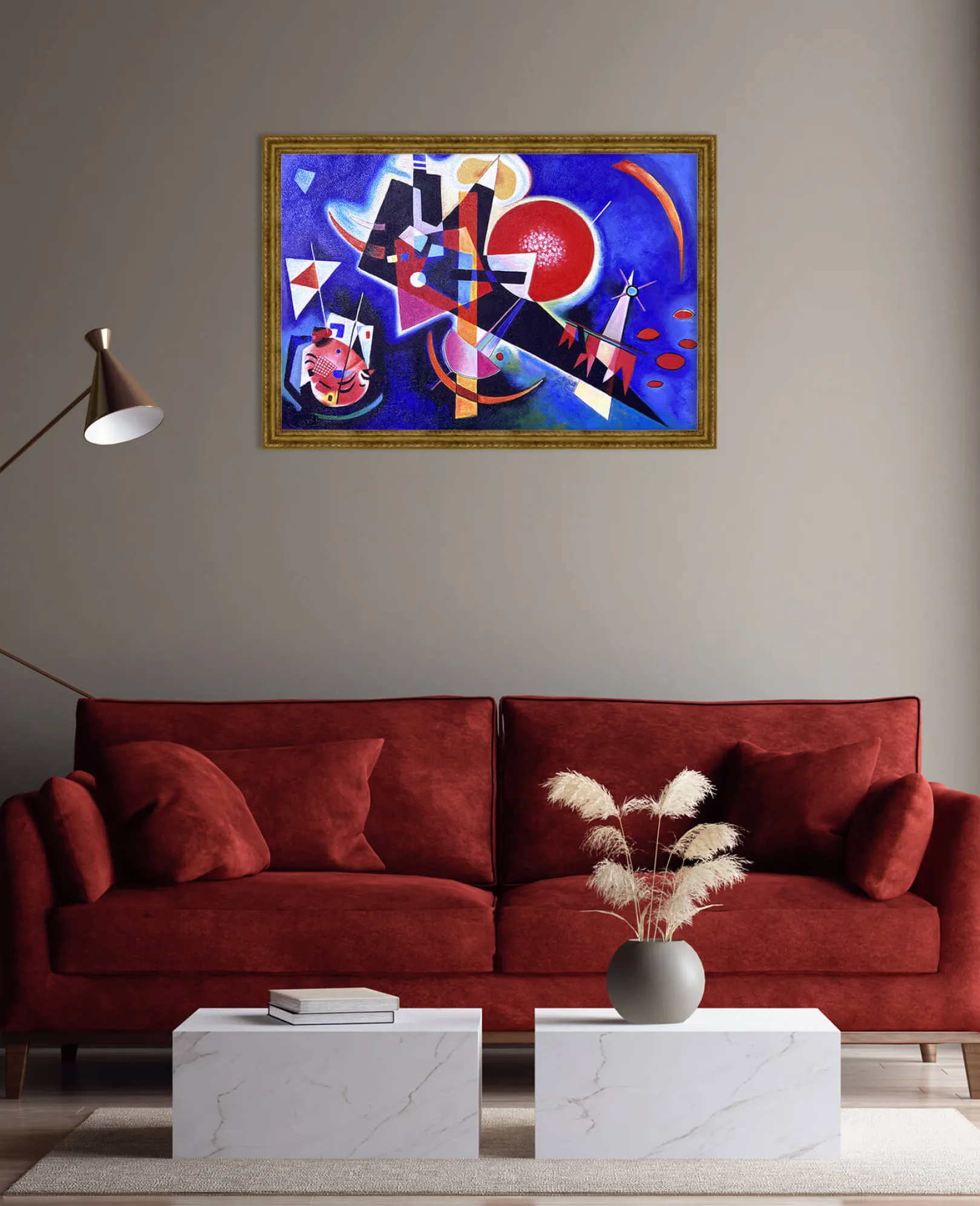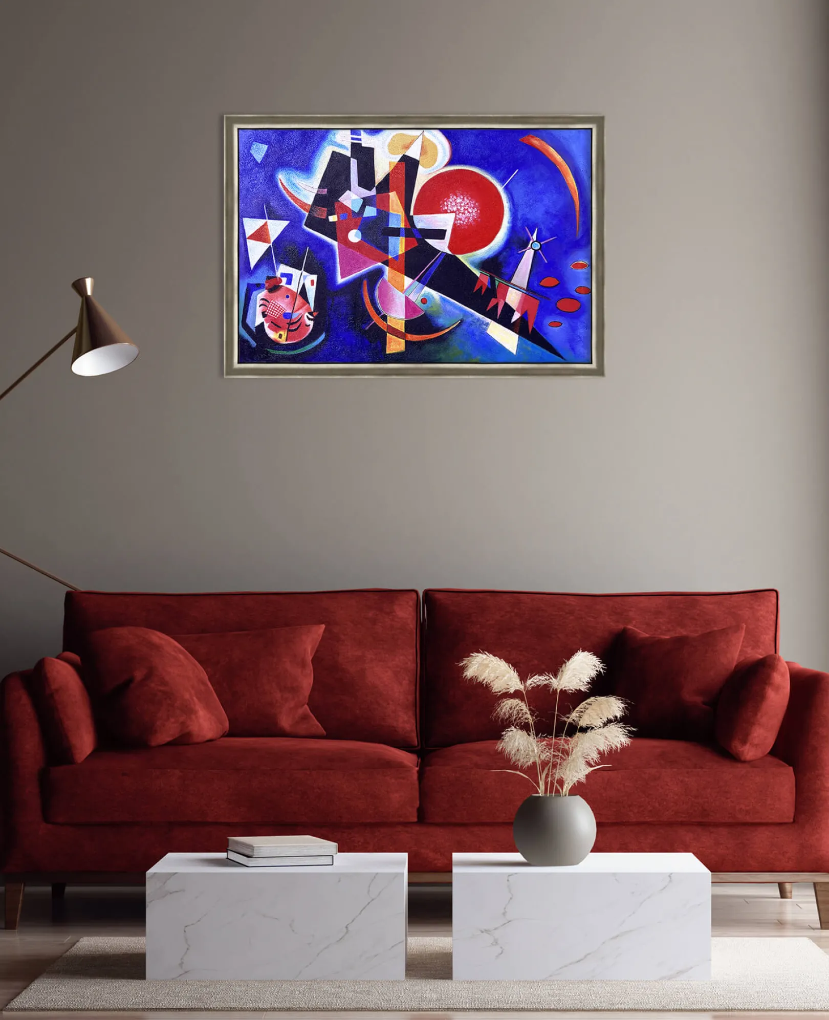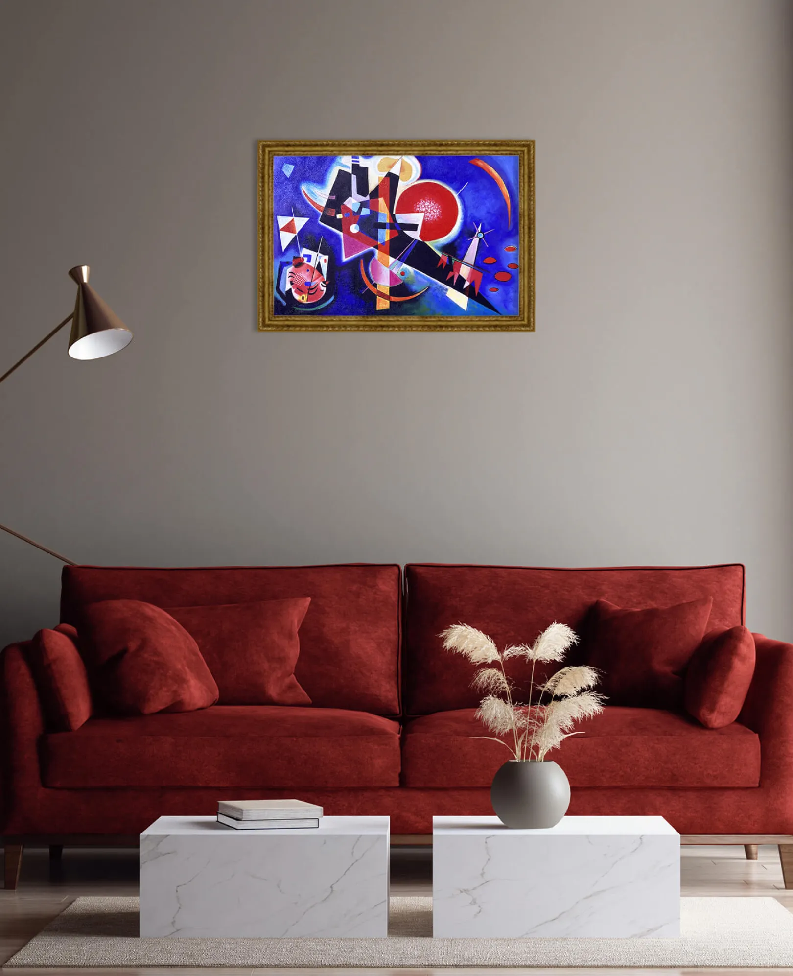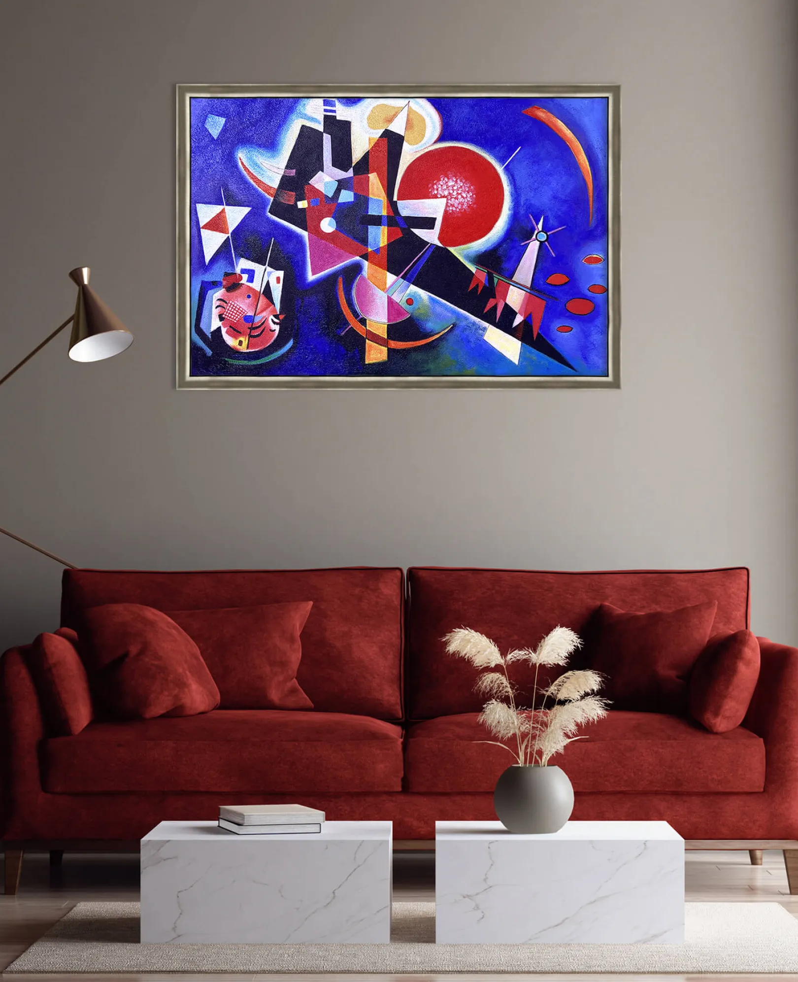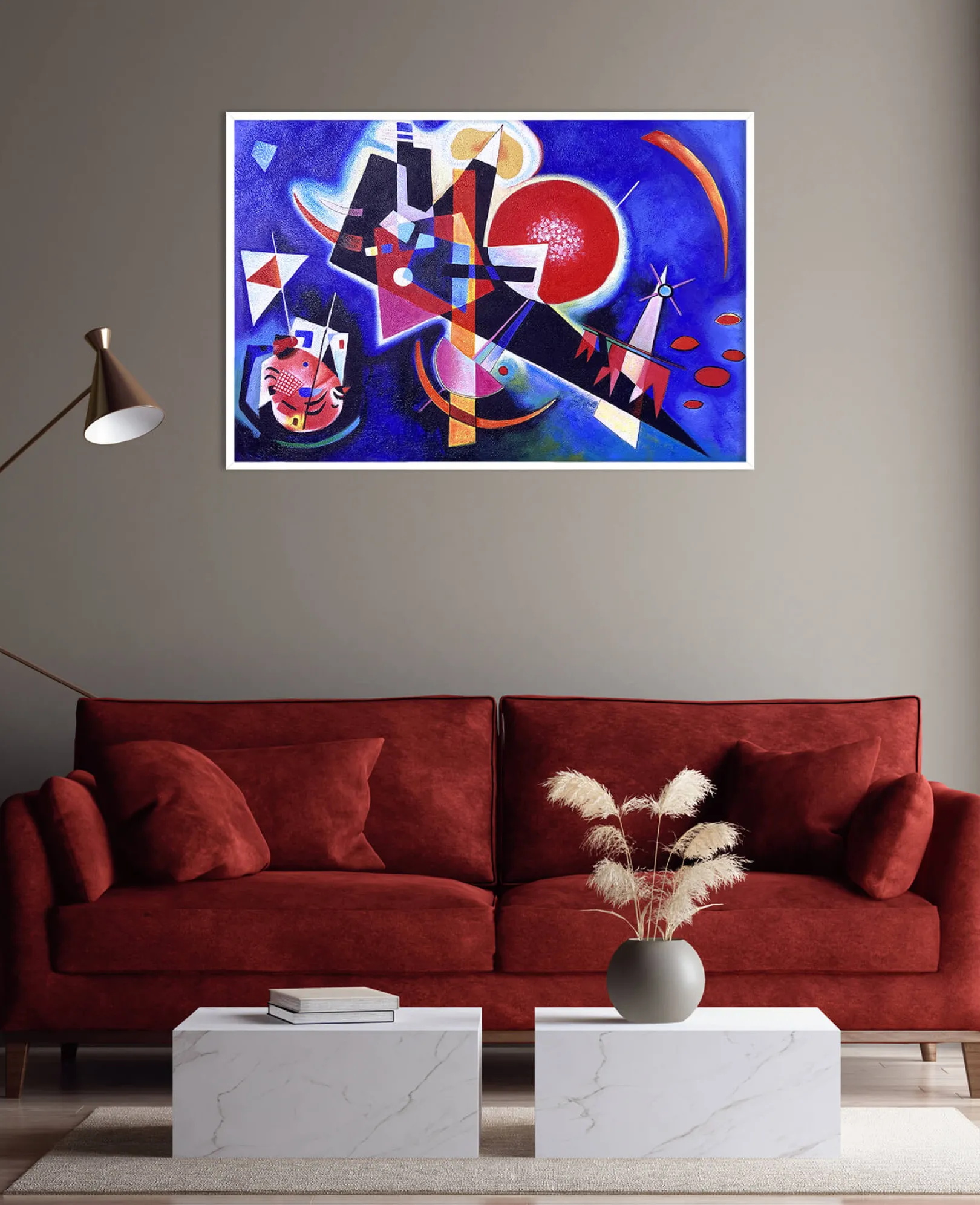 In diesem Werk verwendet Wassily Kandinsky hauptsächlich die Farbe Blau, die seine spirituelle Farbe war. Was jedoch zuerst auffällt, sind die leuchtenden Farben, die den Raum des Bildes erobern, sich dann nach und nach überlagern, auseinanderfallen, sich auflösen und dann zurückkehren, aber gemischt sind, um ein abstraktes Werk zu bilden. Kandinsky dachte gerne, dass „ein Werk zu schaffen, bedeutet, eine Welt zu schaffen“.& Es ist üblich, dass der Künstler seine Werke um eine bestimmte Farbe herum zentriert, wie es auch bei Heavy Red der Fall ist.