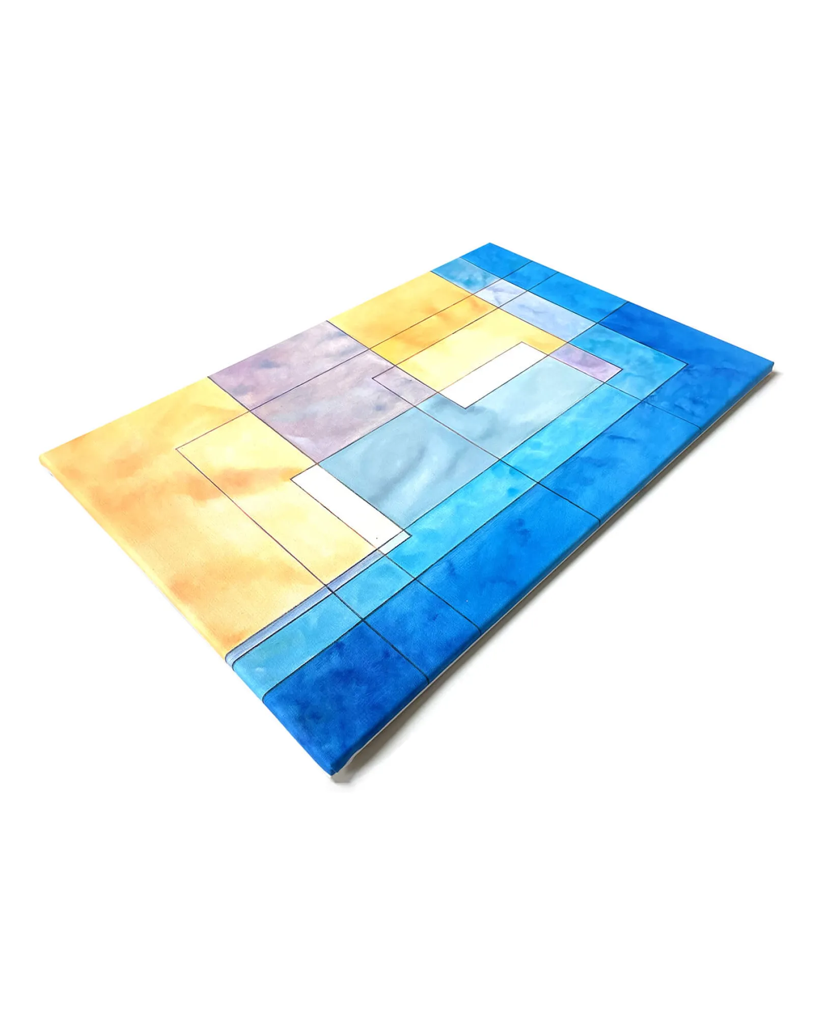 In diesem Werk von Paul Klee kreuzen und überlappen sich rechteckige Blöcke aus Ocker, Rosa und Blau. Ihre transparente Zusammensetzung lässt die verschiedenen Farbschichten schimmern. Die blauen Abschnitte unten und rechts können als Wasserflächen interpretiert werden, die oberen Blöcke als eine abstrakte architektonische Struktur.