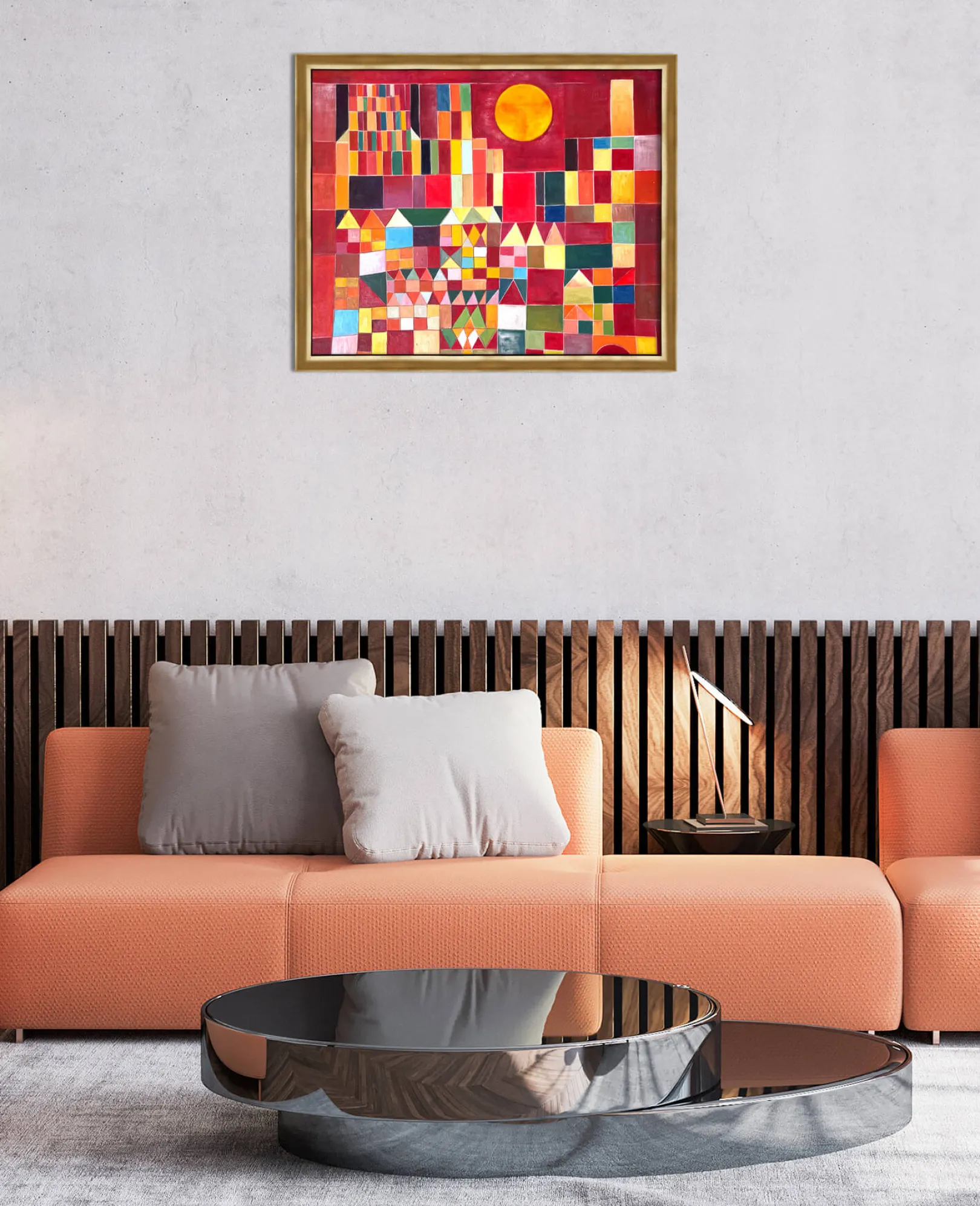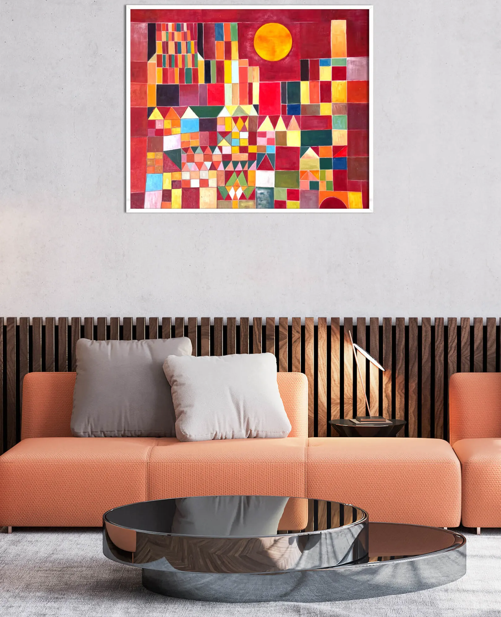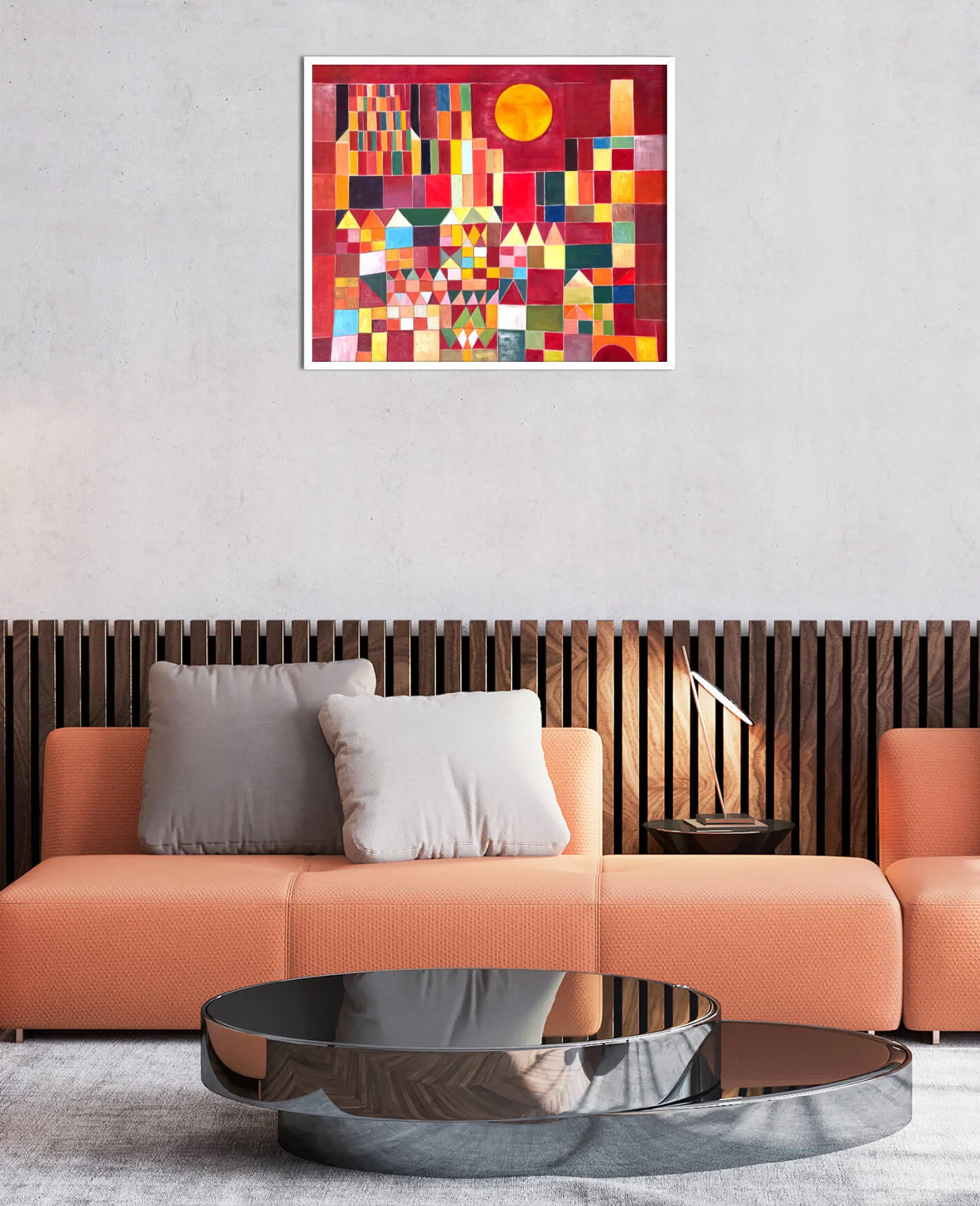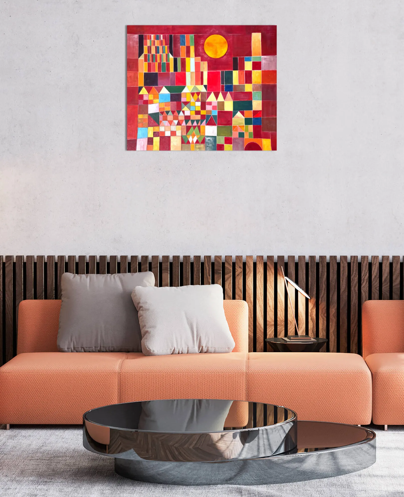 In dem Werk „Schloss und Sonne“ stellt Paul Klee zwei Welten dar: das Gegenständliche und das Abstrakte. Ein musikalischer Rhythmus geht von den kleinen farbigen Kacheln aus. Die harmonisch angeordneten geometrischen Formen hauchen dem Schloss unter der glühenden Sonne Leben ein. Das in warmen Tönen gehaltene Werk ist in mehrere Formen zerlegt, die auf die wissenschaftlichen Entwicklungen in der Farbwahrnehmung verweisen.