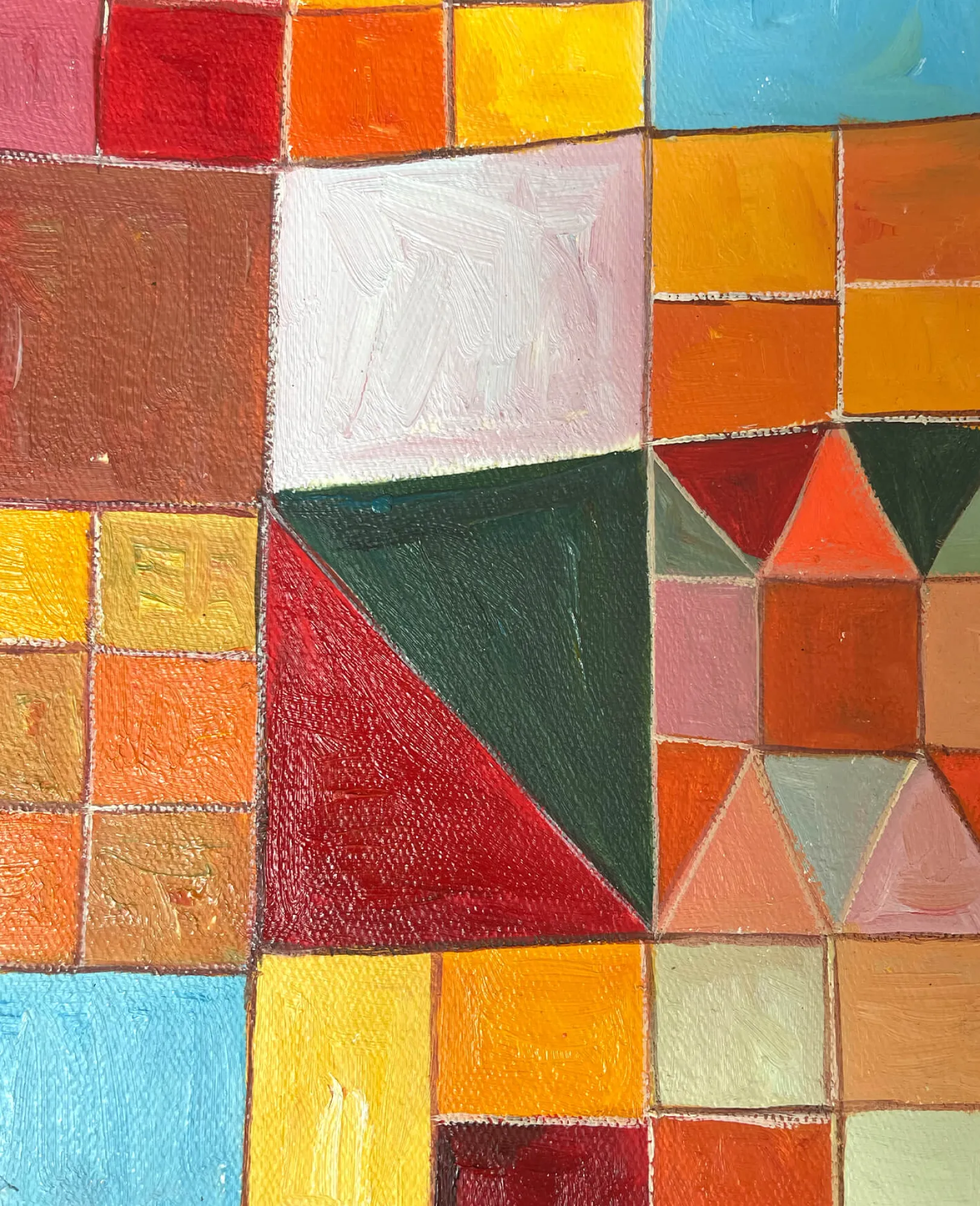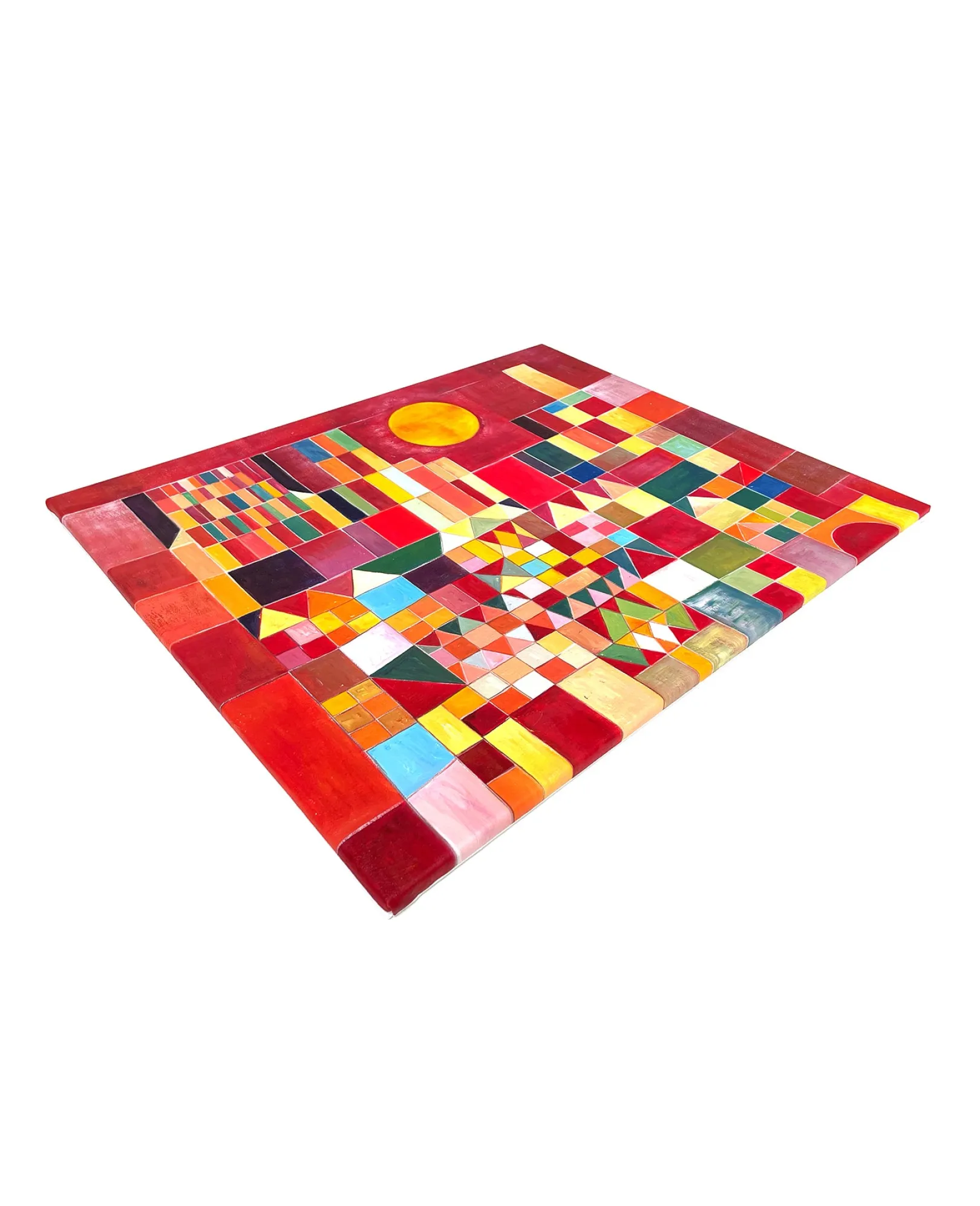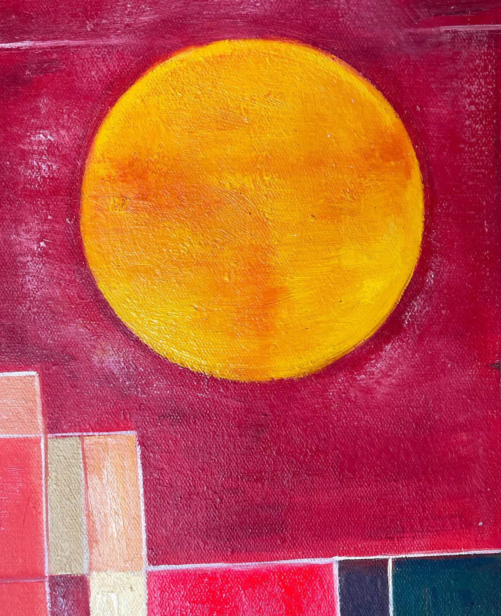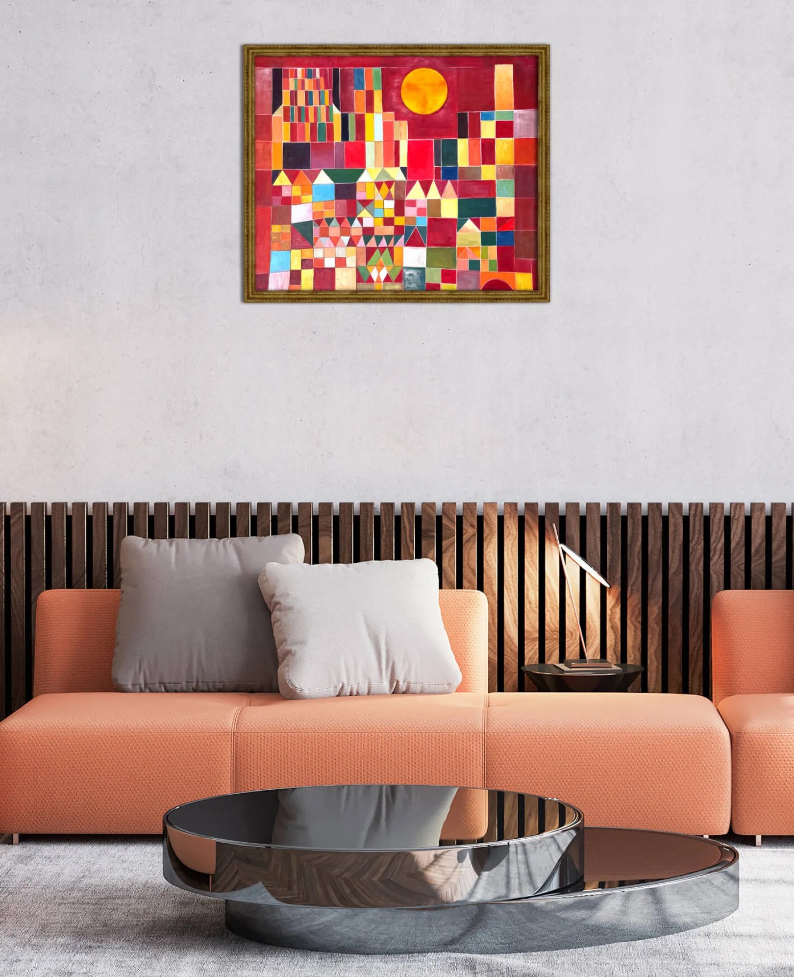 In dem Werk „Schloss und Sonne“ stellt Paul Klee zwei Welten dar: das Gegenständliche und das Abstrakte. Ein musikalischer Rhythmus geht von den kleinen farbigen Kacheln aus. Die harmonisch angeordneten geometrischen Formen hauchen dem Schloss unter der glühenden Sonne Leben ein. Das in warmen Tönen gehaltene Werk ist in mehrere Formen zerlegt, die auf die wissenschaftlichen Entwicklungen in der Farbwahrnehmung verweisen.