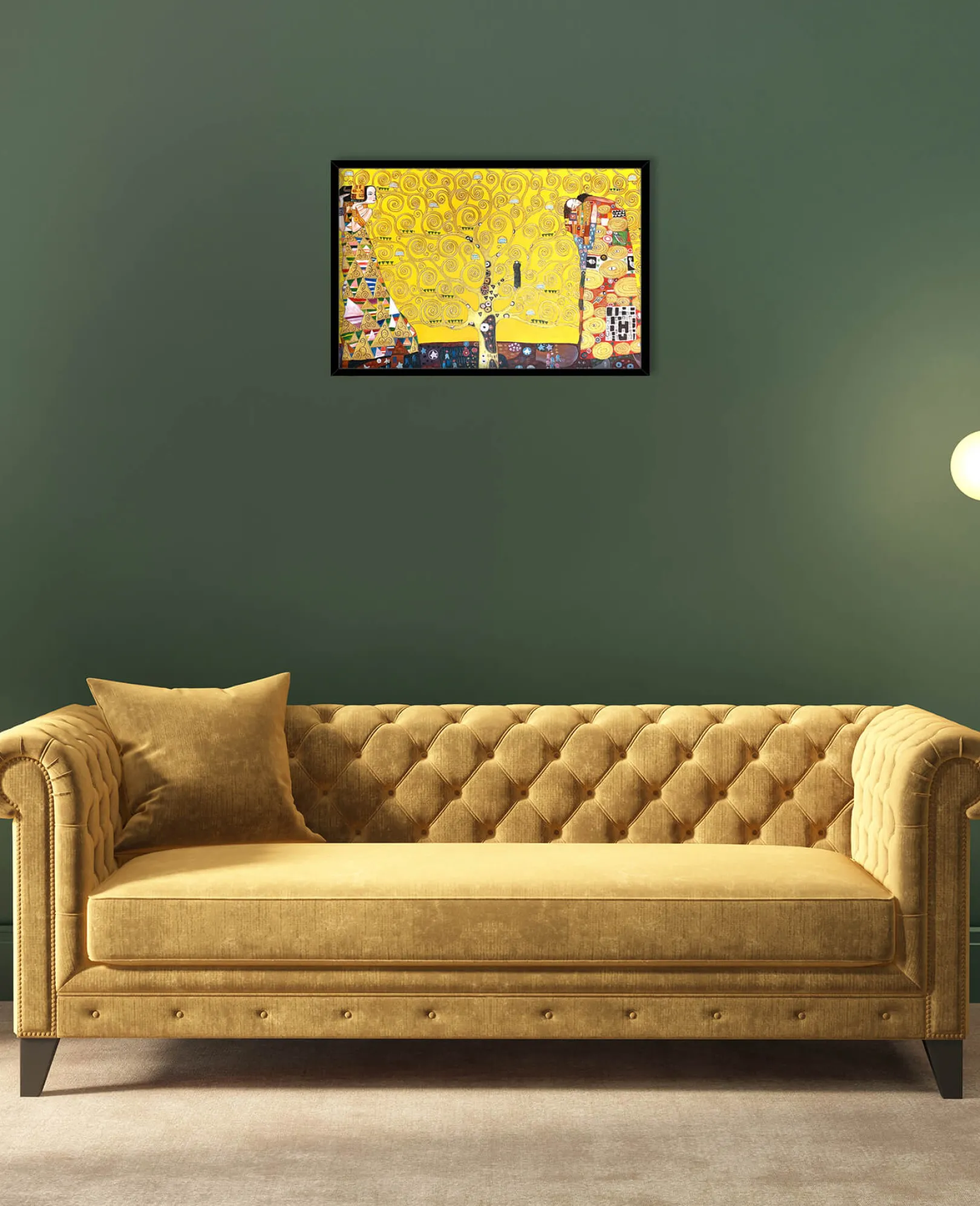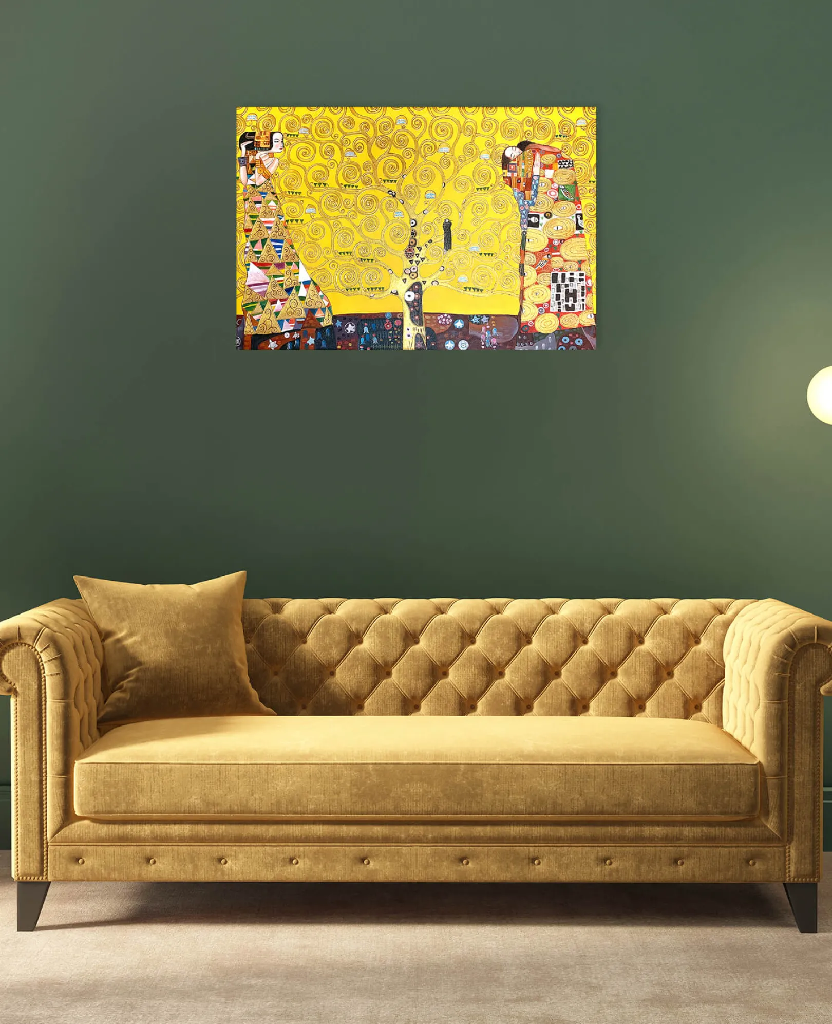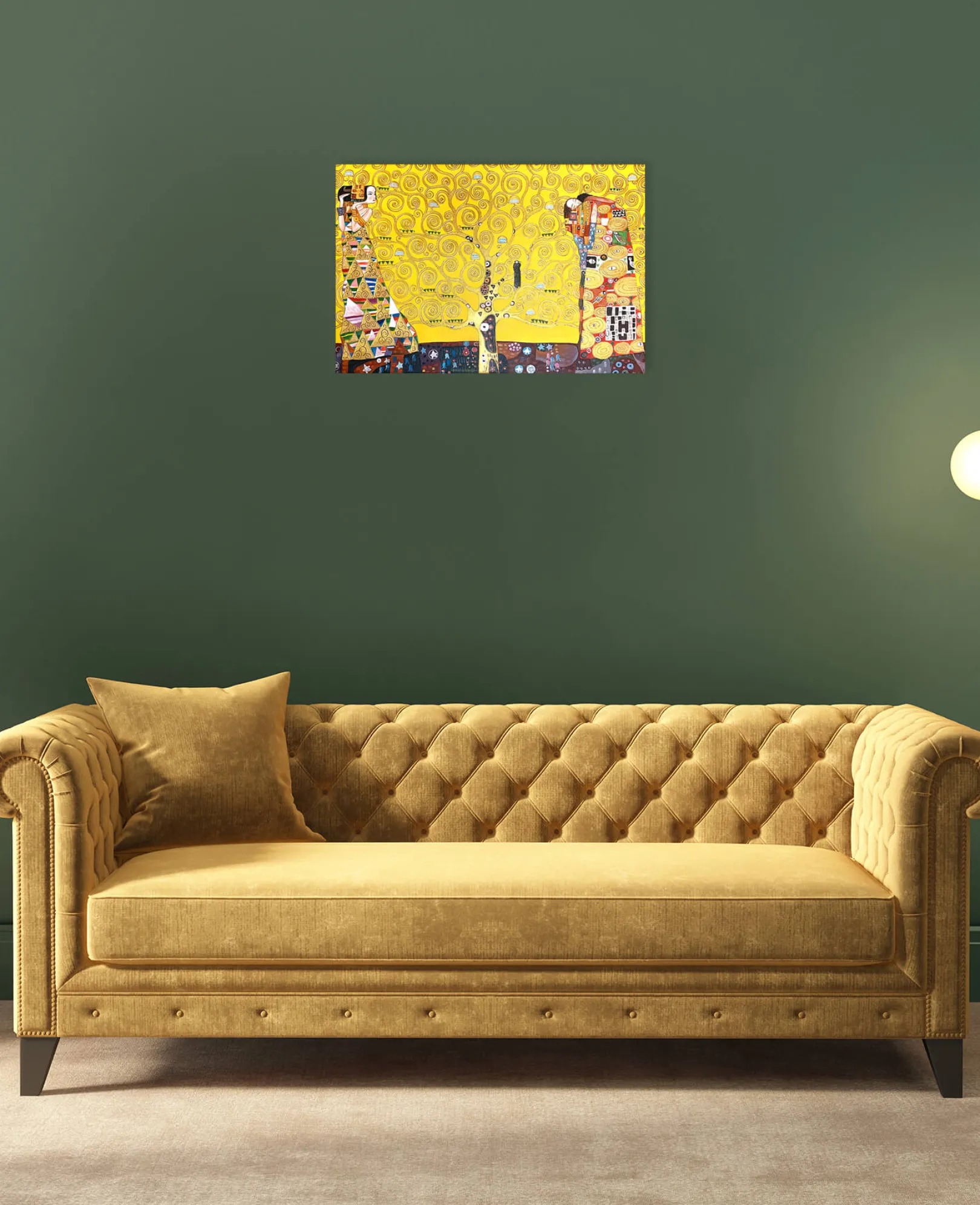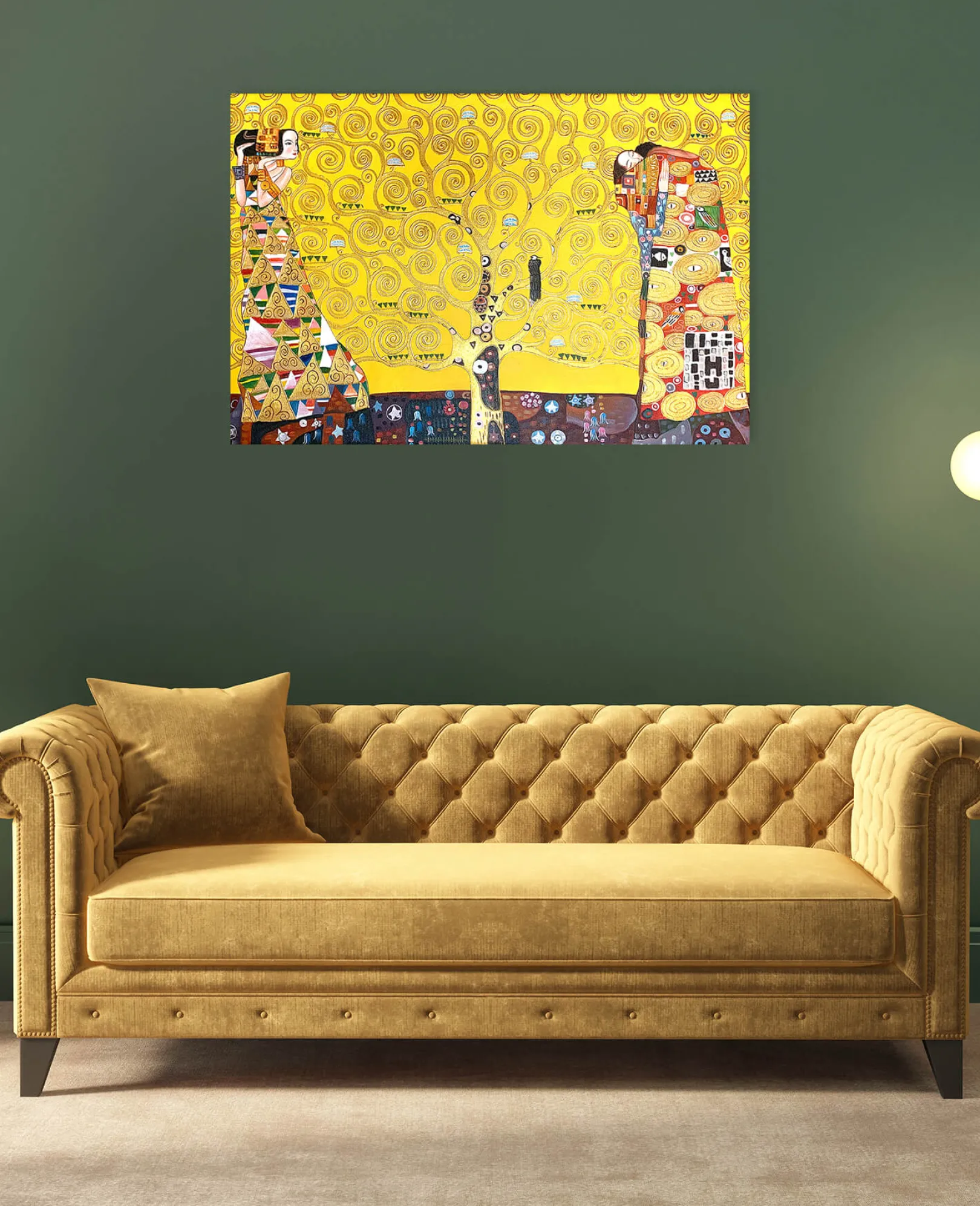 Dieses Gemälde ist ein Wandmosaik von Gustav Klimt, das 1904 von einem belgischen Kunden in Auftrag gegeben wurde. Es ist eigentlich ein Triptychon mit den Titeln „Die Erwartung“, „Der Baum des Lebens“ und „Die Erfüllung“. Es stellt die Komplexität der menschlichen Gefühle dar und soll ein Symbol für die Liebe sein. Das Gelb des Hintergrunds wird vom Künstler häufig in seinen Werken verwendet, wie wir in Der Kuss und Dame mit dem Fächer sehen.