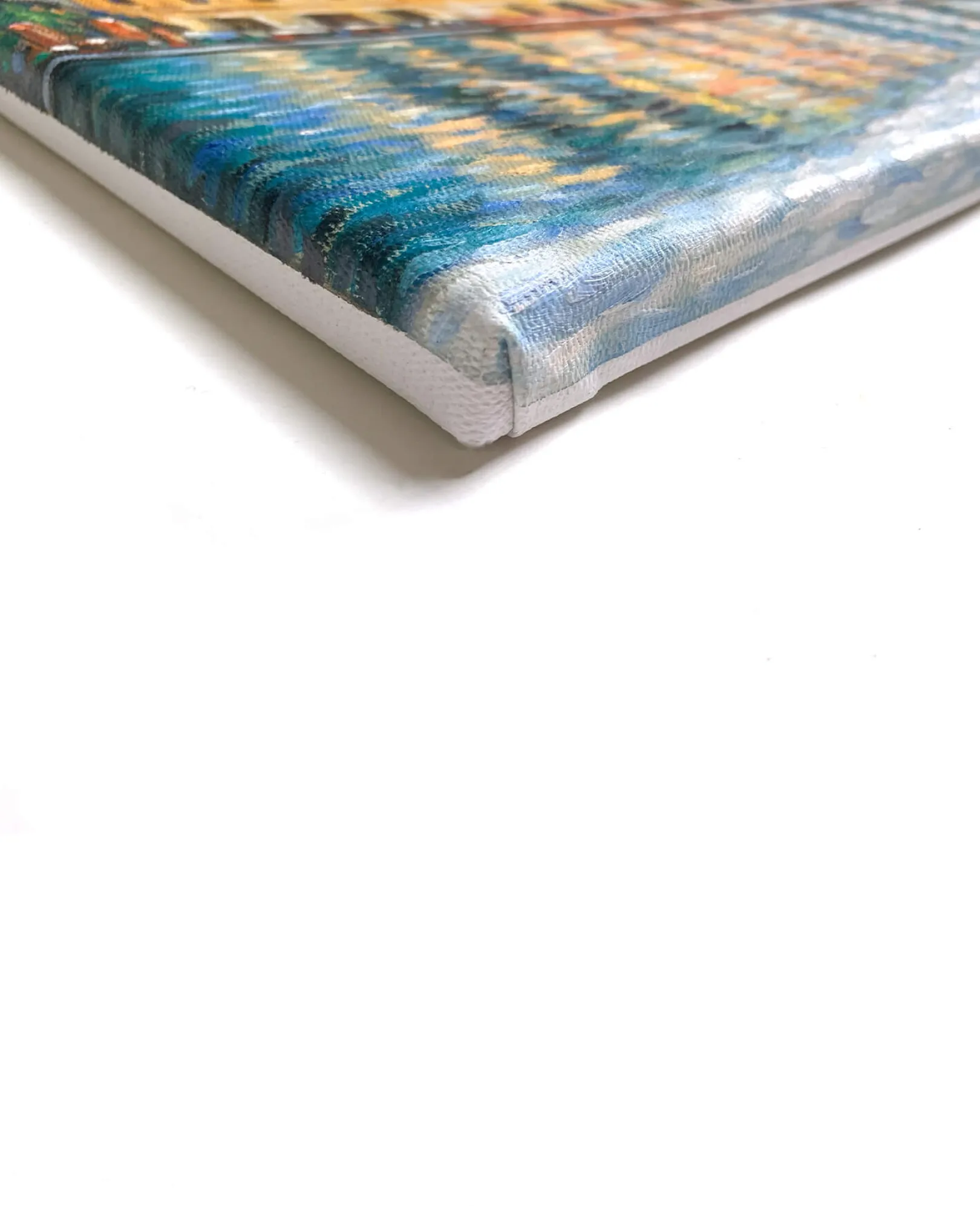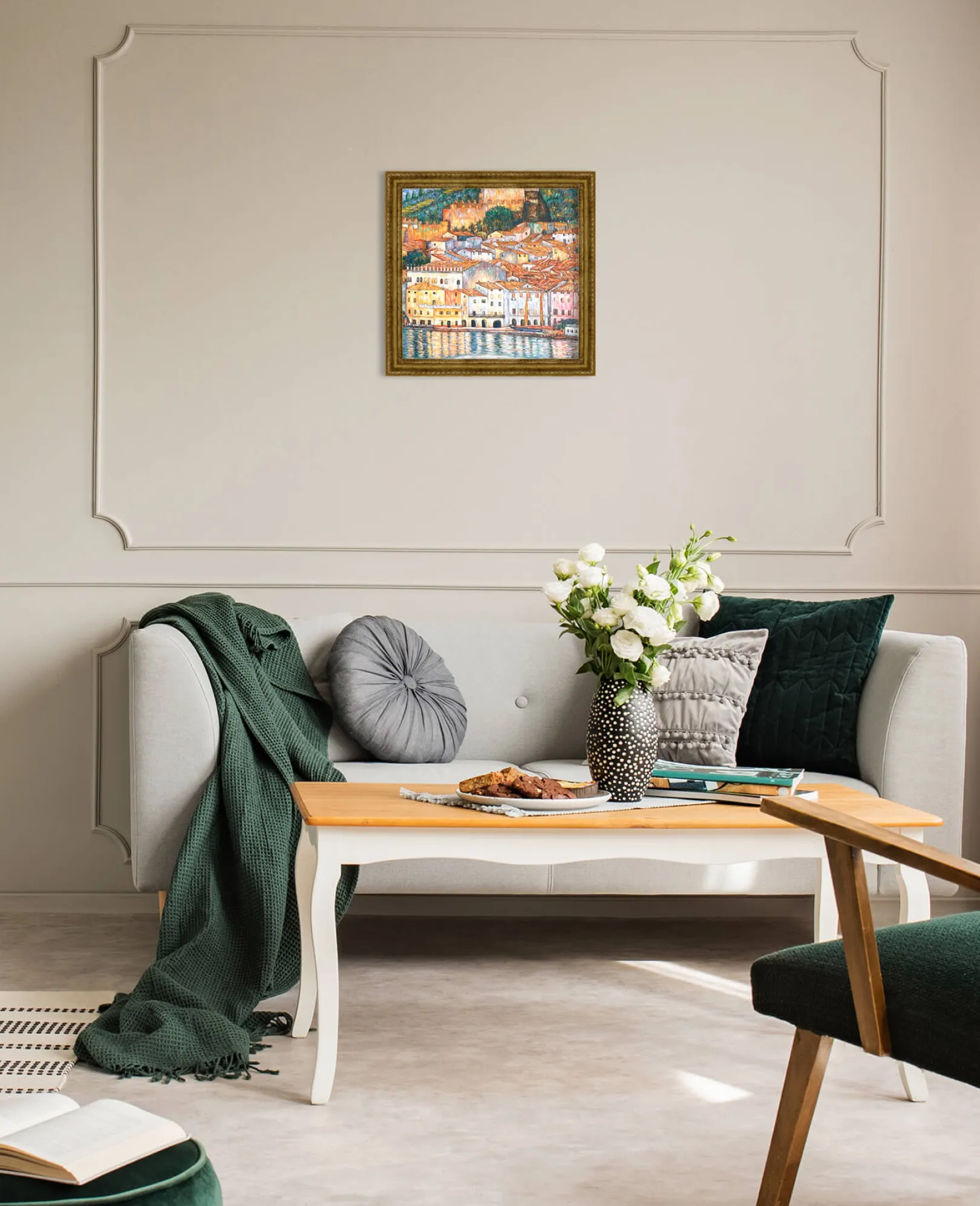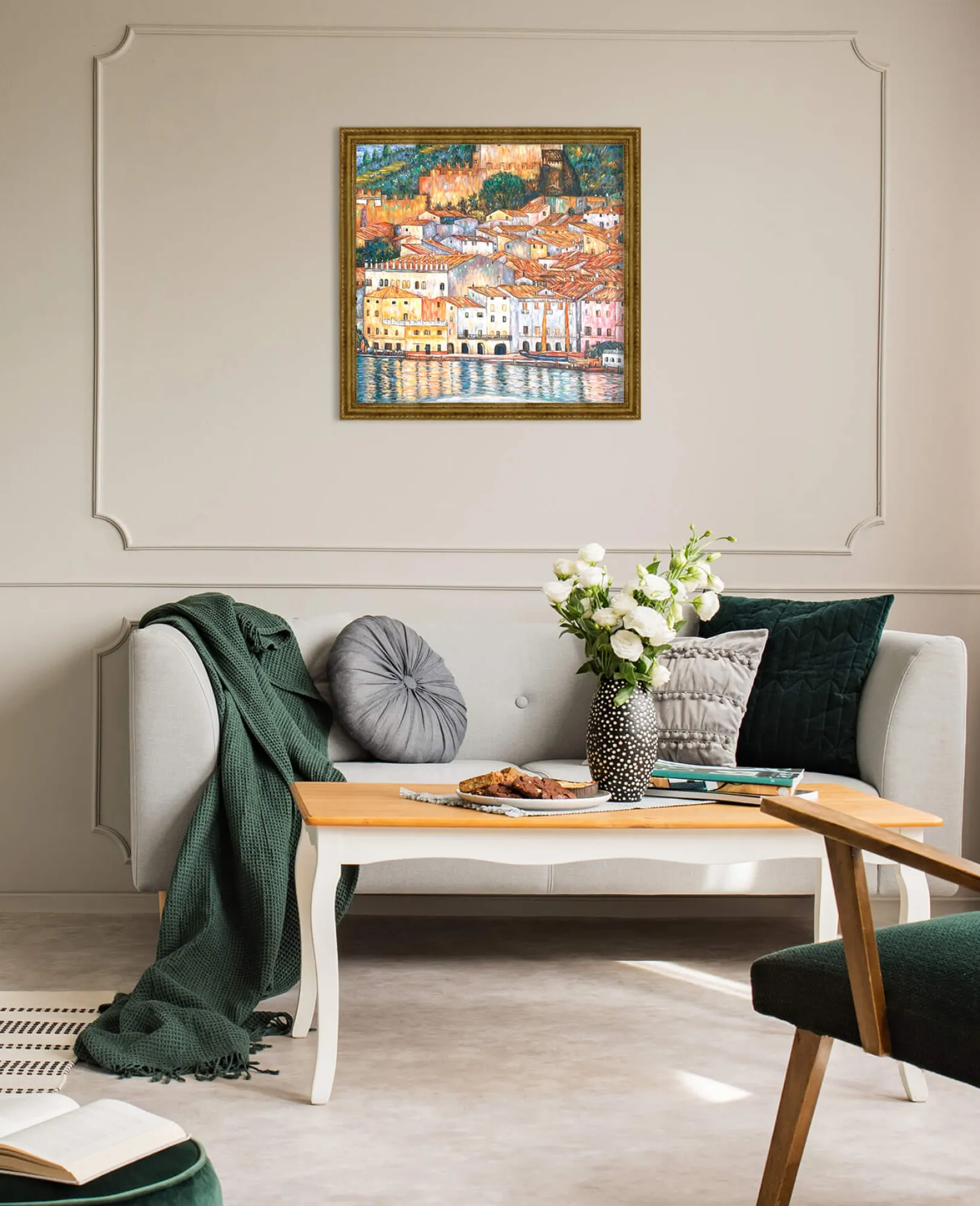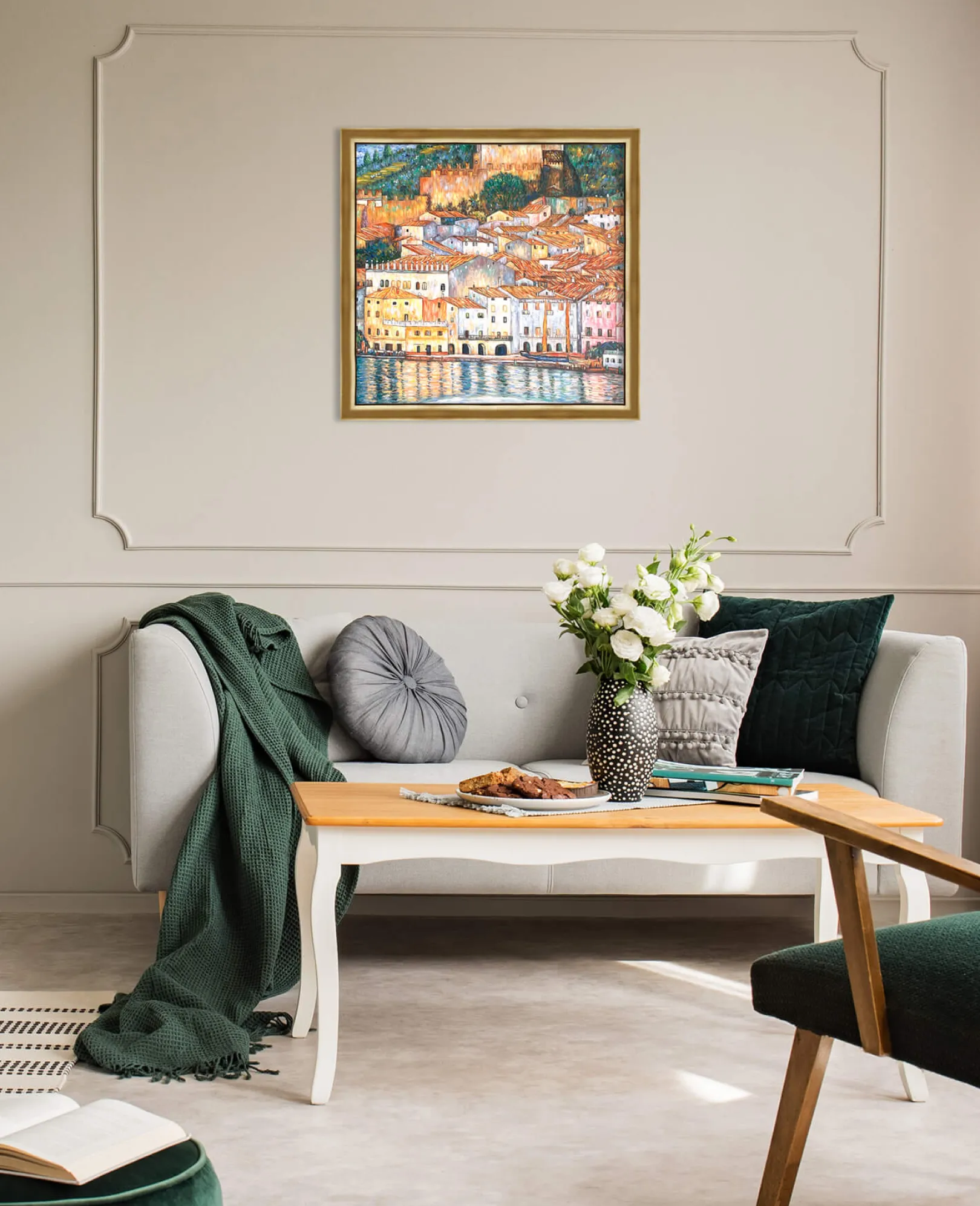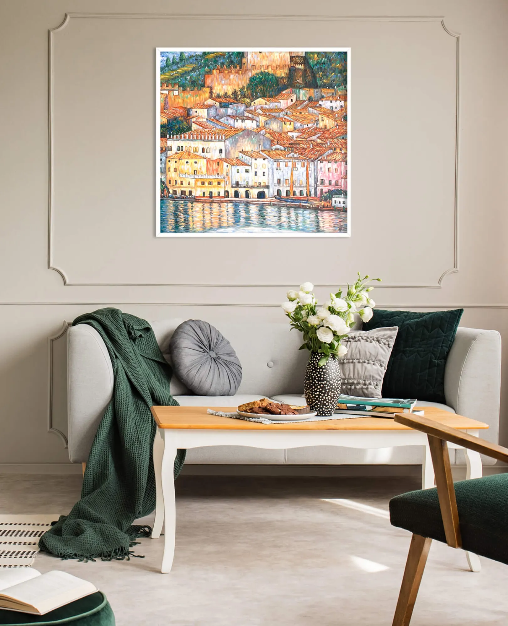 Dieses von Gustav Klimt gemalte Panorama des Gardasees unterscheidet sich von seinen anderen Werken durch seine Leichtigkeit und die einzigartige Beleuchtung. Von einem Boot aus aufgenommen, vermittelt der Künstler eine lebendige und frivole Atmosphäre, die im Gegensatz zu den emotionsgeladenen Häusern steht. Dieses einzigartige Werk wurde beim Brand von Schloss Immendorf zerstört. Es handelt sich um eine der Landschaften, die der Künstler malt, zusammen mit auch der Kirche von Cassone.