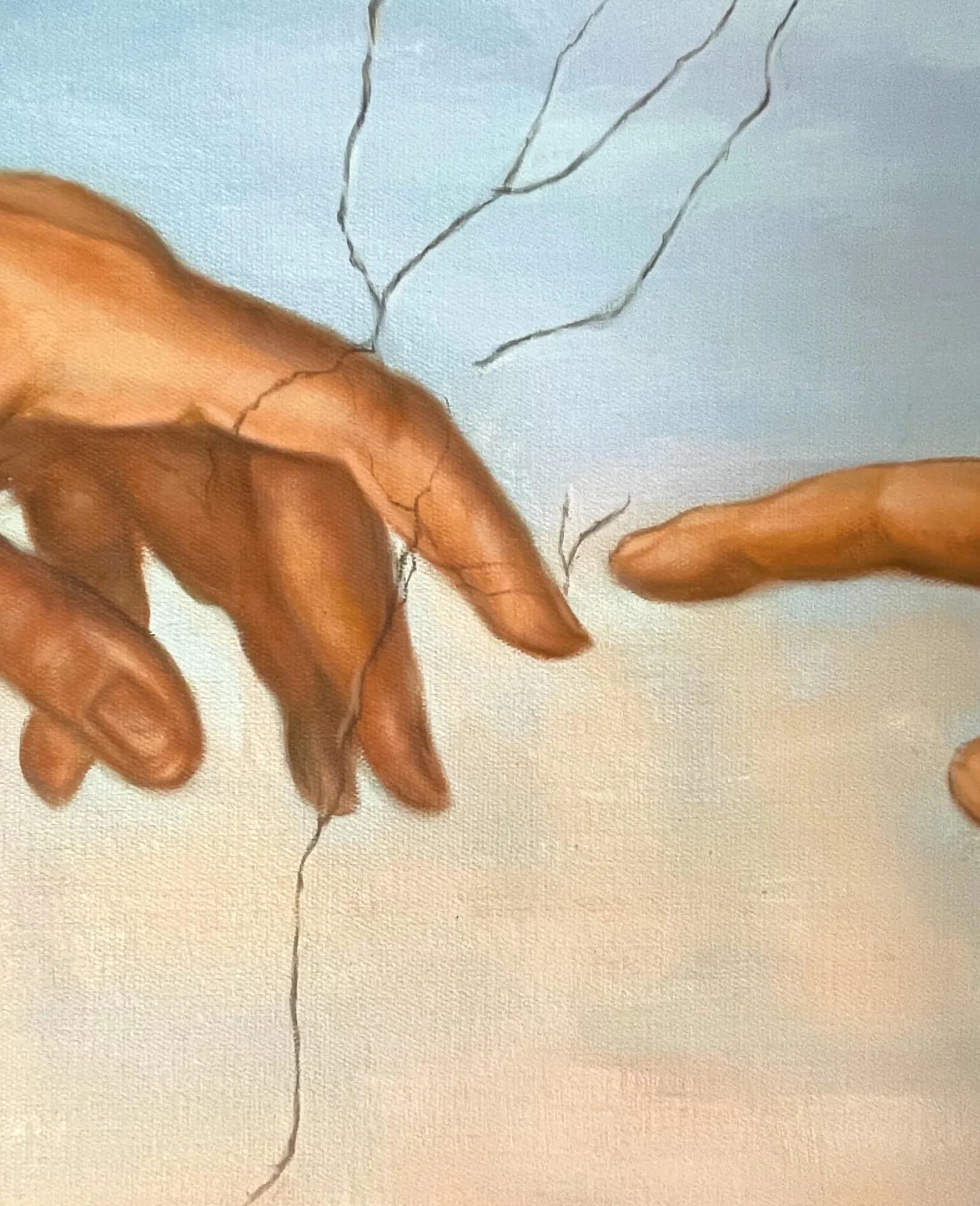 Dies ist das emblematische Detail des Werks von Michelangelo. Diese relative Symmetrie erinnert daran, dass der Mensch nach dem Bild Gottes geschaffen wurde. Adams Zeigefinger auf der linken Seite und Gottes Zeigefinger auf der rechten Seite nähern sich einander an, bleiben aber durch eine kurze Distanz getrennt, was darauf hindeutet, dass sie die Trennung zwischen Gott und Adam materialisiert. Tatsächlich streckt sich ihr rechter Arm nach dem Menschen aus, um den Lebensfunken zu geben.& Das Werk ist in seiner Gesamtheit in Die Erschaffung Adams zu sehen.