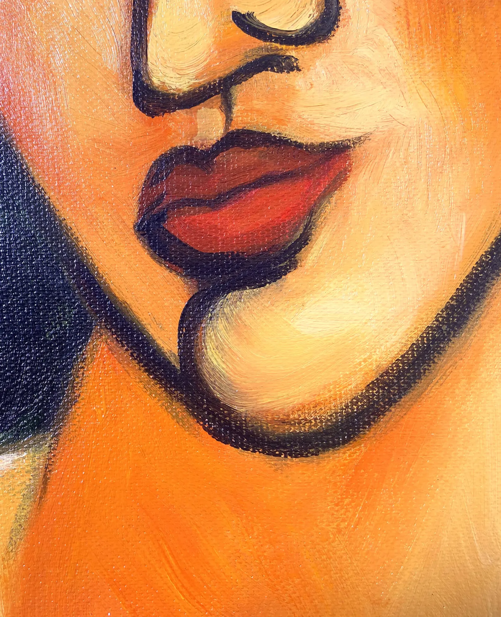 Das Ganze vermittelt einen Eindruck von Melancholie, von eleganter und zerbrechlicher Schönheit. Die Zerbrechlichkeit ist eines der Merkmale des Stils von Amedeo Modigliani: Die Gesichter ähneln Masken, in denen die Formen gedehnt sind. Der Künstler schuf so einen originellen, einzigartigen Stil, der von der Welt und den Realitäten abgeschnitten war und sich hauptsächlich auf eine skulpturale Herangehensweise an die Figuren konzentrierte.& Die große rote Büste ist ebenfalls ein Beispiel für diesen Stil.