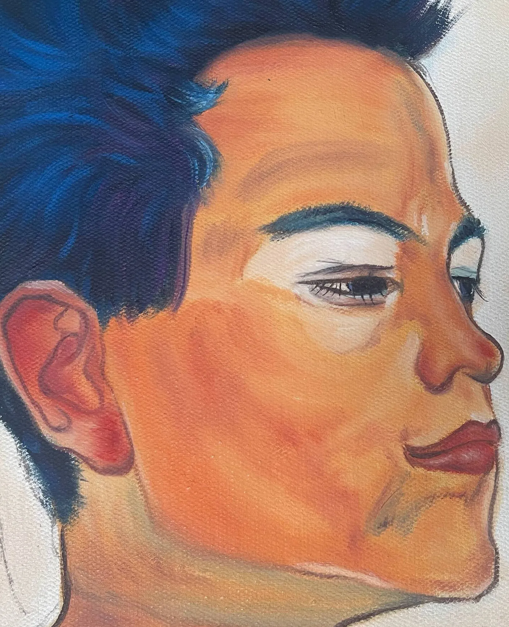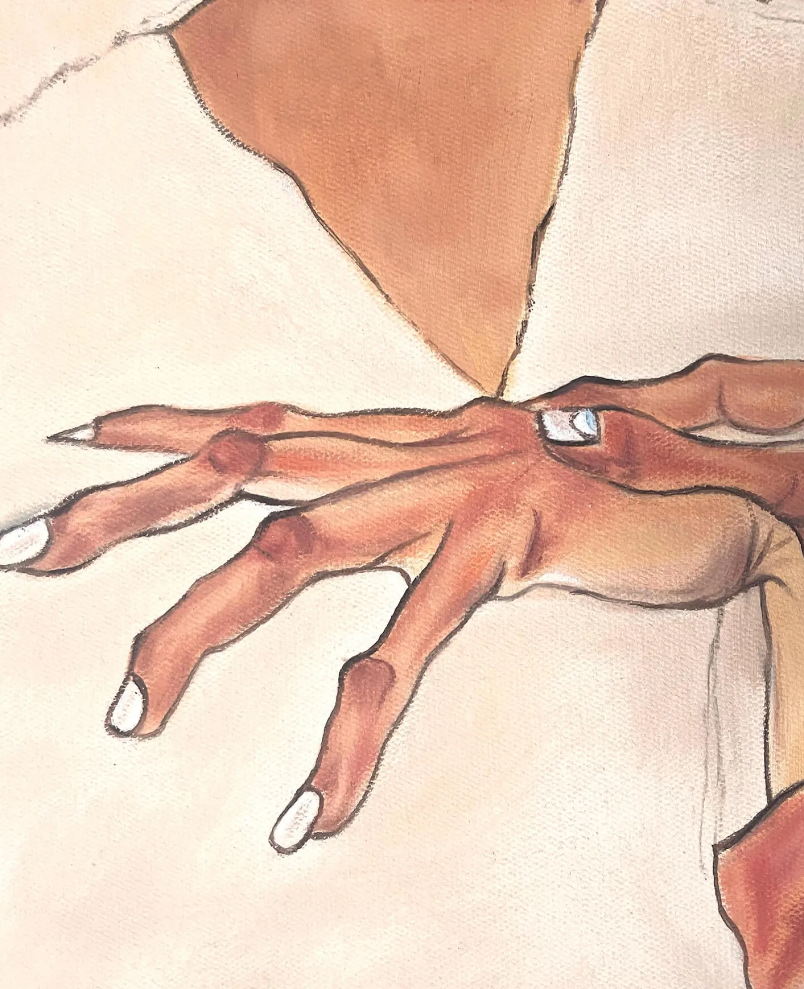 Dieses mit Aquarell und Kohle gemalte Selbstporträt von Egon Schiele legt den Schwerpunkt auf seinen Kopf und seine Hände. Der Rest seines Körpers ist nur eine Skizze ohne Details. Der Künstler, der sehr zur Selbstbeobachtung und zur Suche nach seinem innersten Selbst neigt, stellt sich ohne Tabus dar, so wie er sich selbst sieht, mit einer gewissen Weiblichkeit in der Position seiner Hände. Sein lässiger, ja sogar unverschämter Gesichtsausdruck scheint seine Gleichgültigkeit gegenüber den Urteilen, die man über ihn fällen könnte, zu zeigen.