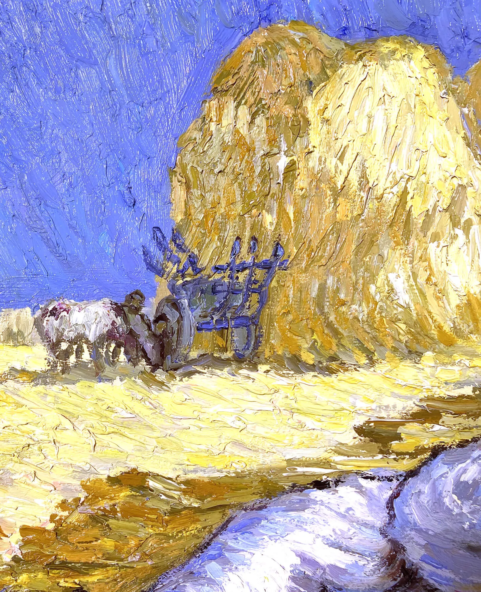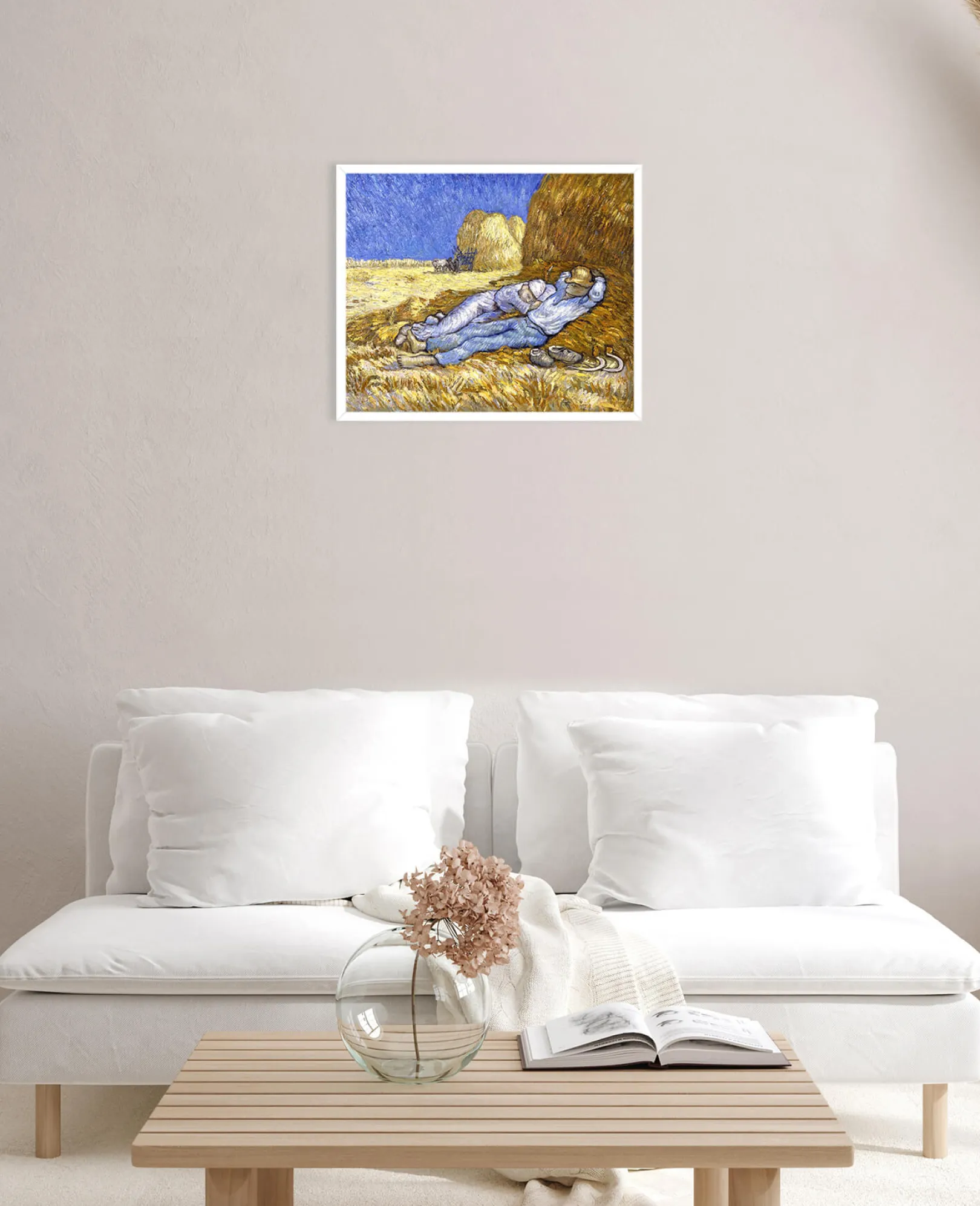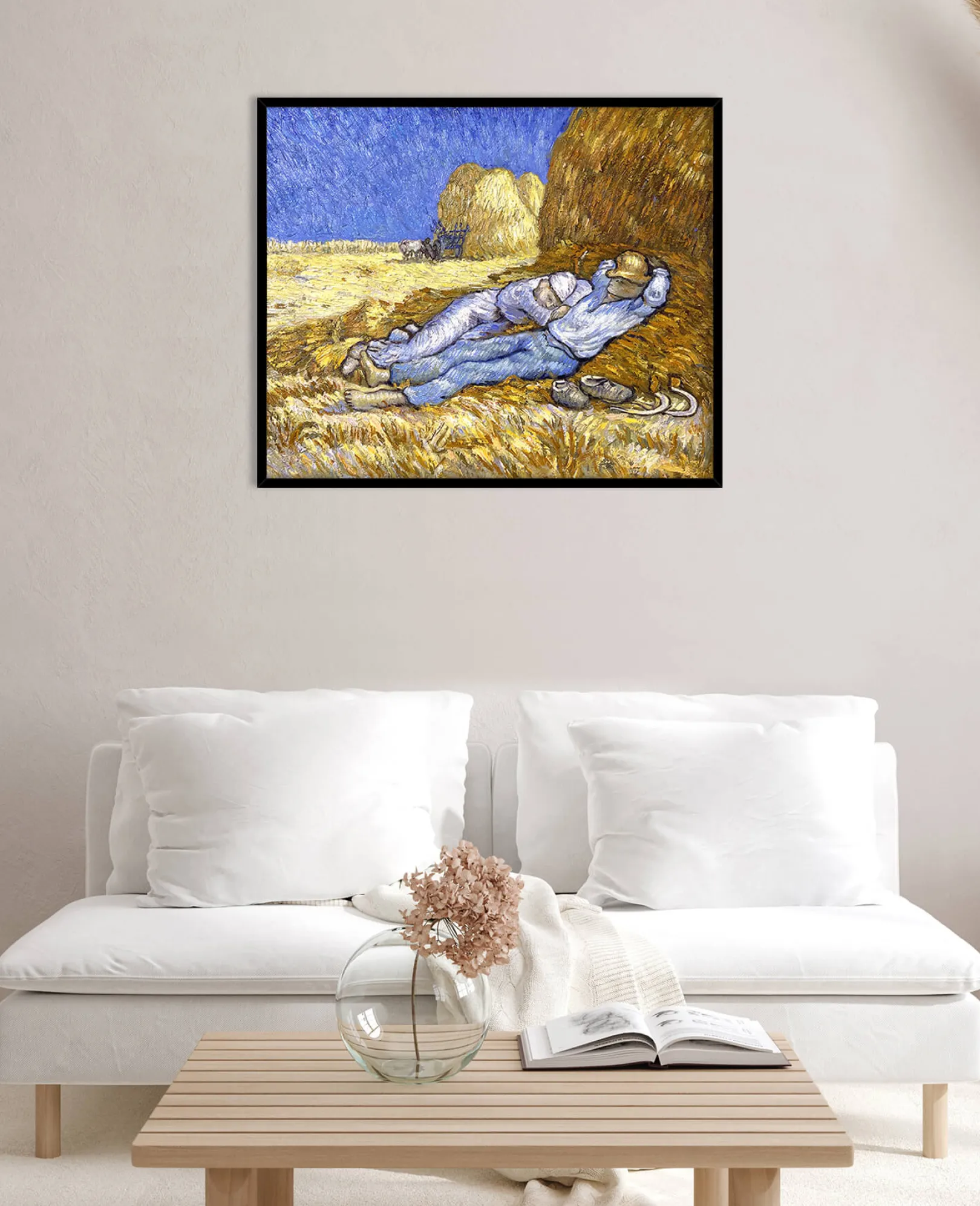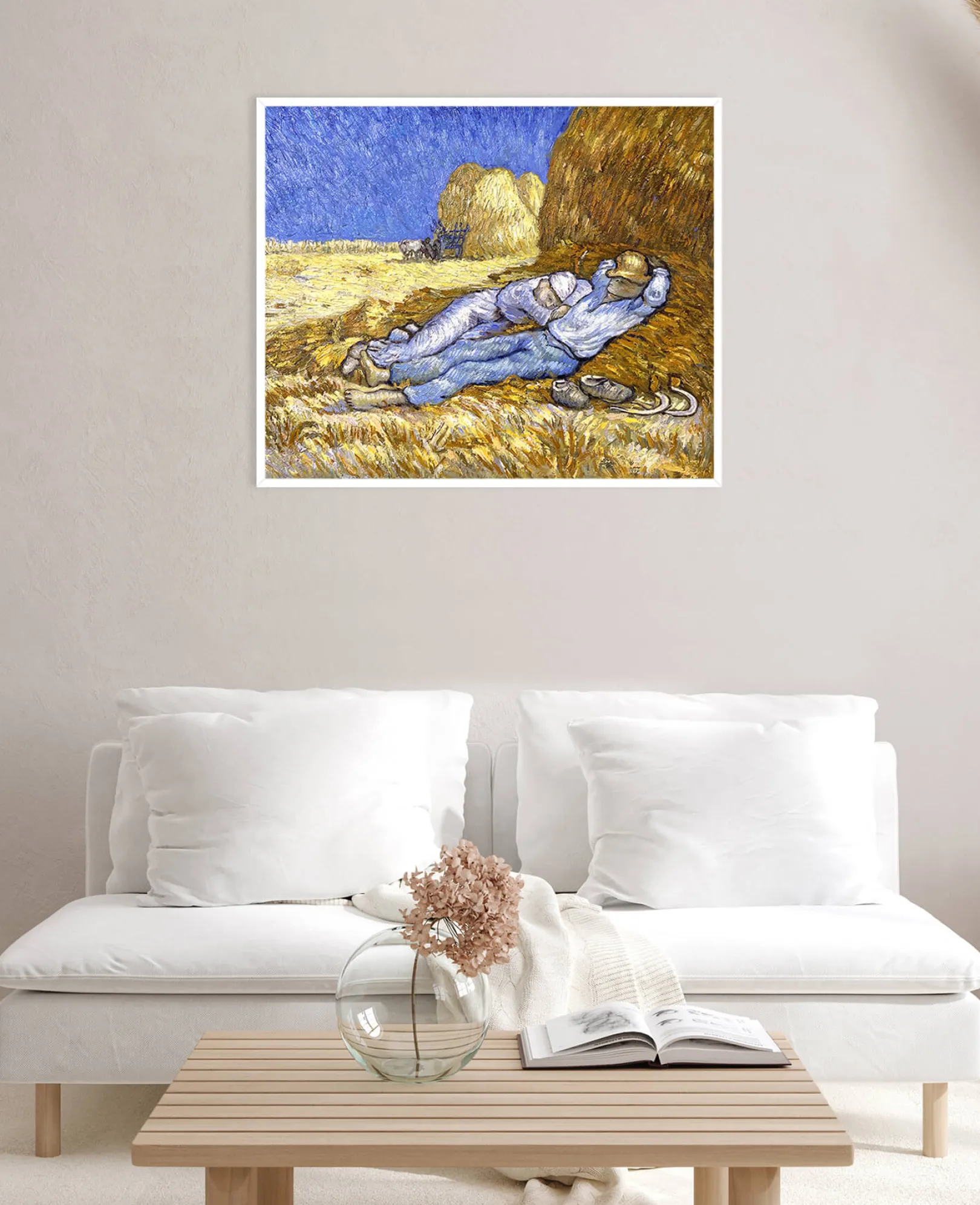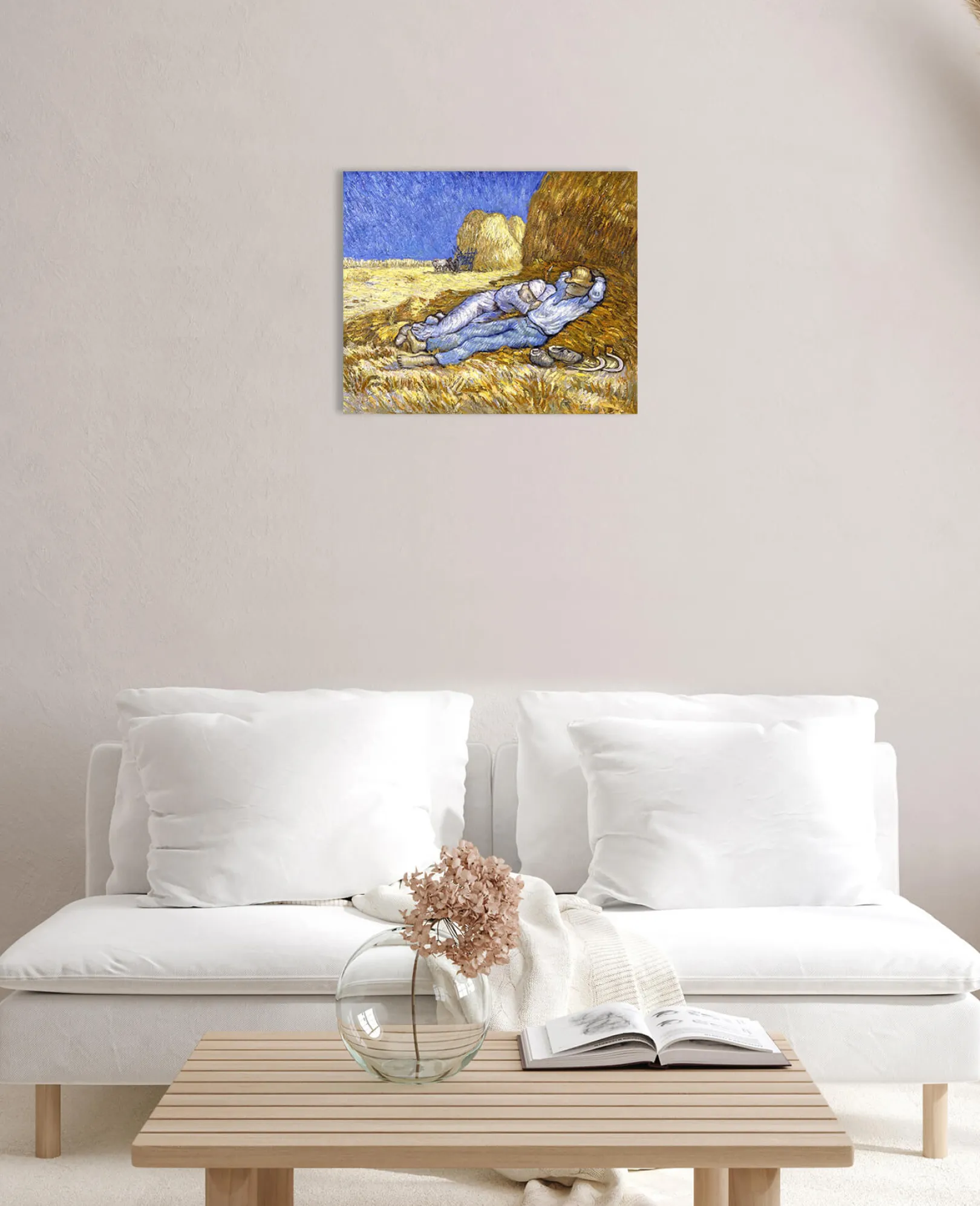 Die Komposition wurde von einer Zeichnung des Künstlers Jean-François Millet übernommen. Diese persönliche und beruhigende Übertragung von Vincent Van Gogh erfolgt hauptsächlich durch eine Farbkonstruktion, die auf dem Kontrast der Farben beruht und es ermöglicht, die konstante Intensität, die von seinen Werken ausgeht, wiederzufinden.& Farben, die wir oft in den Bildern des Künstlers wiederfinden, wie z. B.& Weizenfeld mit Krähen und Weizenfeld hinter dem Hospiz Saint-Paul mit einem Mäher.
